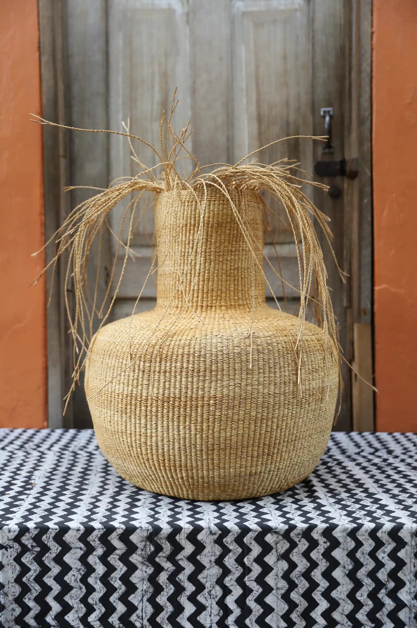 The weavers call it Tisanie Tia—the Strange Tree Basket. Inspired by the gnarled trees of the Sahel that twist and bend in dry heat and healing harvests, this sculptural form carries the spirit of the land. Bring one home and let it quietly tell its story.