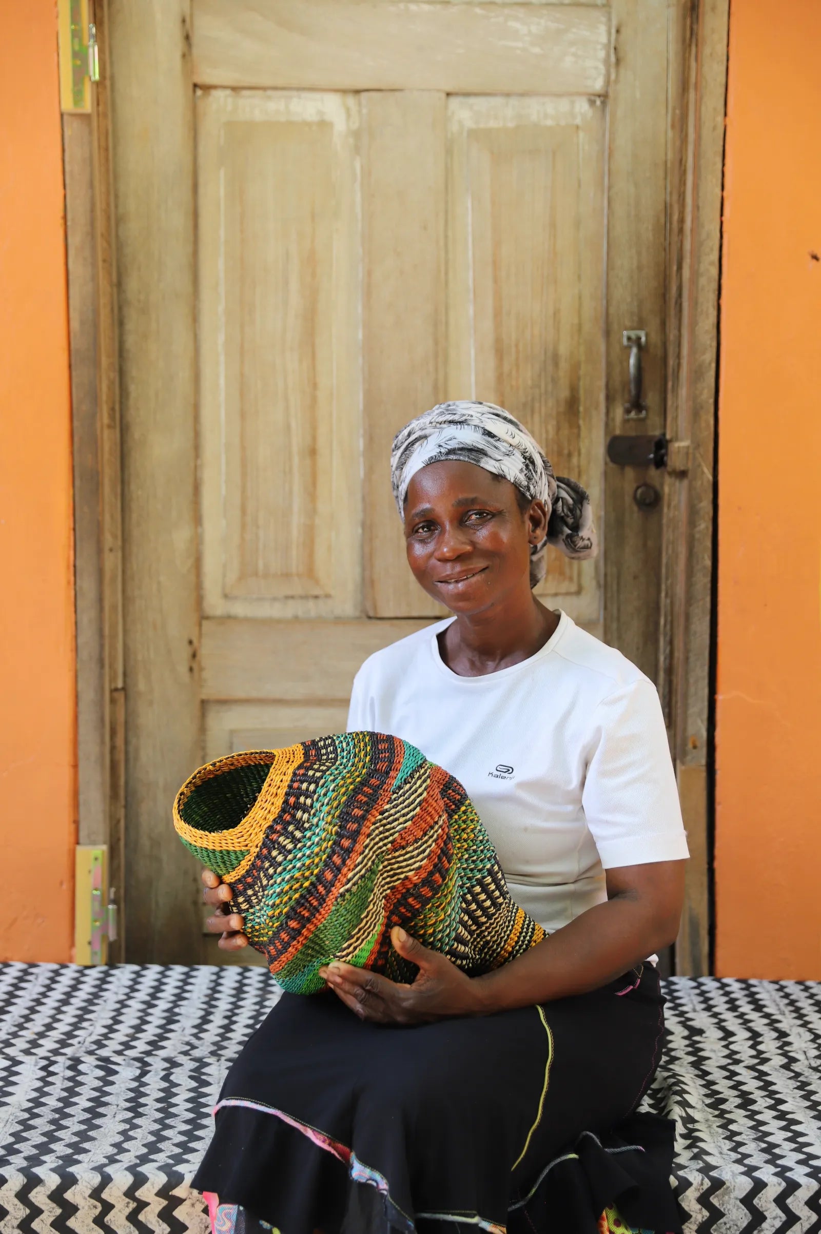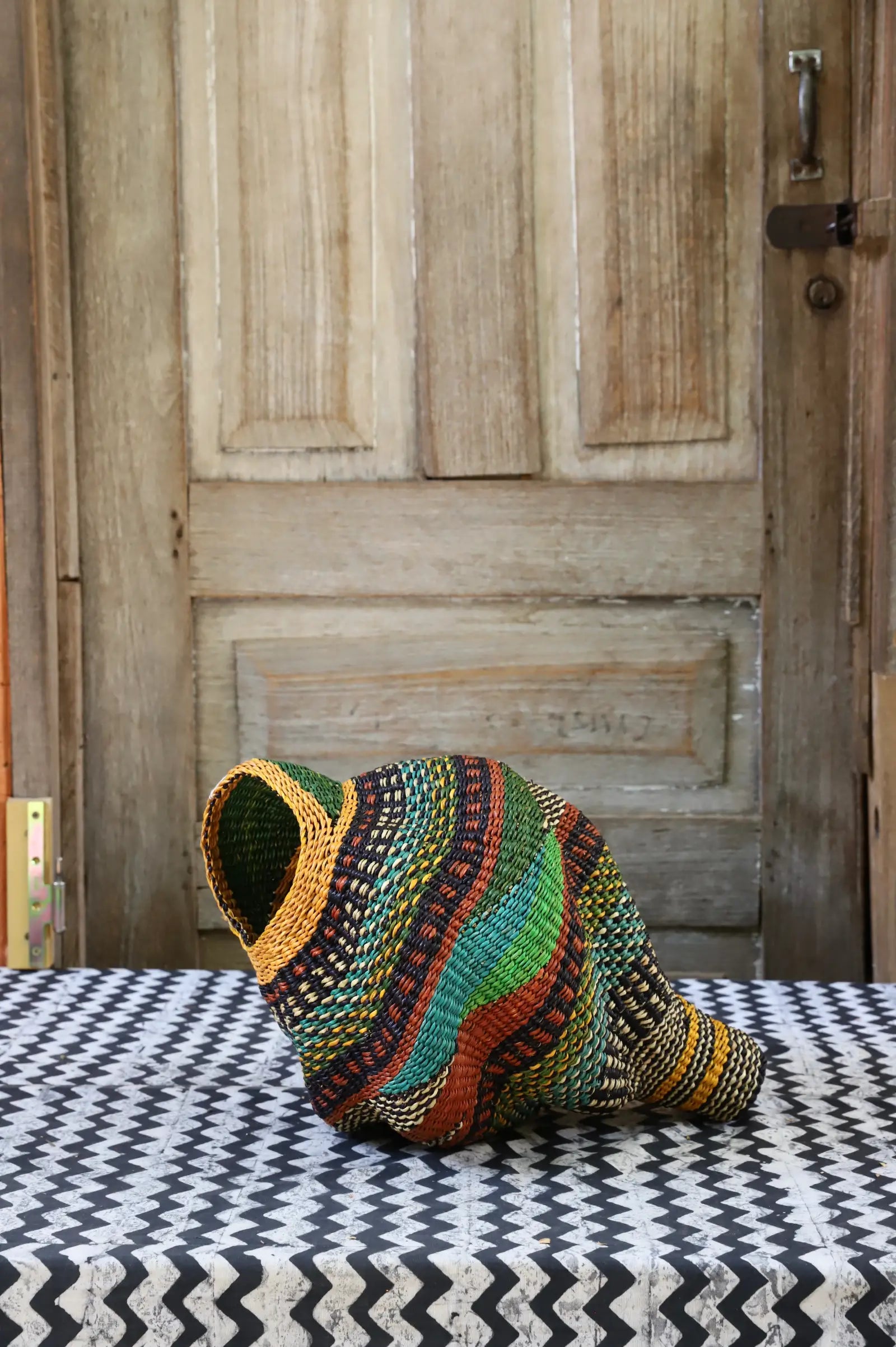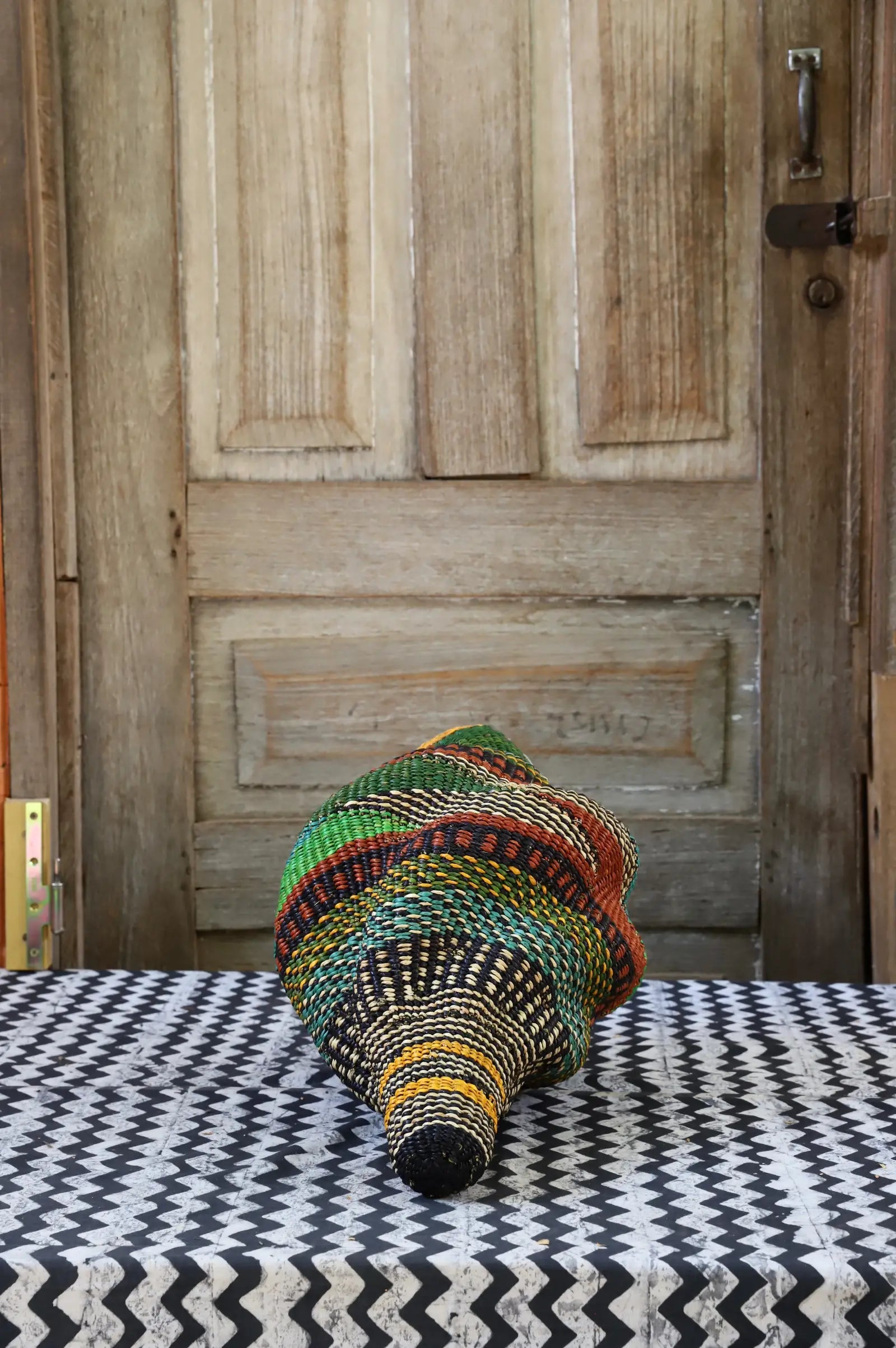 Katayeli-tia (Conch), known as the snail basket in Gurune, is an ode to the feminine. Crafted by artisan Perpetual over 3 1⁄2 weeks, its exquisite spiral design captivates with multi-dimensional beauty. Perfect as a striking statement in an entrance or overlooking the ocean in your beach home.