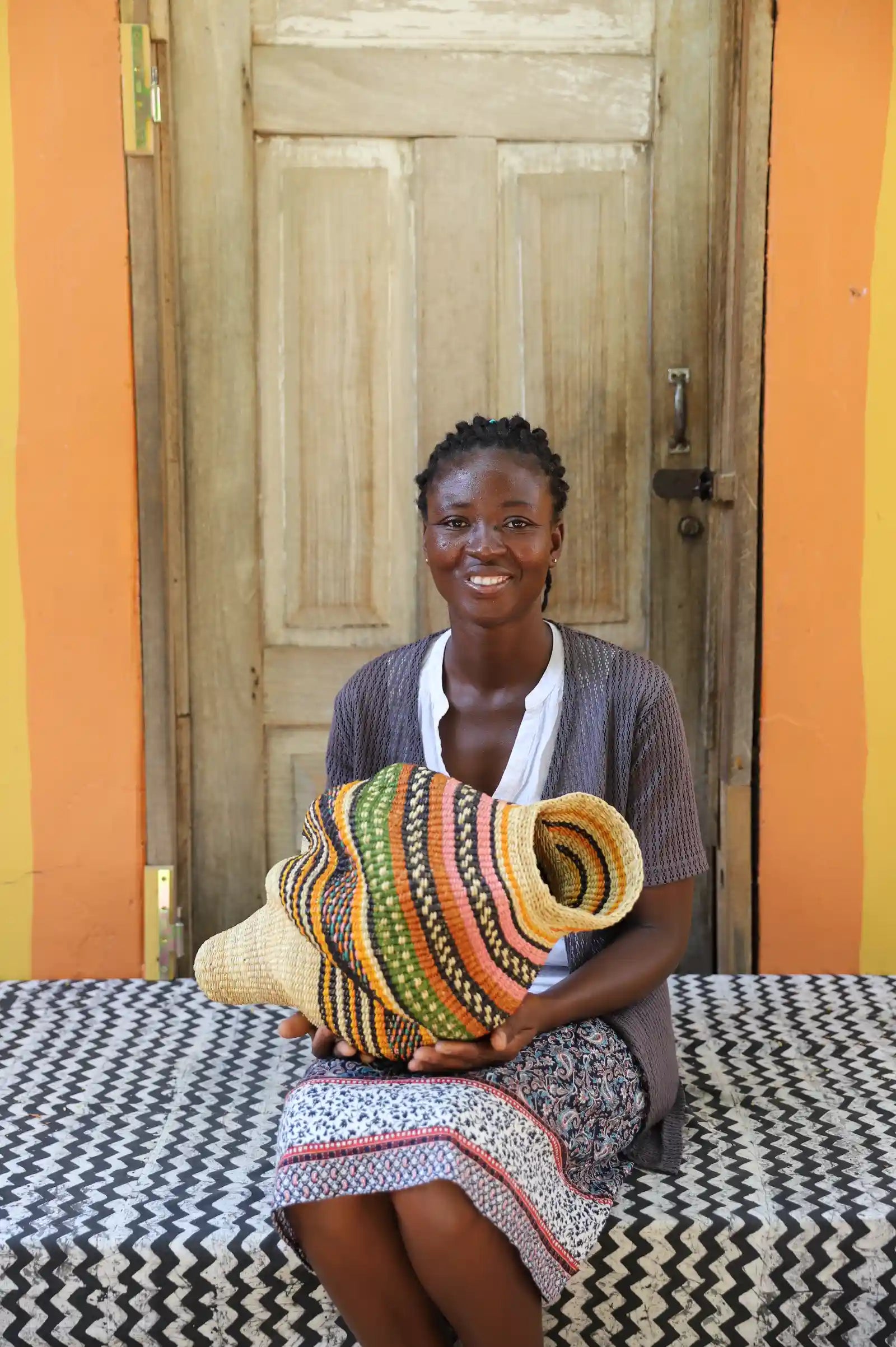 Katayeli-tia (Conch), known as the snail basket in Gurune, is an ode to the feminine. Crafted by artisan Perpetual over 3 1⁄2 weeks, its exquisite spiral design captivates with multi-dimensional beauty. Perfect as a striking statement in an entrance or overlooking the ocean in your beach home.