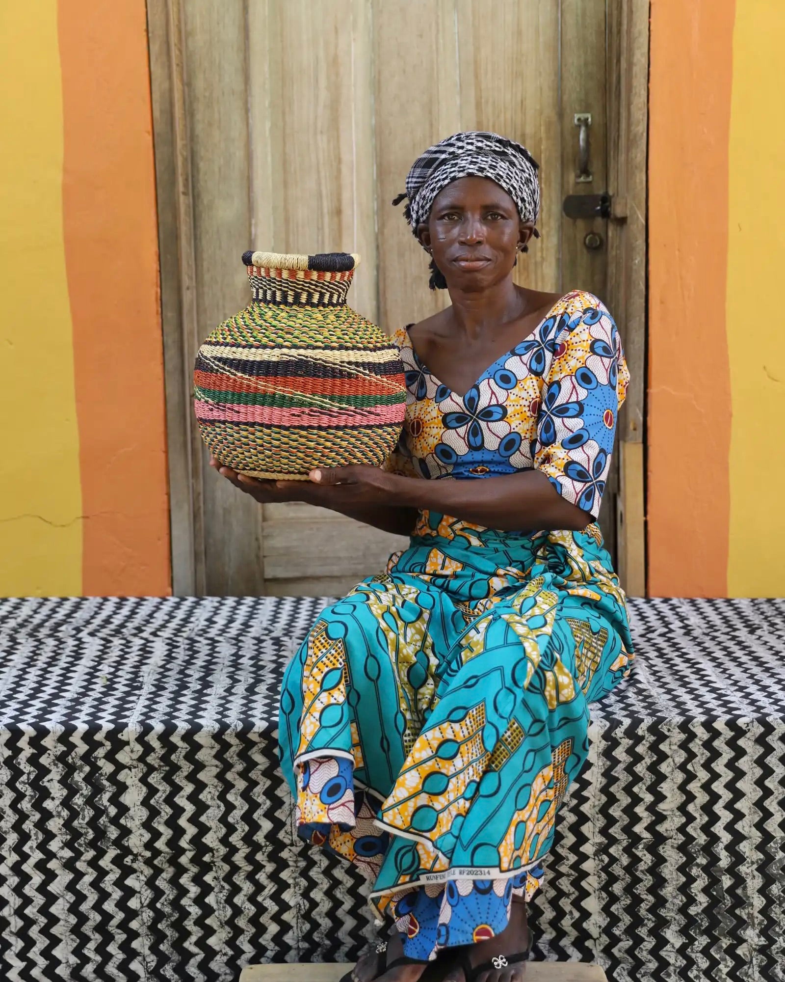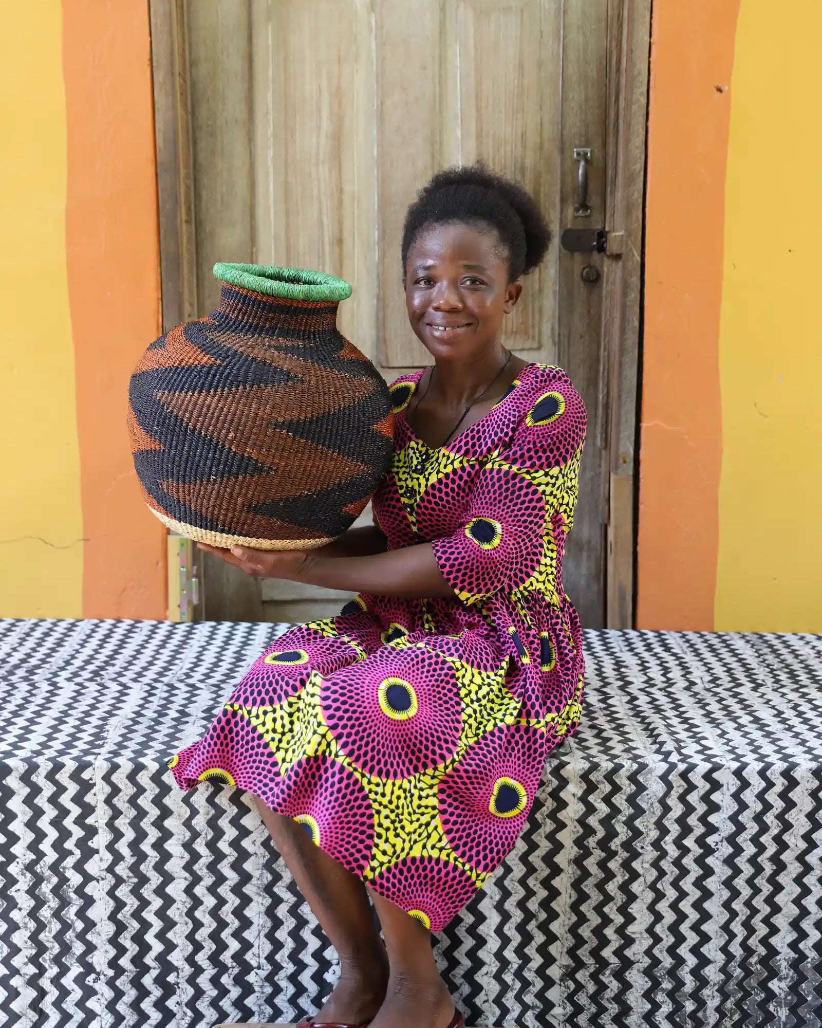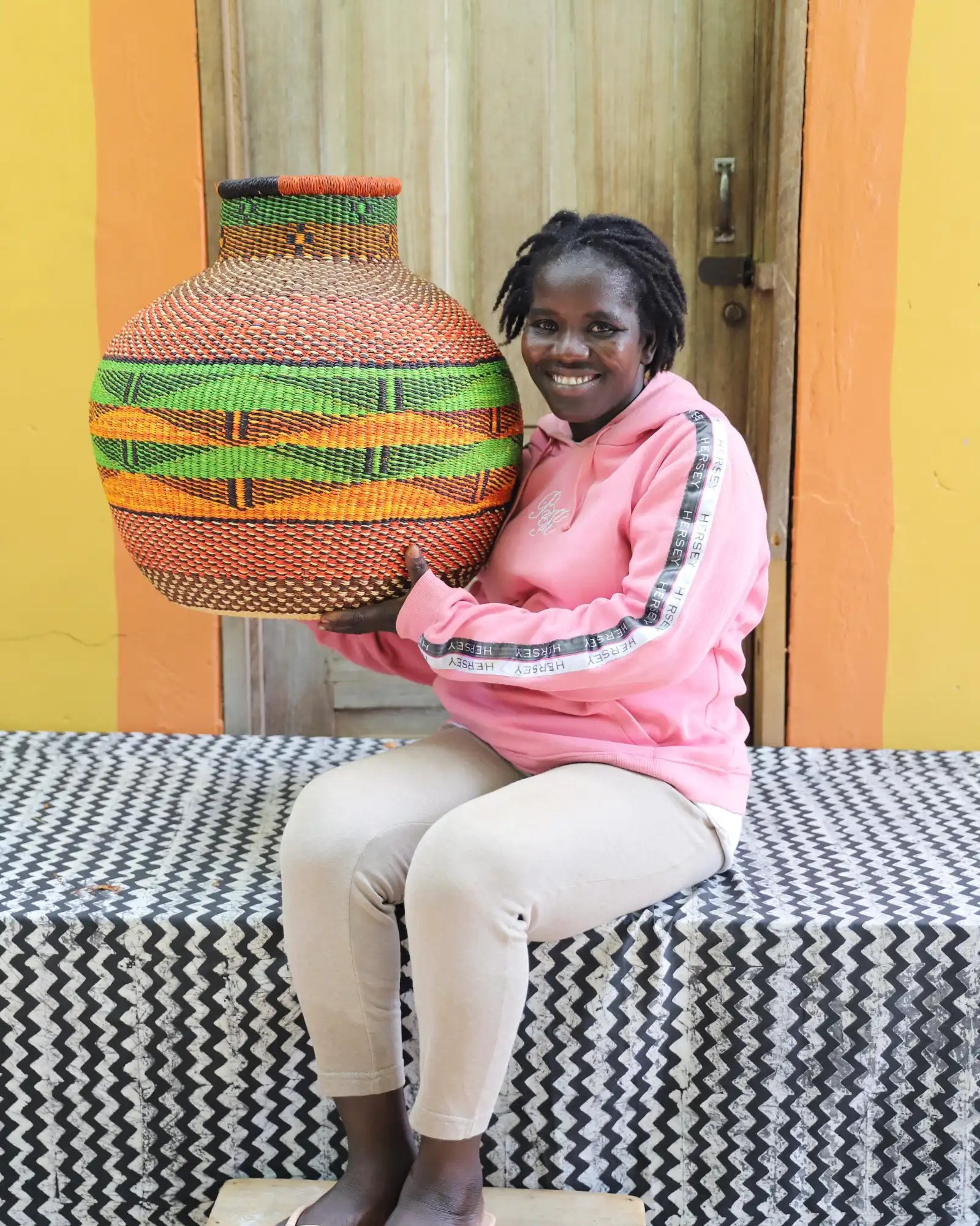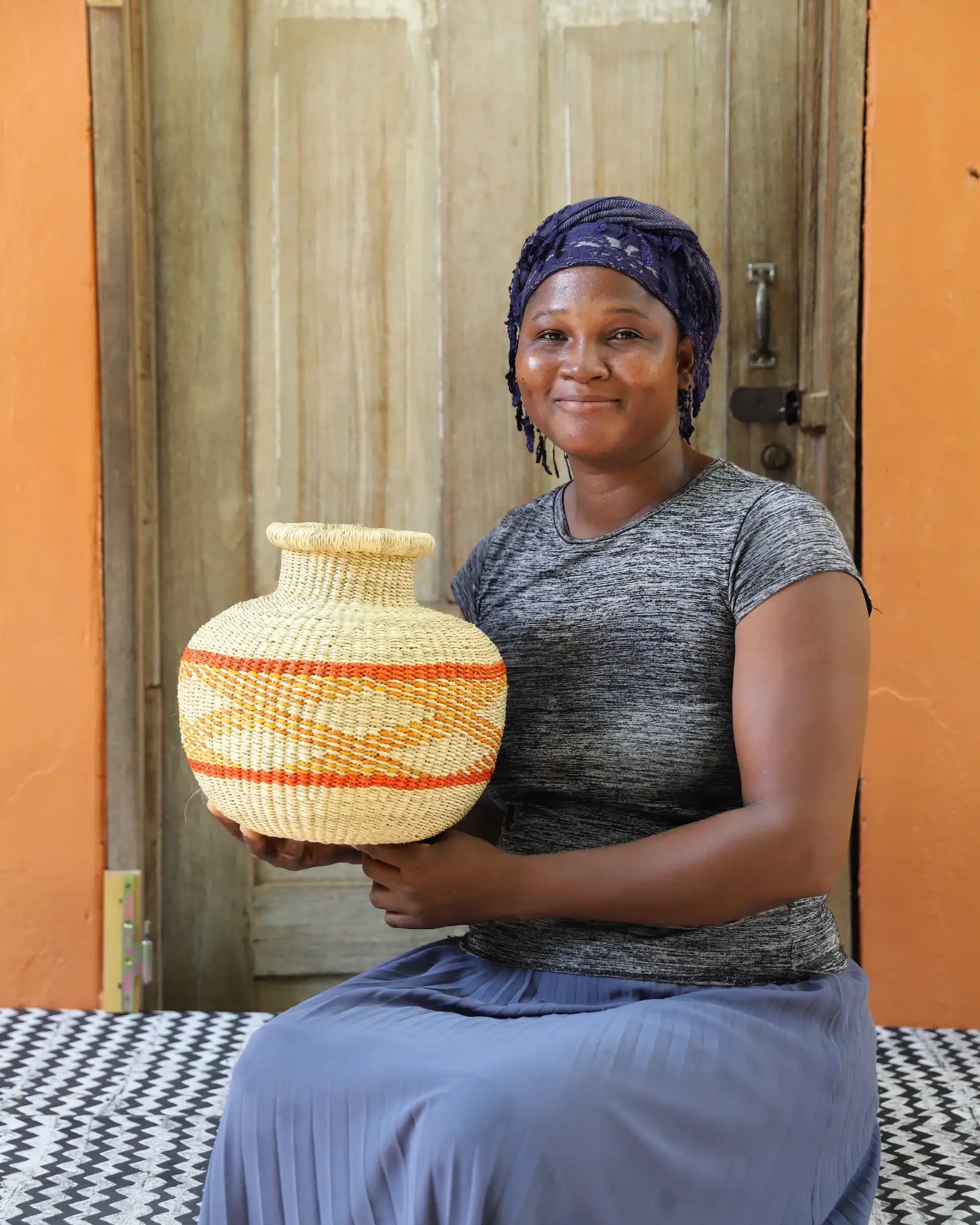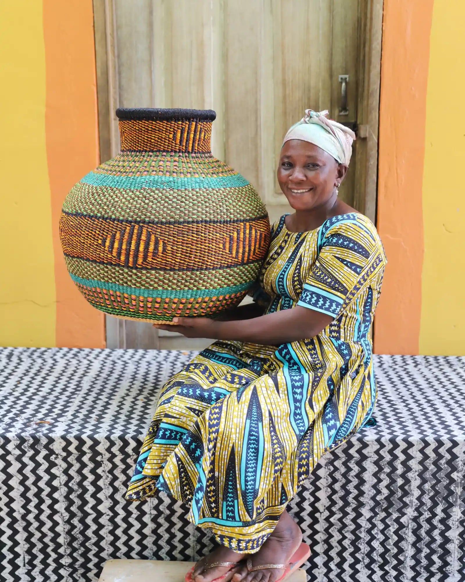 Jemima Akolgo was the first to weave this type of basket in Bolgatanga - so of course we named it after her and her master skills. Since then Jemima has taught and inspired many of our weavers with her innovative approach to traditional Gurunsi folklore. Honouring local basket traditions and creating exciting forms with the oldest craft in the world is what we do best! New ways with weave indeed.