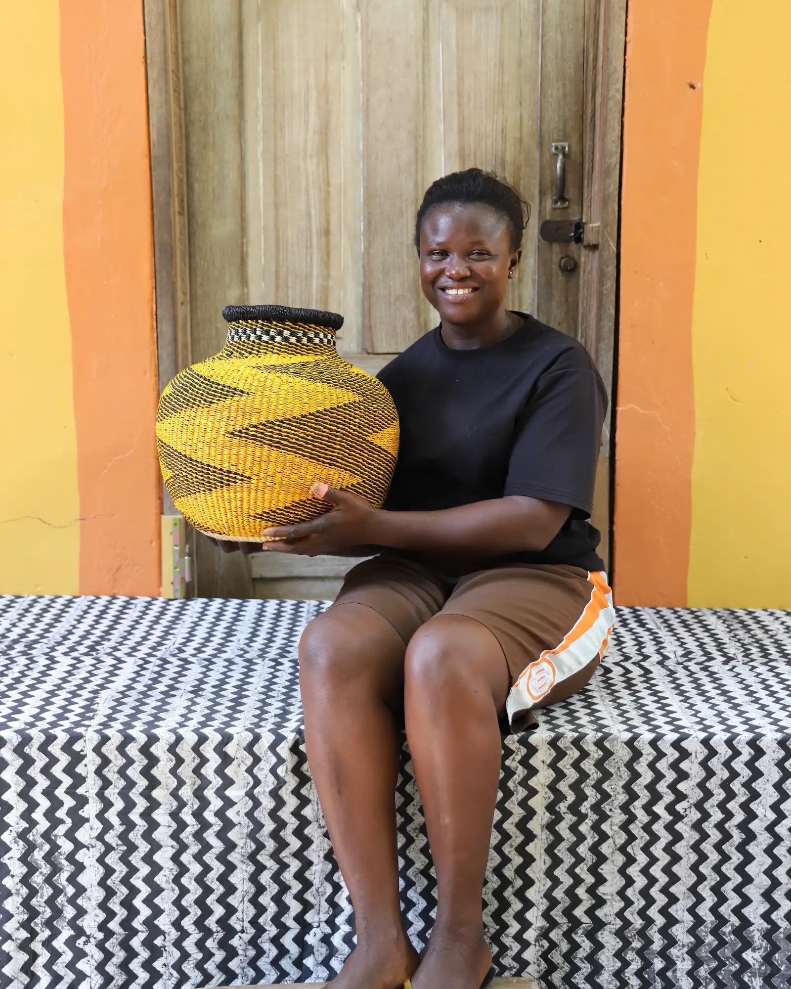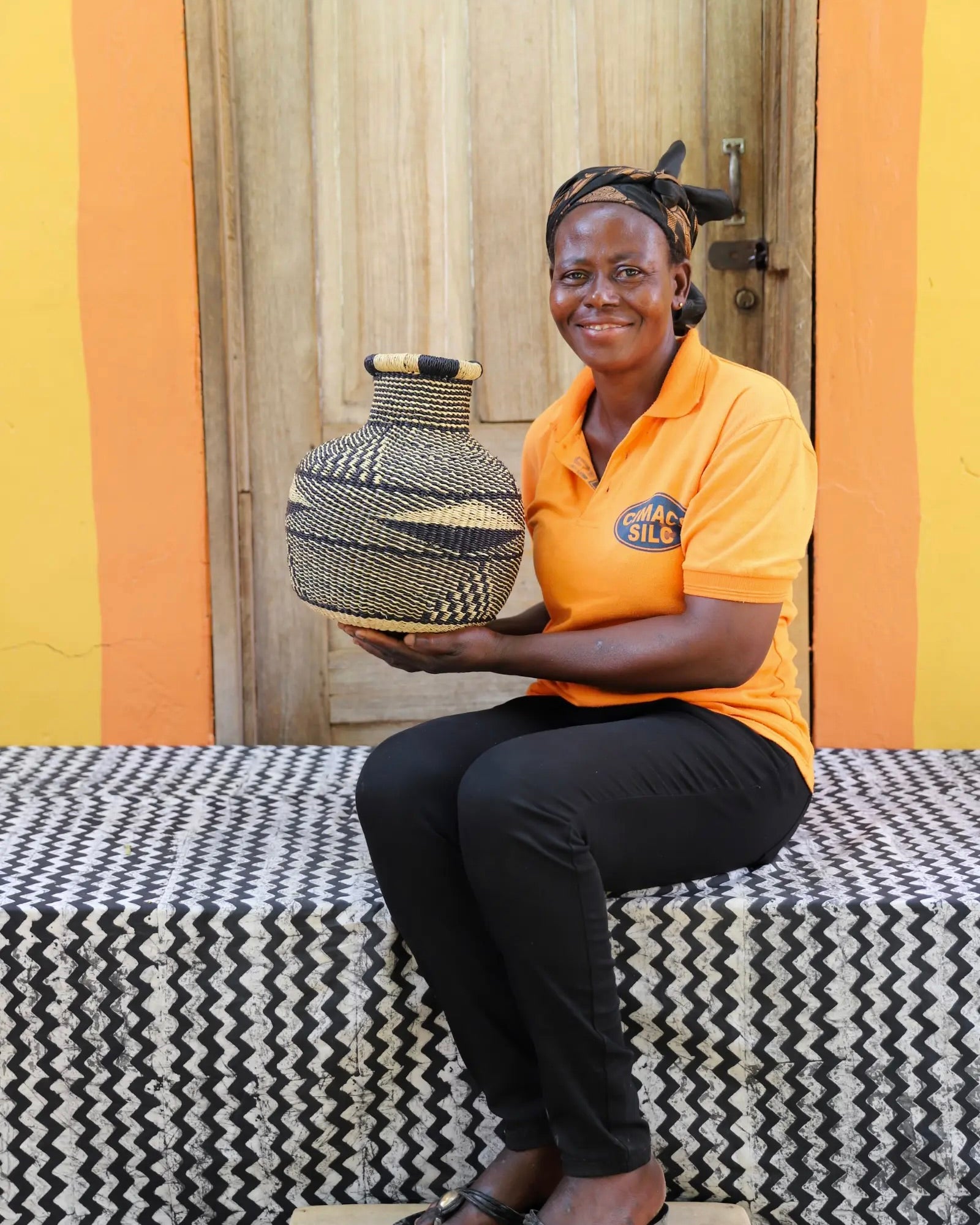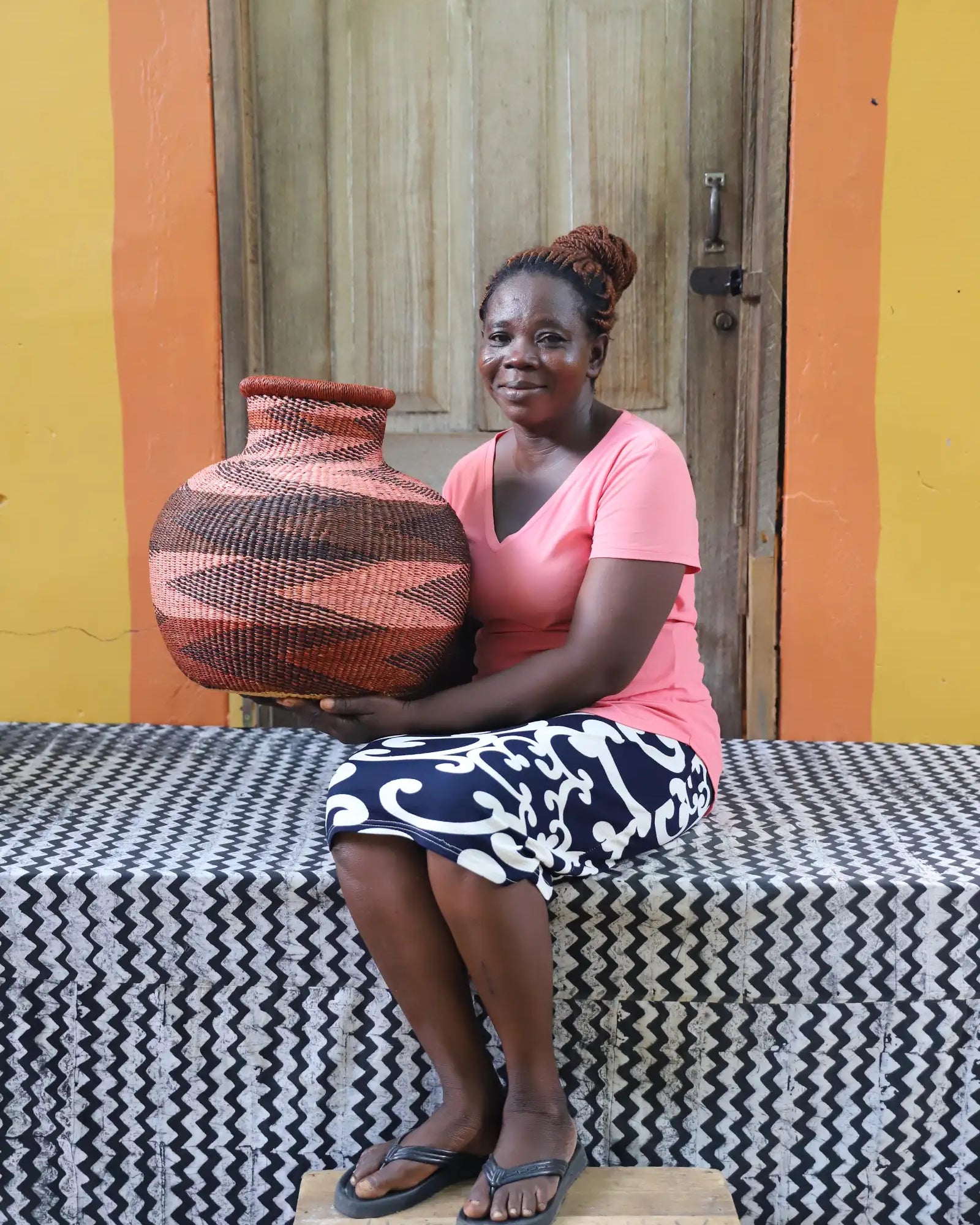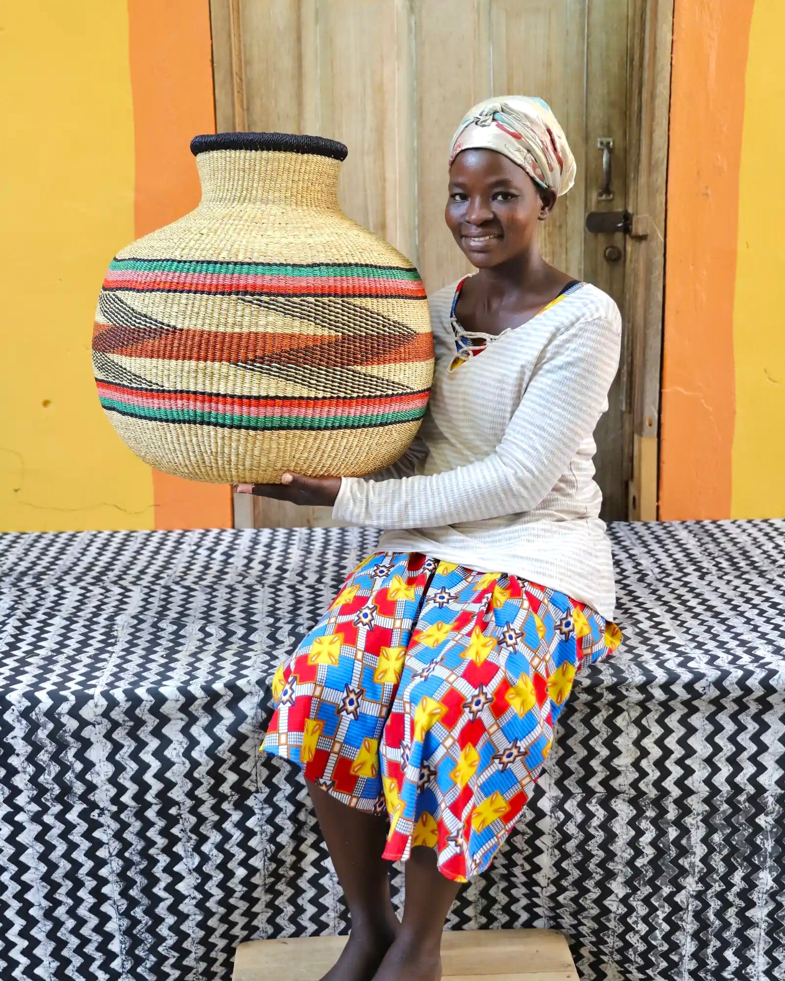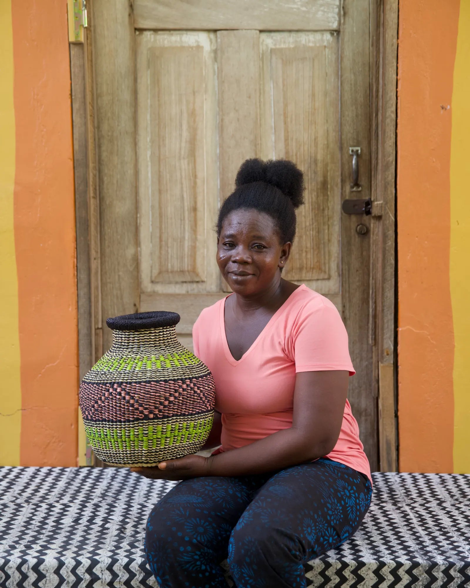 Jemima Akolgo was the first to weave this type of basket in Bolgatanga - so of course we named it after her and her master skills. Since then Jemima has taught and inspired many of our weavers with her innovative approach to traditional Gurunsi folklore. Honouring local basket traditions and creating exciting forms with the oldest craft in the world is what we do best! New ways with weave indeed.