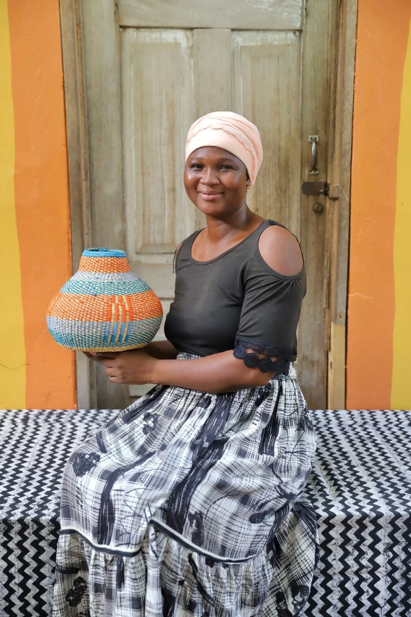 The Material Futures project blends our basketry tradition with upcycled textile waste from local markets. These reclaimed fabrics add fresh colors, textures, and bold details to create unique luxury baskets.