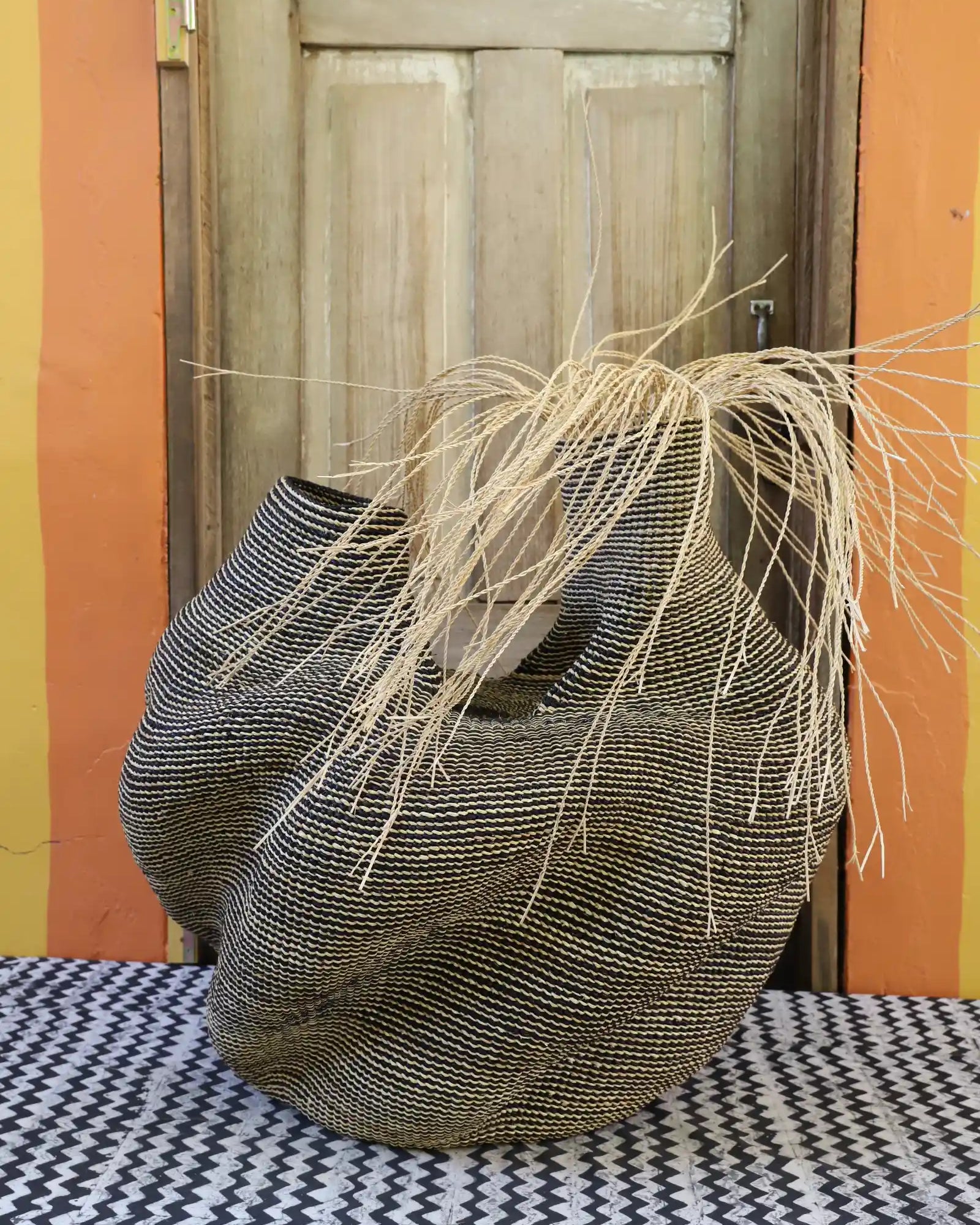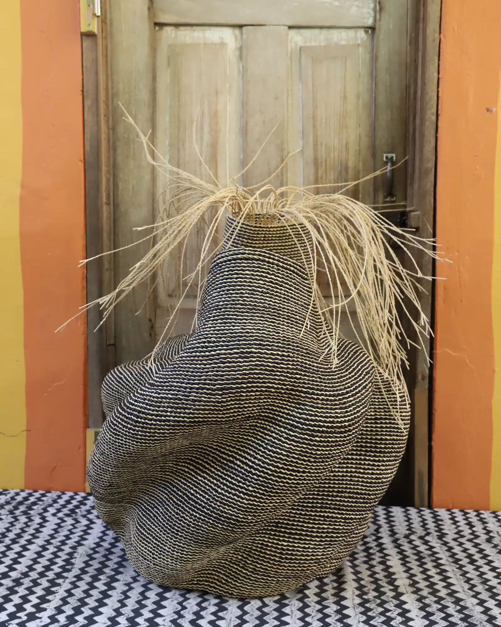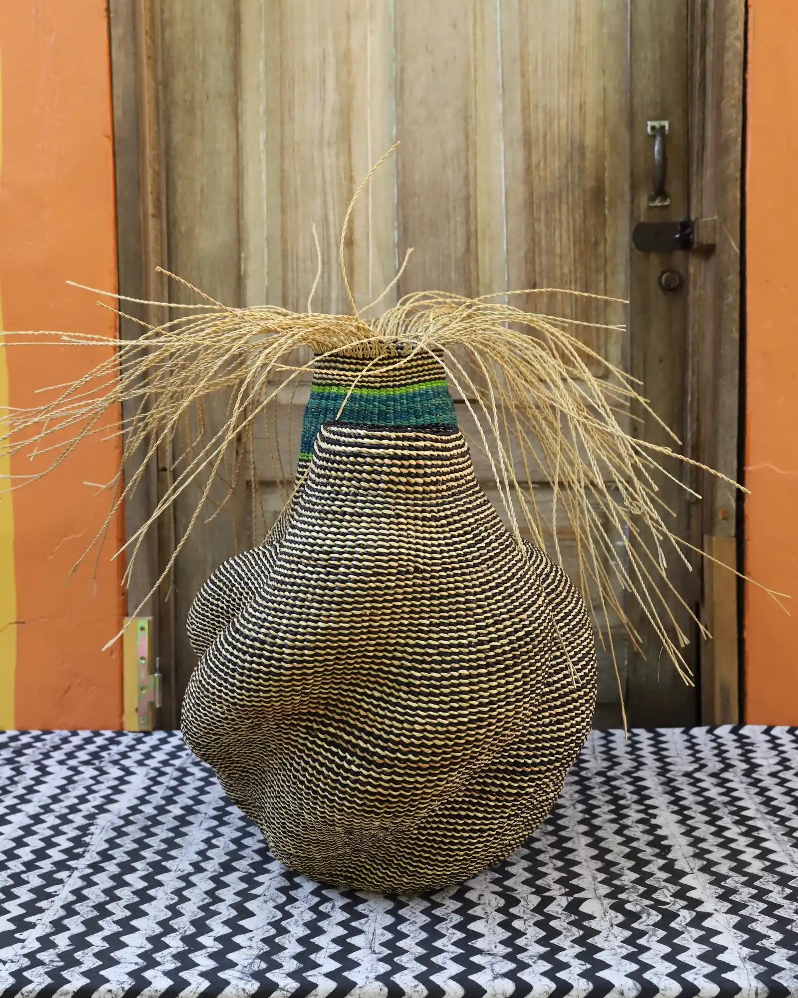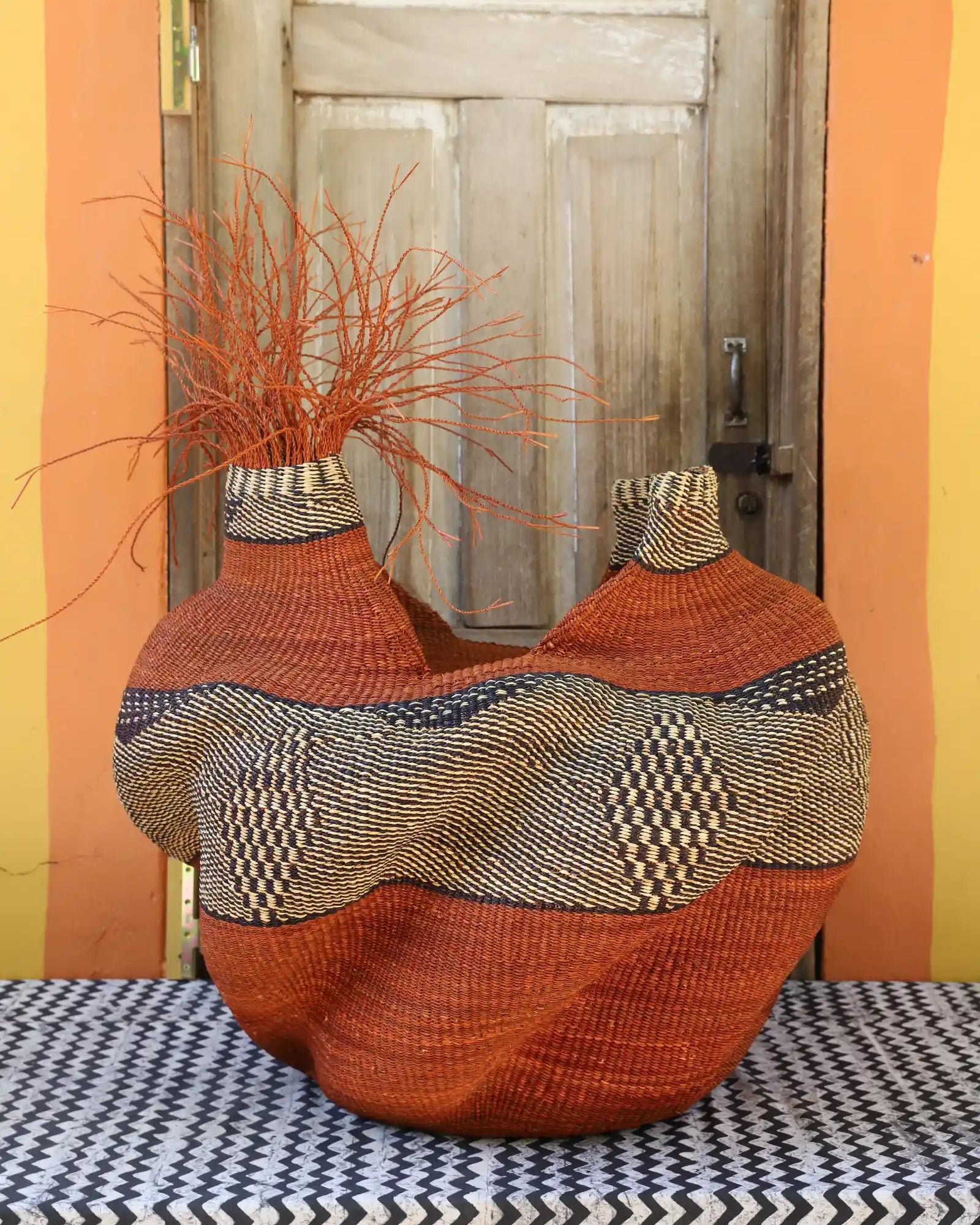 The Woman Man Basket was imagined and created by Madame 1000, inspired by a two-headed baby goat born near her home. The result: a basket with two “heads”—a symbol of balance and duality. At The Baba Tree, women and men weave side by side, as equals in craft and community. This piece celebrates that spirit.