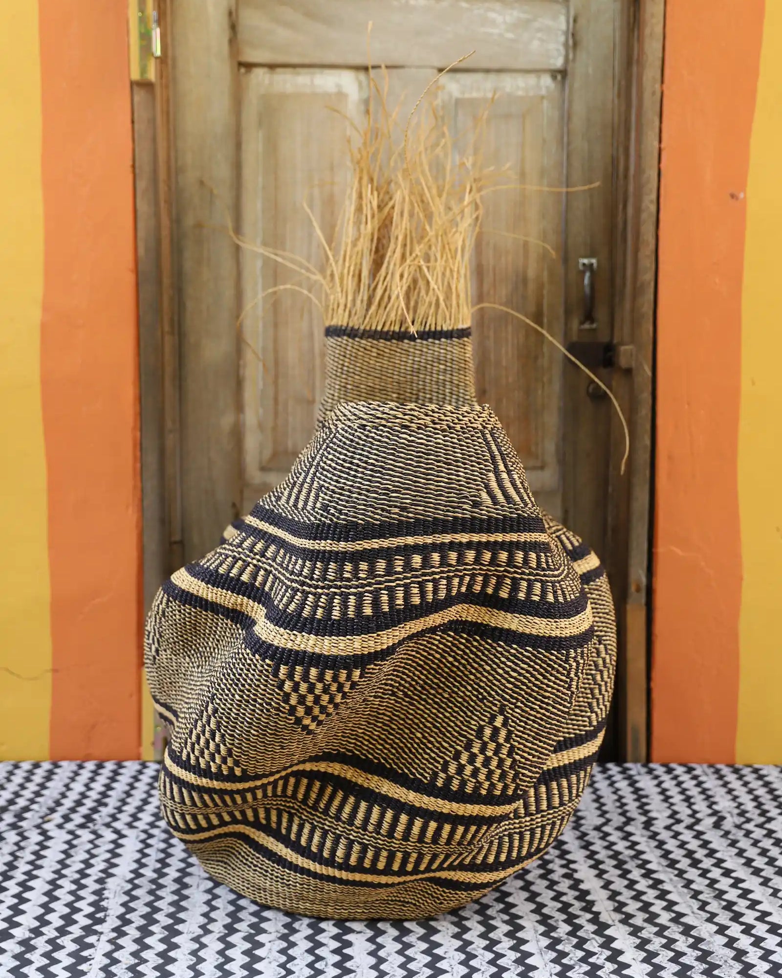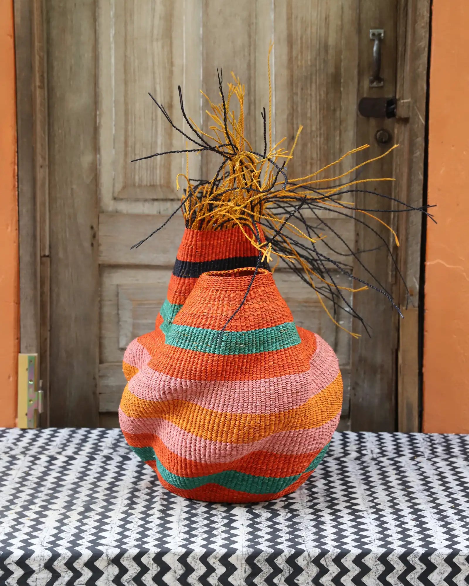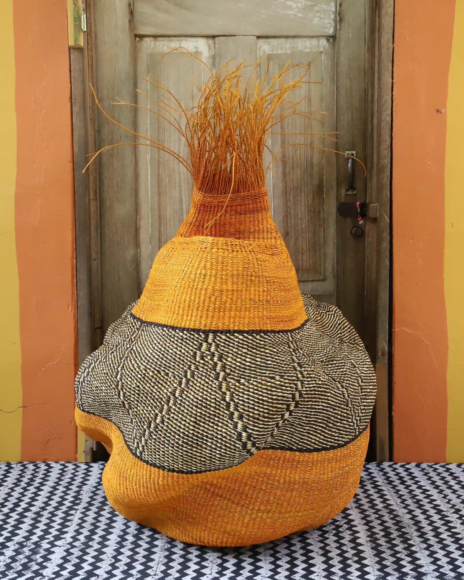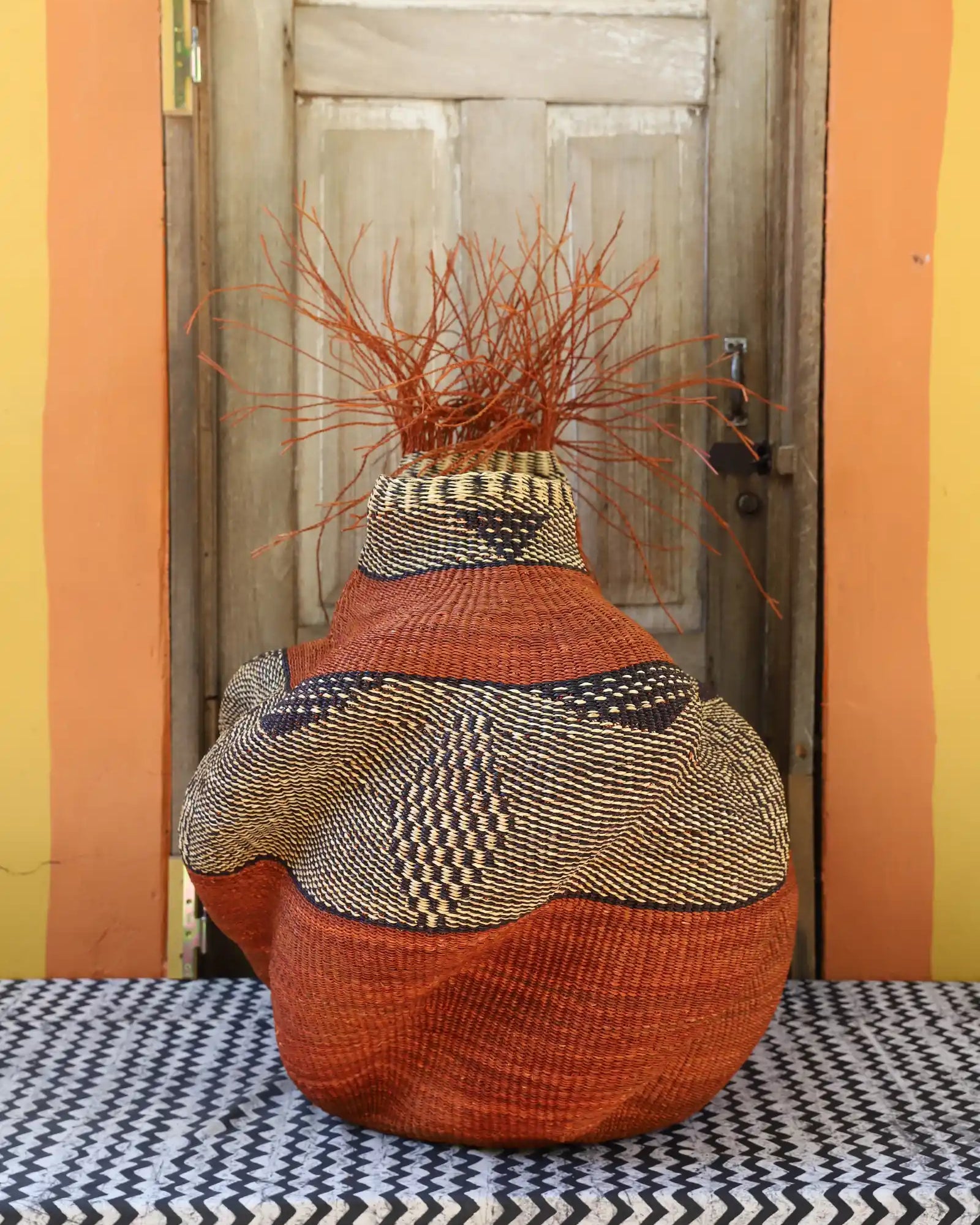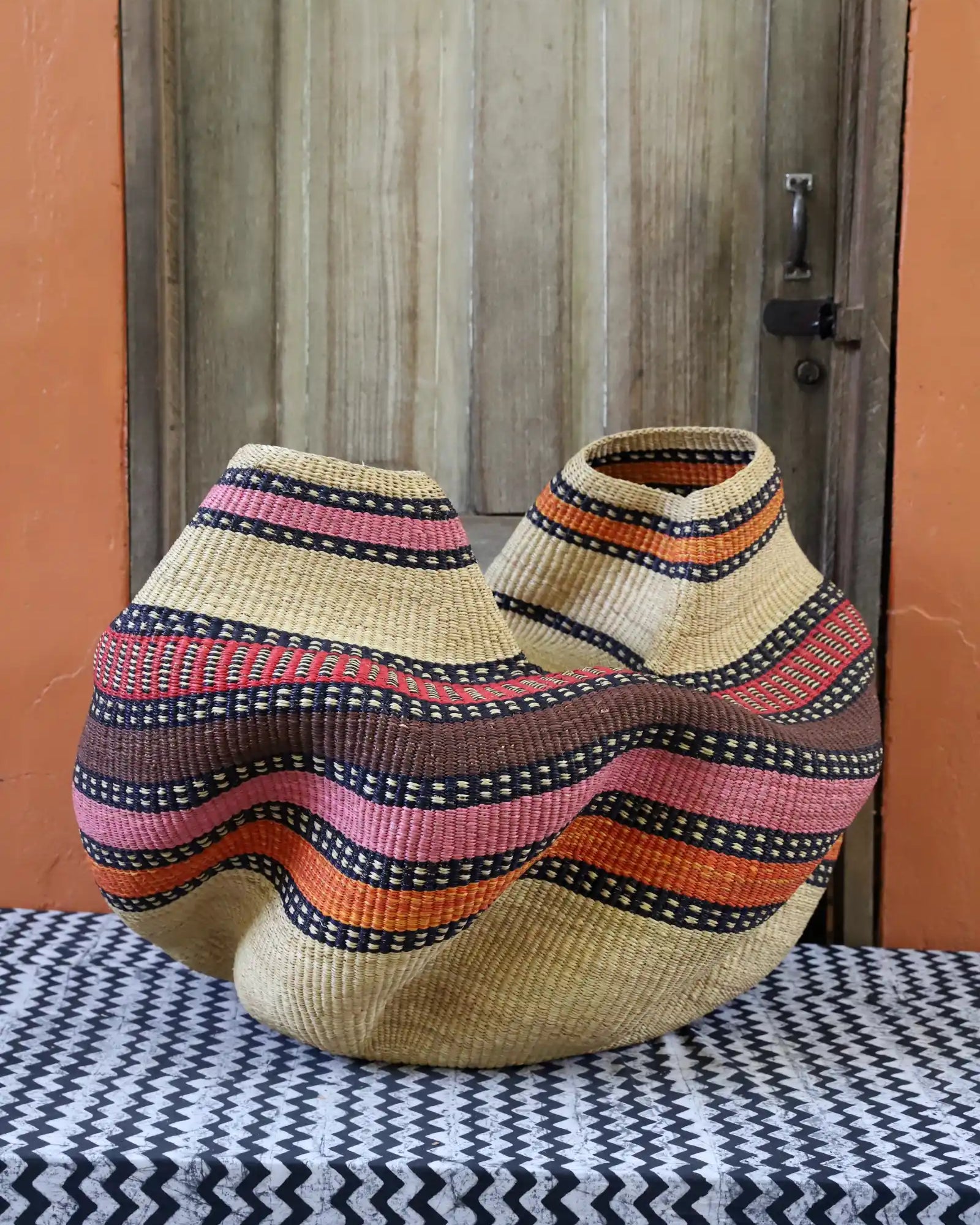 The Woman Man Basket was imagined and created by Madame 1000, inspired by a two-headed baby goat born near her home. The result: a basket with two “heads”—a symbol of balance and duality. At The Baba Tree, women and men weave side by side, as equals in craft and community. This piece celebrates that spirit.
