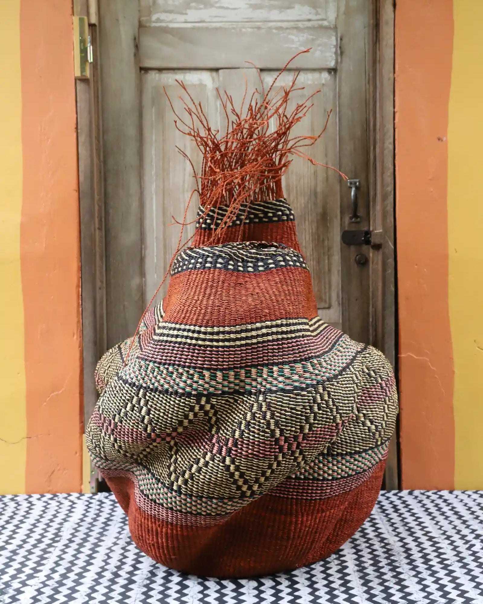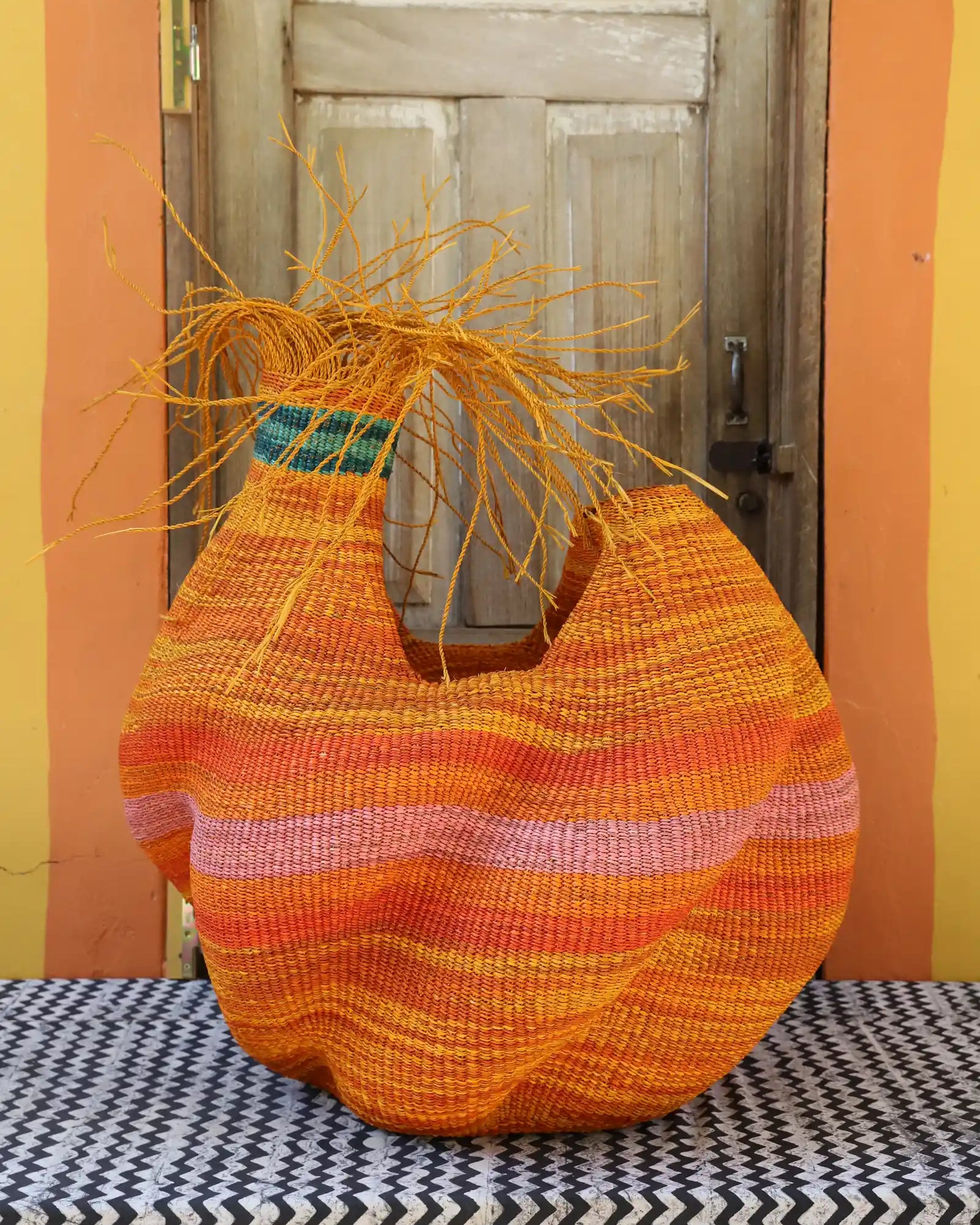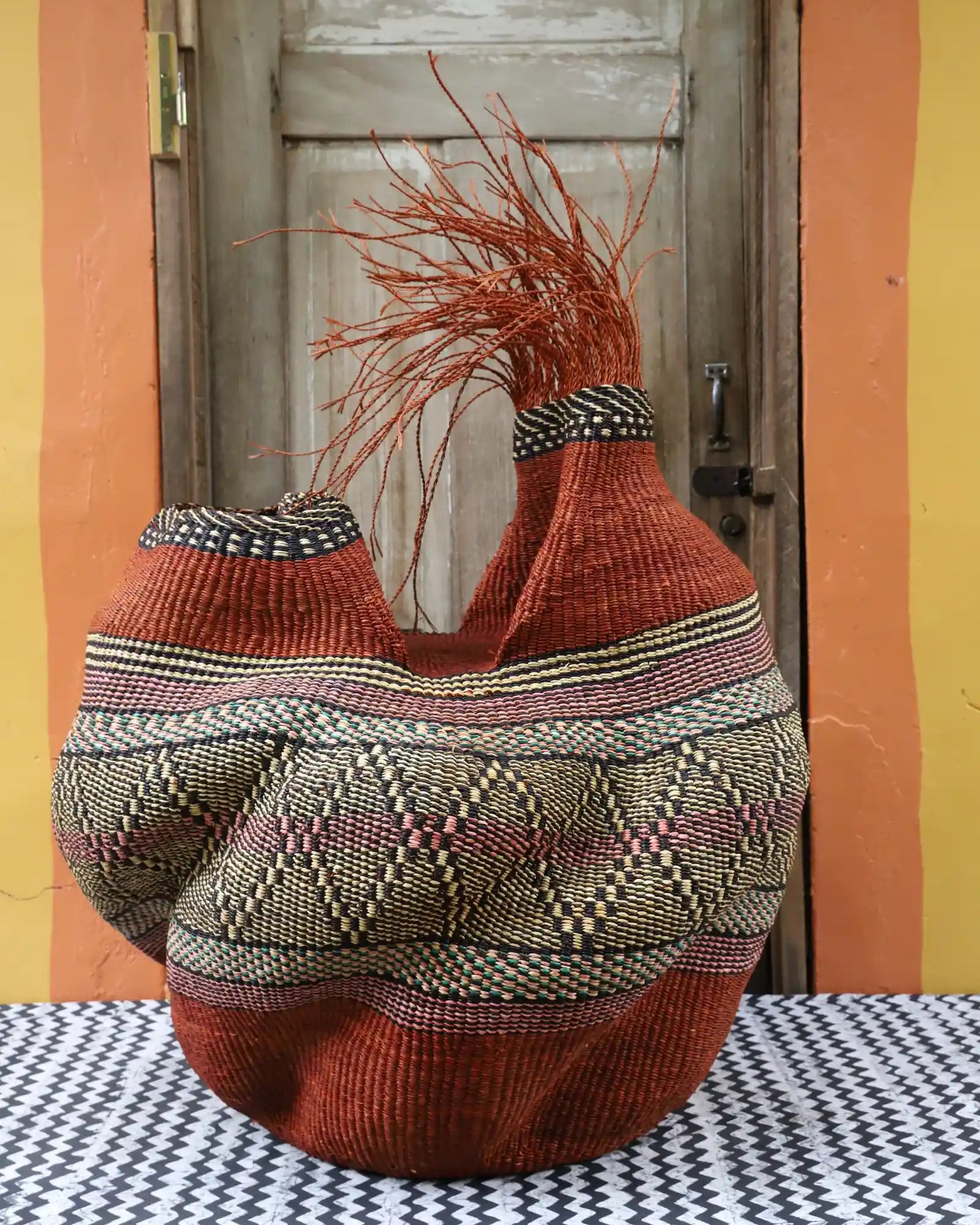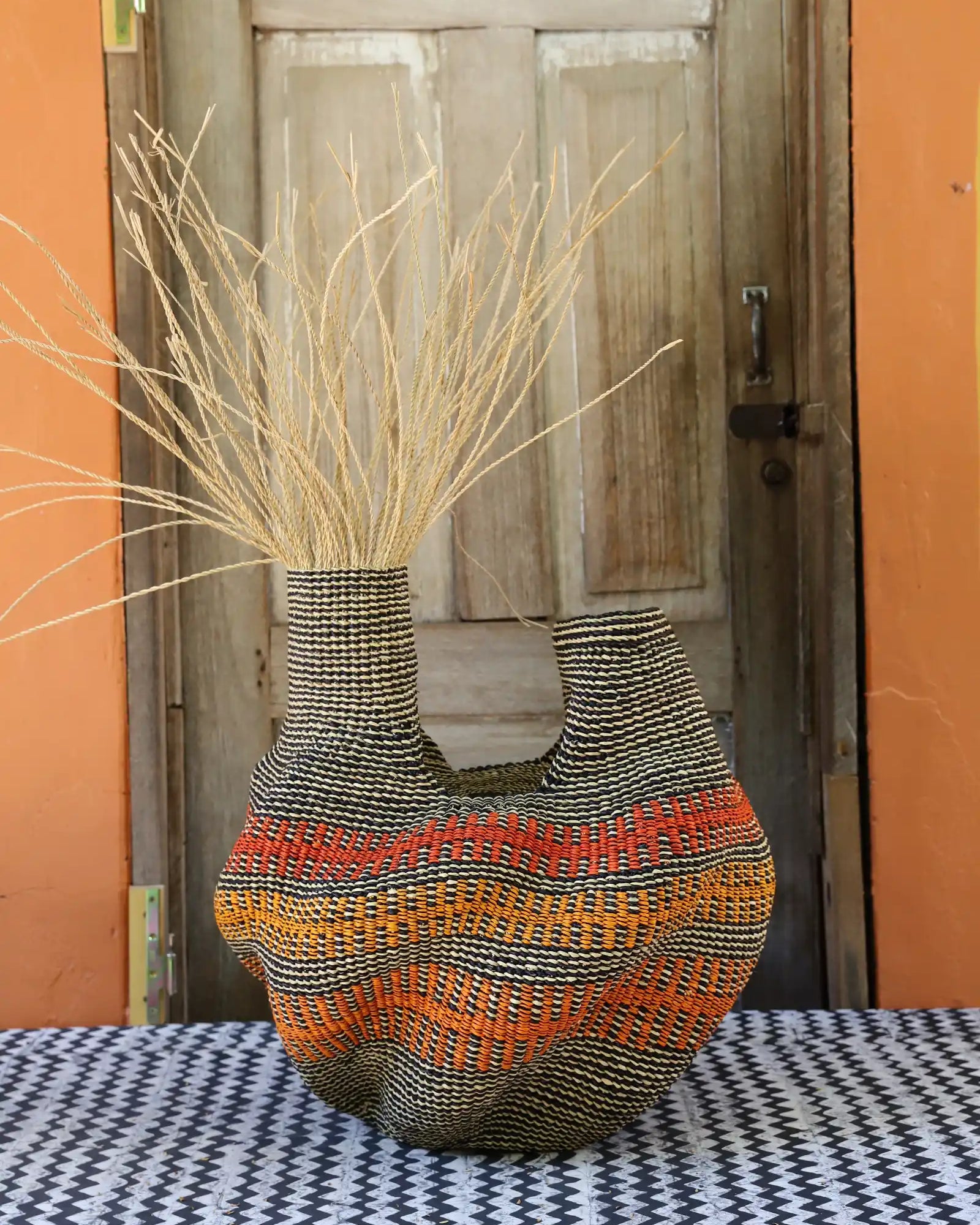 The Woman Man Basket was imagined and created by Madame 1000, inspired by a two-headed baby goat born near her home. The result: a basket with two “heads”—a symbol of balance and duality. At The Baba Tree, women and men weave side by side, as equals in craft and community. This piece celebrates that spirit.