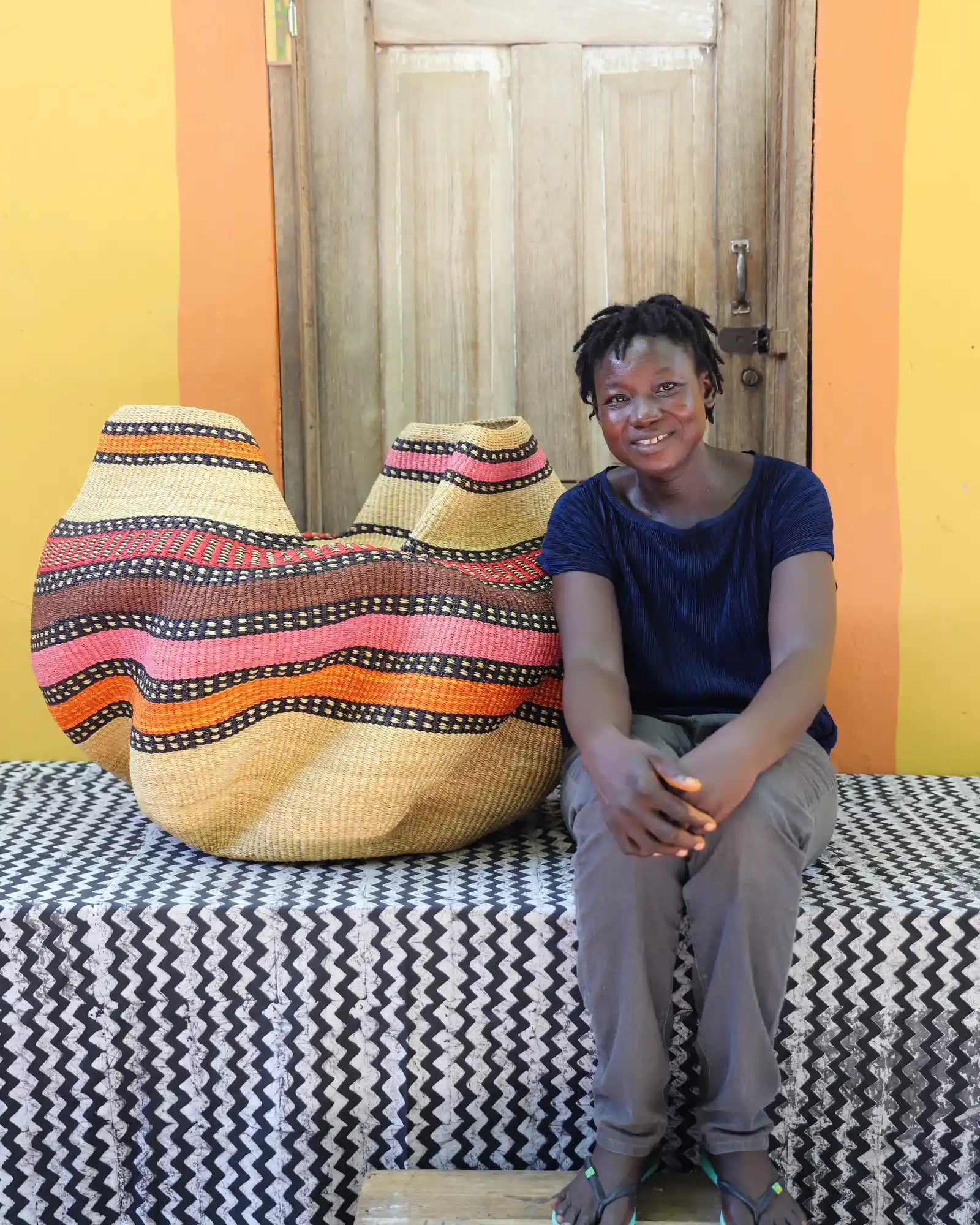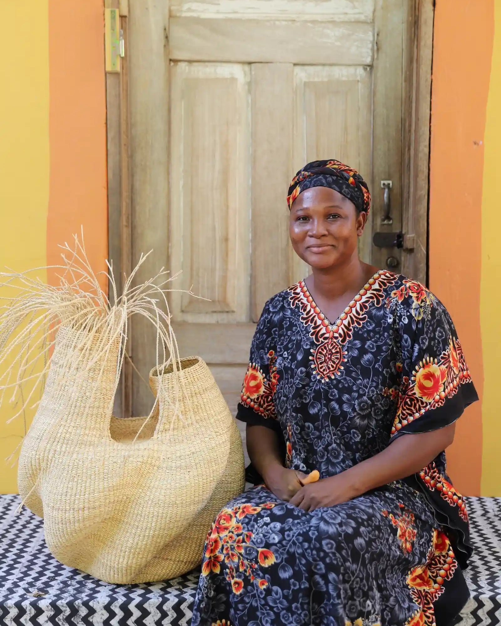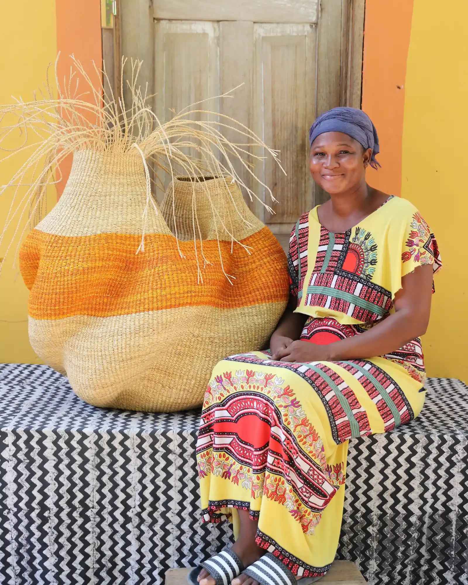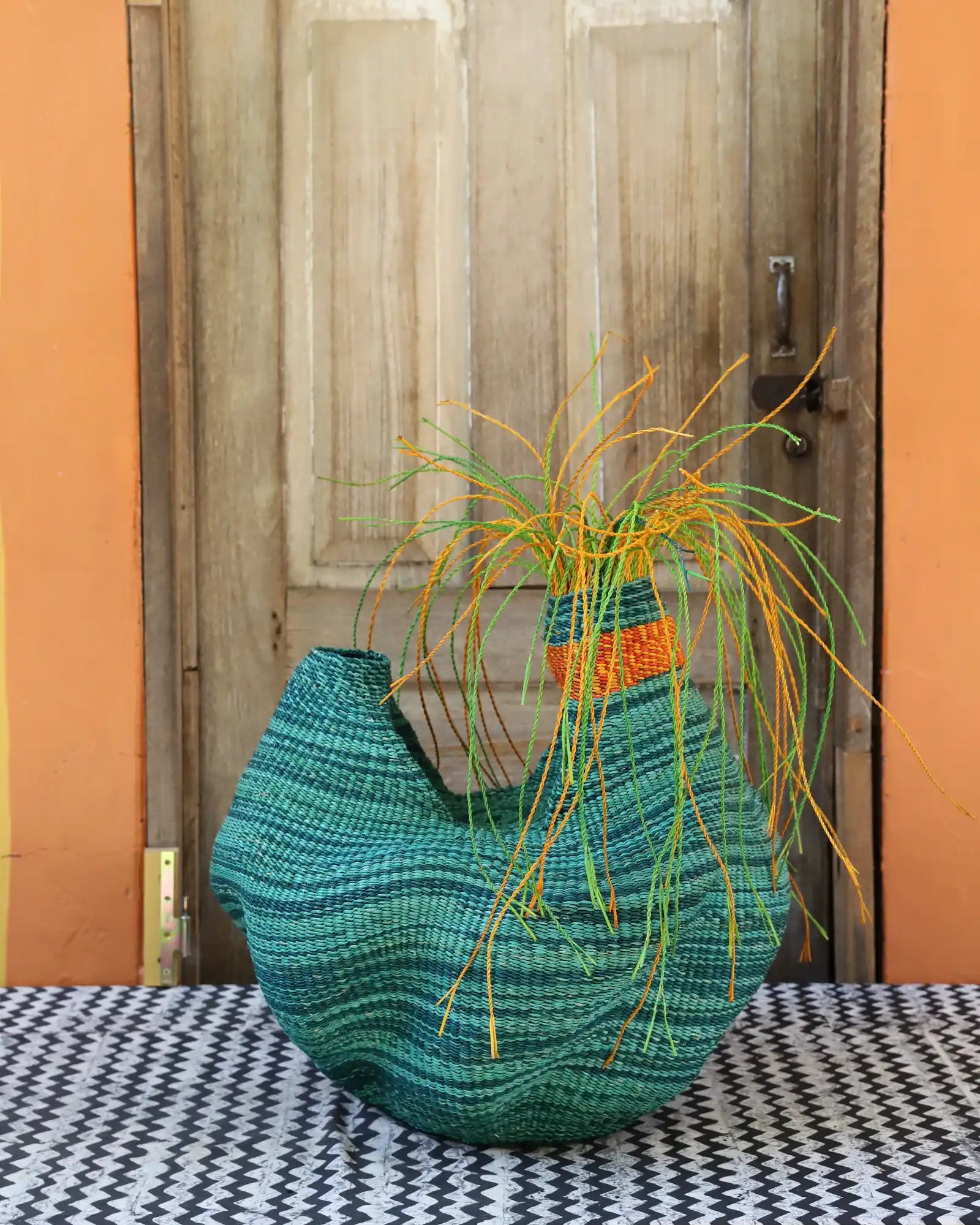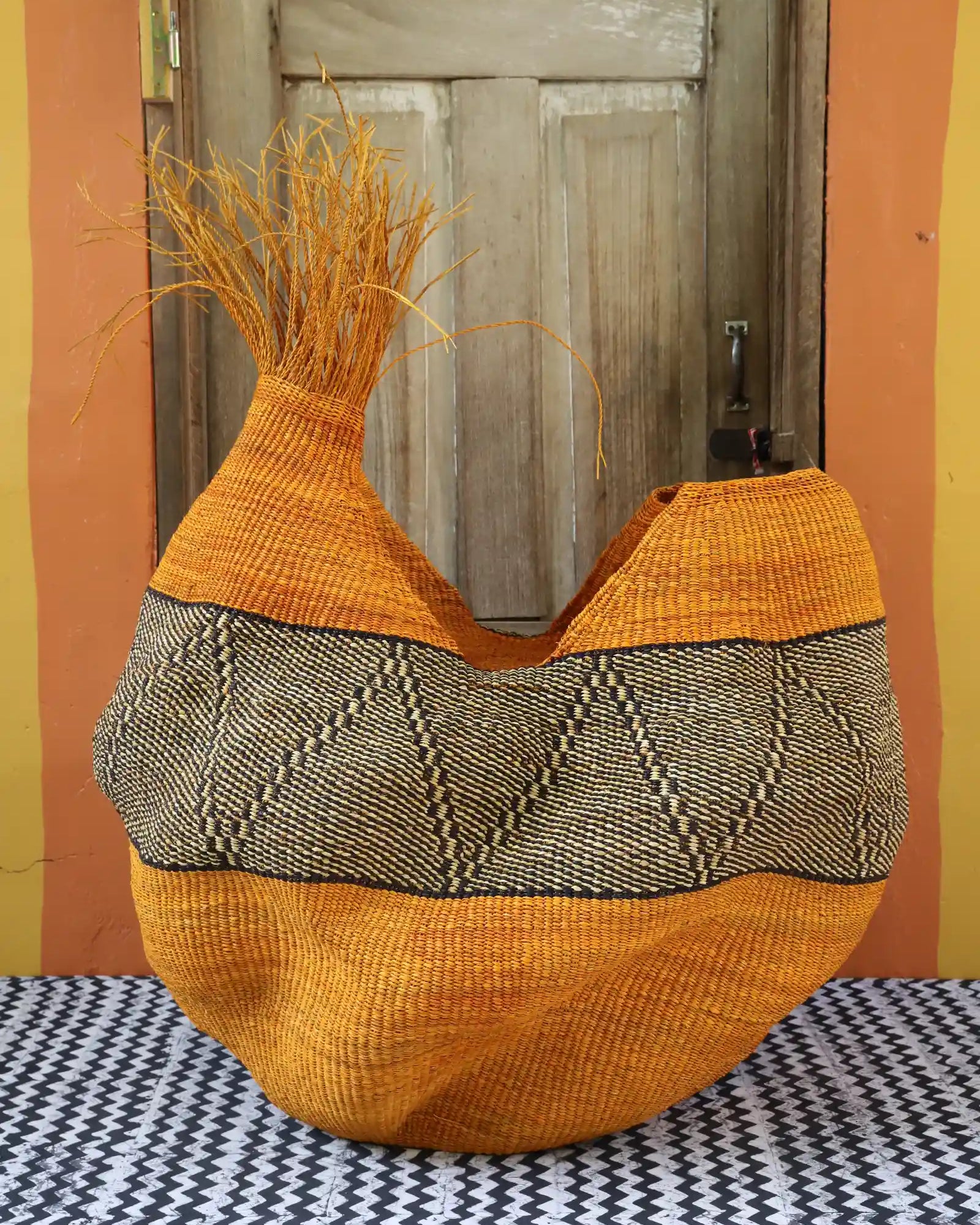 The Woman Man Basket was imagined and created by Madame 1000, inspired by a two-headed baby goat born near her home. The result: a basket with two “heads”—a symbol of balance and duality. At The Baba Tree, women and men weave side by side, as equals in craft and community. This piece celebrates that spirit.
