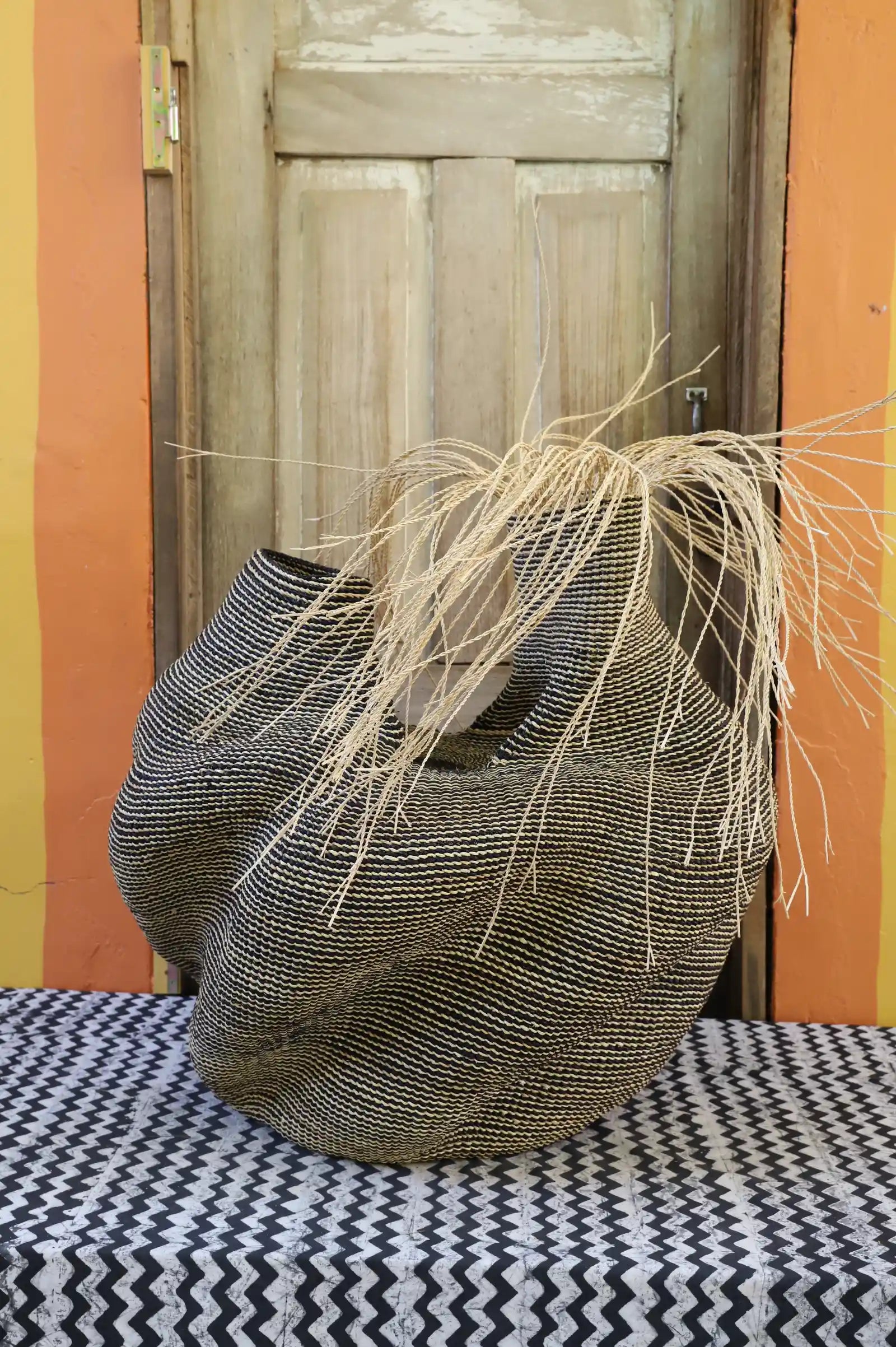 The Woman Man Basket was imagined and created by Madame 1000, inspired by a two-headed baby goat born near her home. The result: a basket with two “heads”—a symbol of balance and duality. At The Baba Tree, women and men weave side by side, as equals in craft and community. This piece celebrates that spirit.