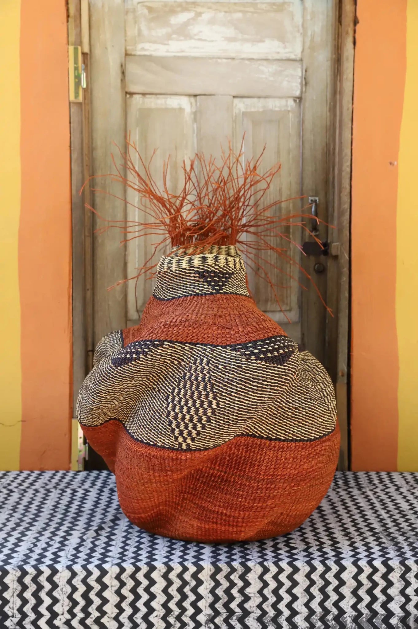 The Woman Man Basket was imagined and created by Madame 1000, inspired by a two-headed baby goat born near her home. The result: a basket with two “heads”—a symbol of balance and duality. At The Baba Tree, women and men weave side by side, as equals in craft and community. This piece celebrates that spirit.