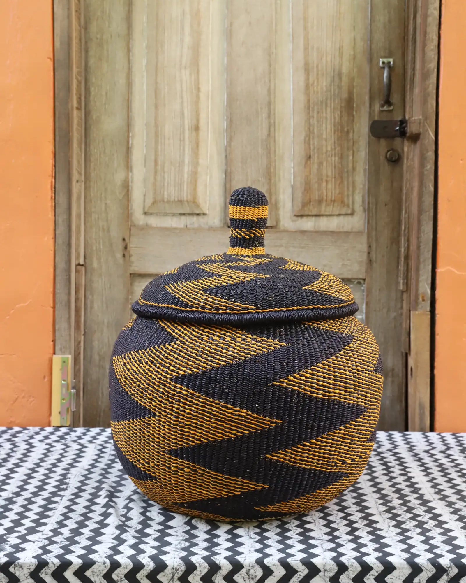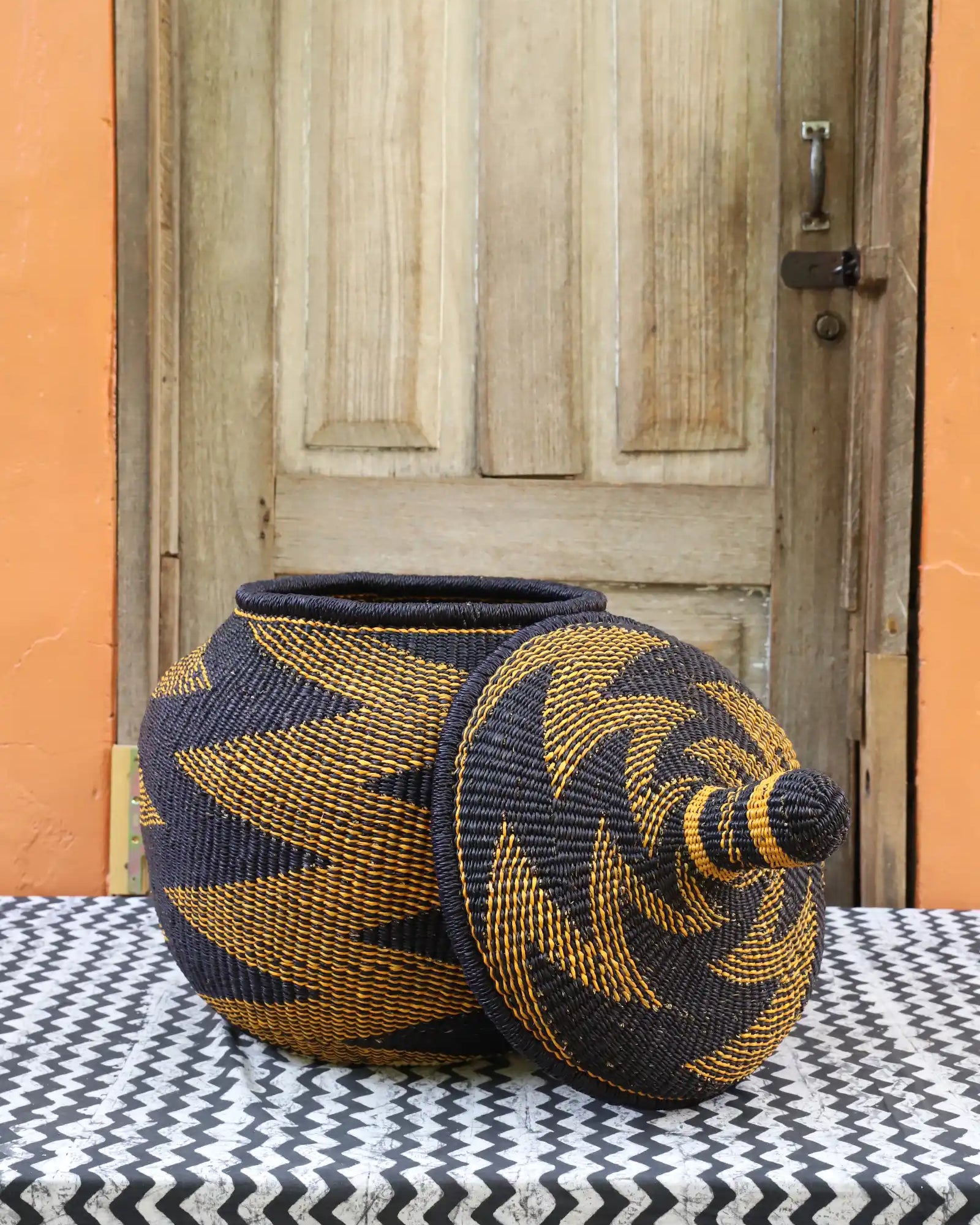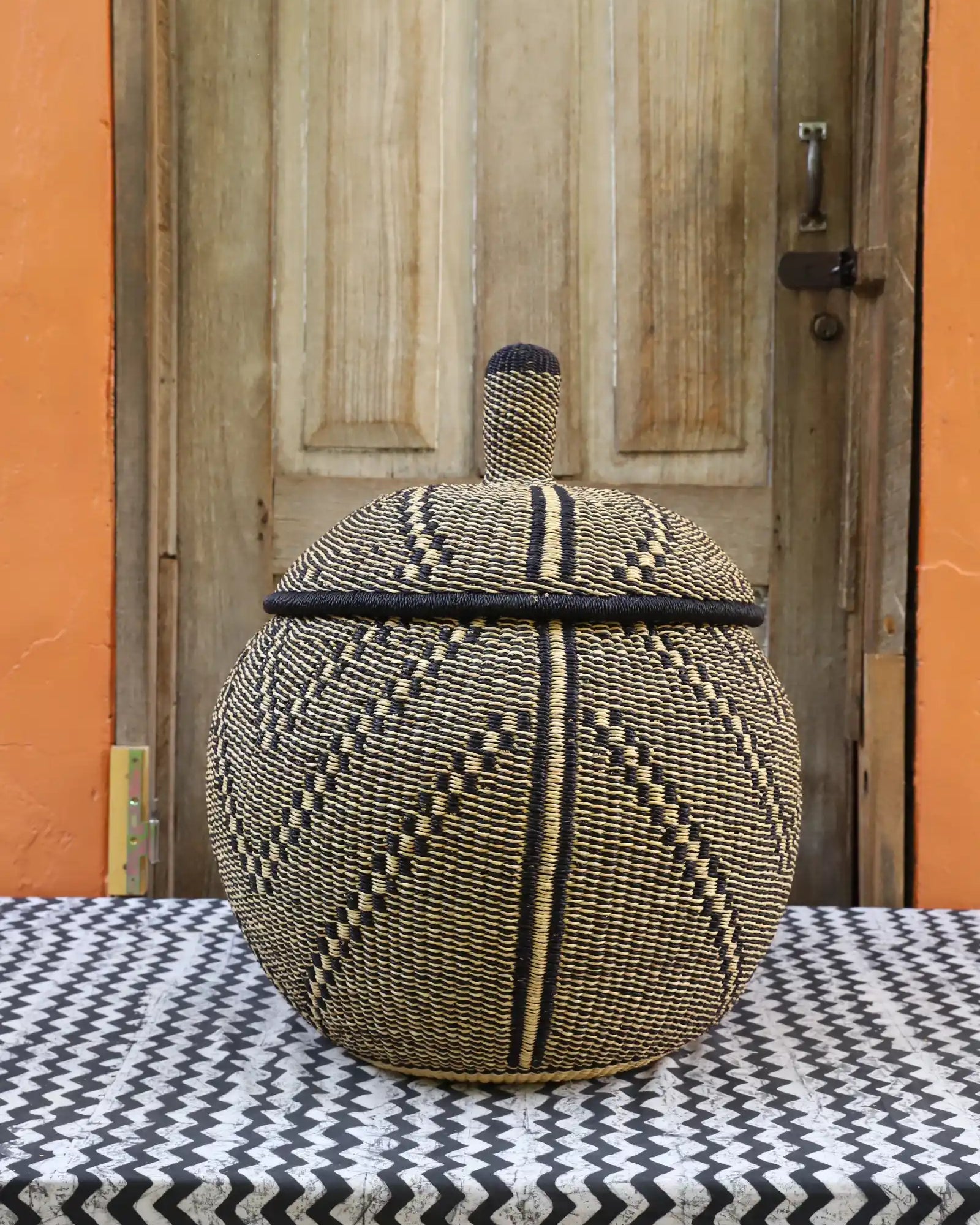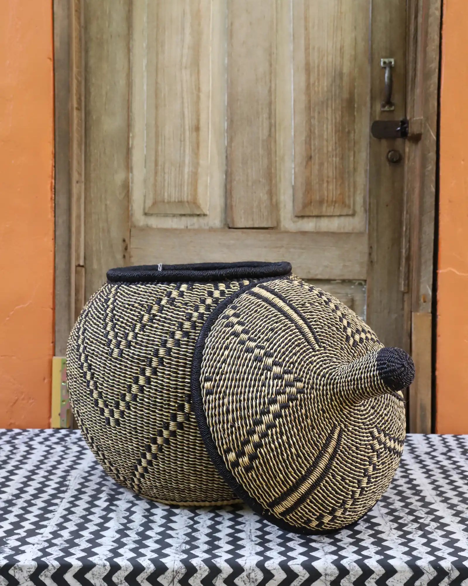 Also Known as Kuope-oh, Orbit was the trusted keeper of flour, salt, and other essentials for preparing TZ, a staple dish in Ghana. It's perfectly fitting lid made it ideal for gently storing ingredients. Orbit serves as a beautiful storage solution and decorative art piece, bringing tradition into the home while keeping spaces functional and graceful.