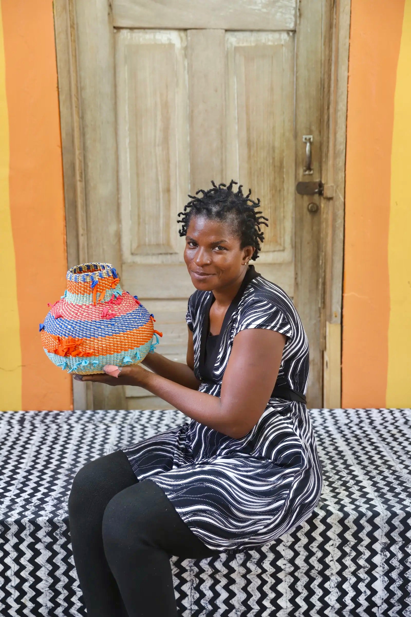 The Material Futures project blends our basketry tradition with upcycled textile waste from local markets. These reclaimed fabrics add fresh colors, textures, and bold details to create unique luxury baskets.