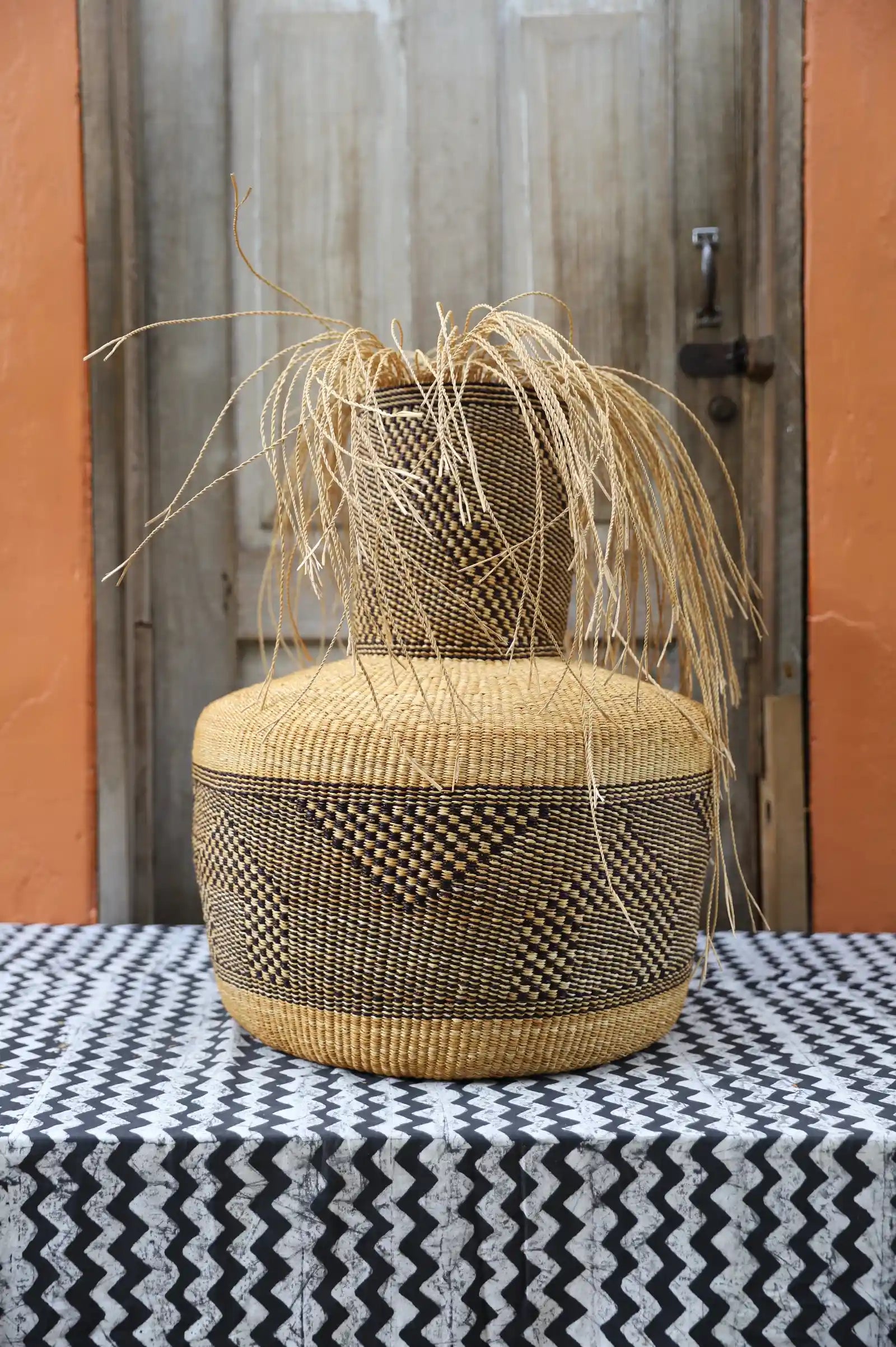 The weavers call it Tisanie Tia—the Strange Tree Basket. Inspired by the gnarled trees of the Sahel that twist and bend in dry heat and healing harvests, this sculptural form carries the spirit of the land. Bring one home and let it quietly tell its story.