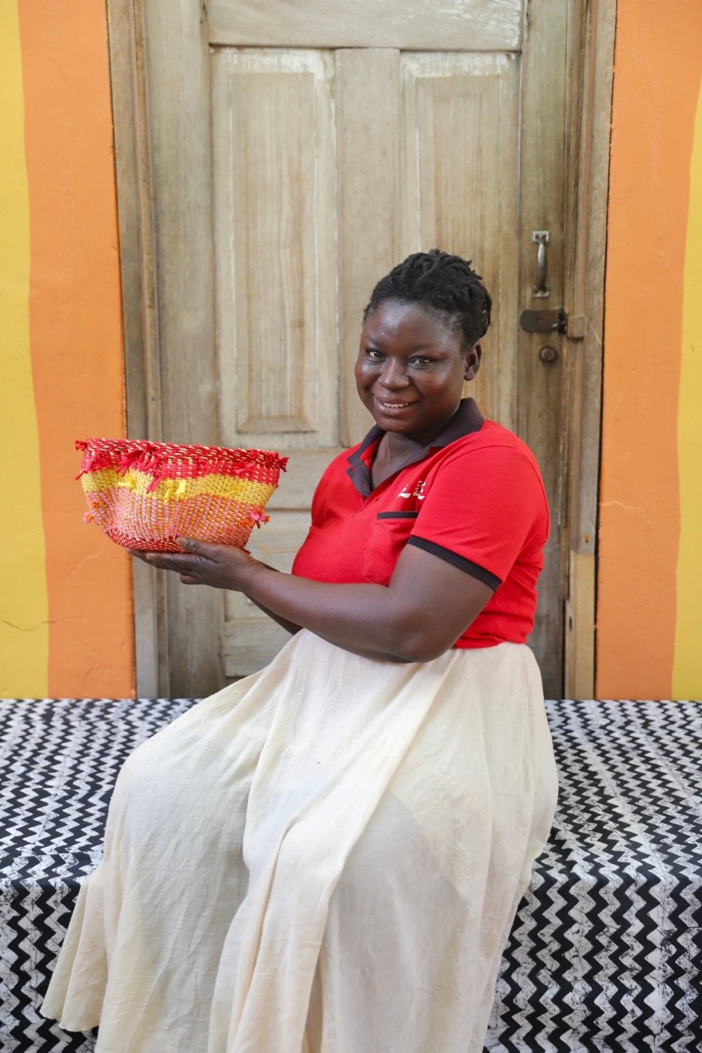 The Material Futures project blends our basketry tradition with upcycled textile waste from local markets. These reclaimed fabrics add fresh colors, textures, and bold details to create unique luxury baskets.