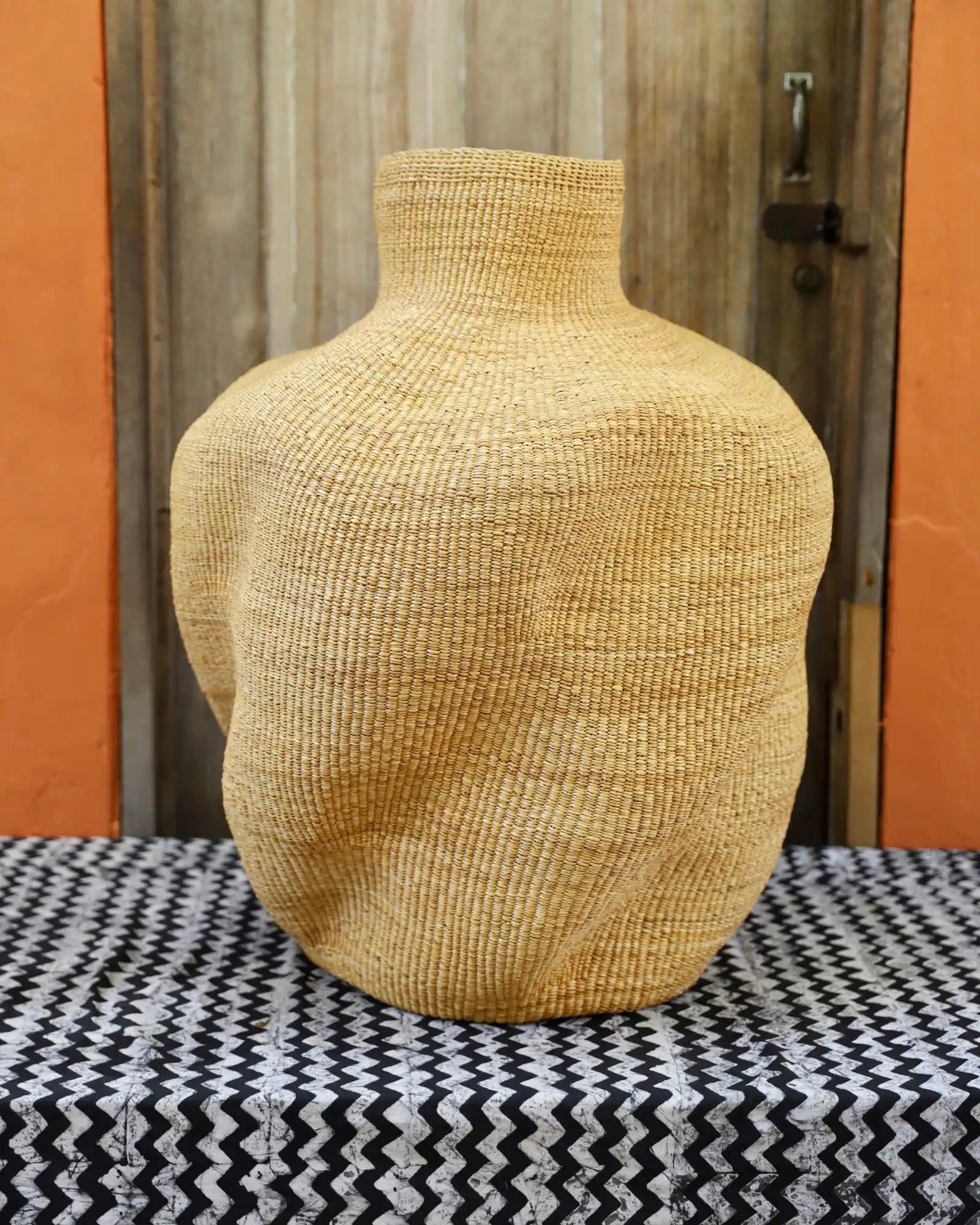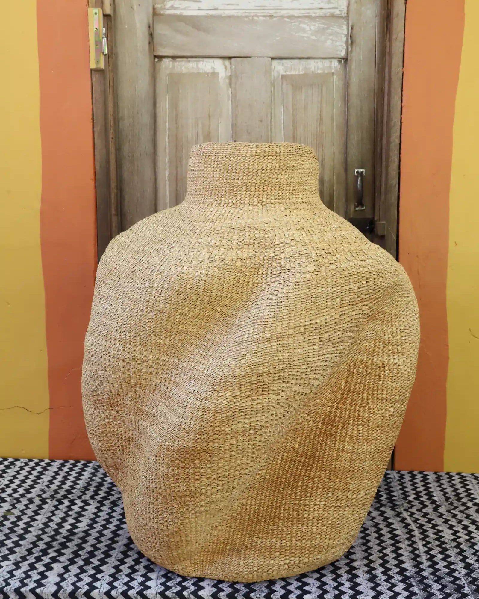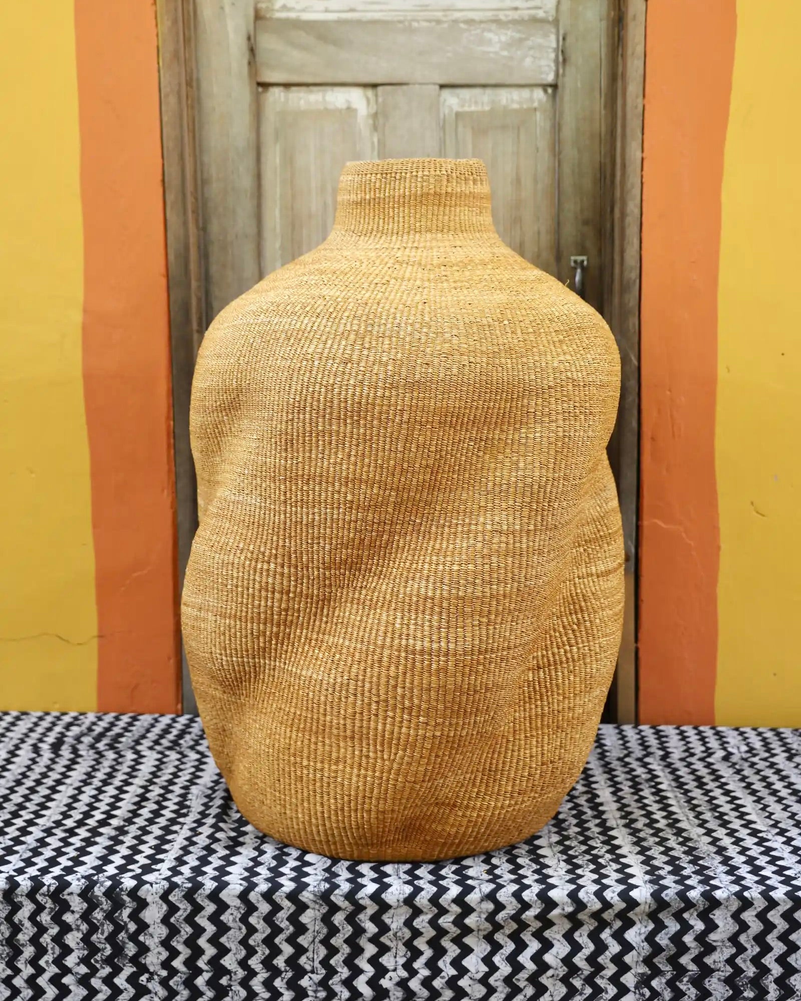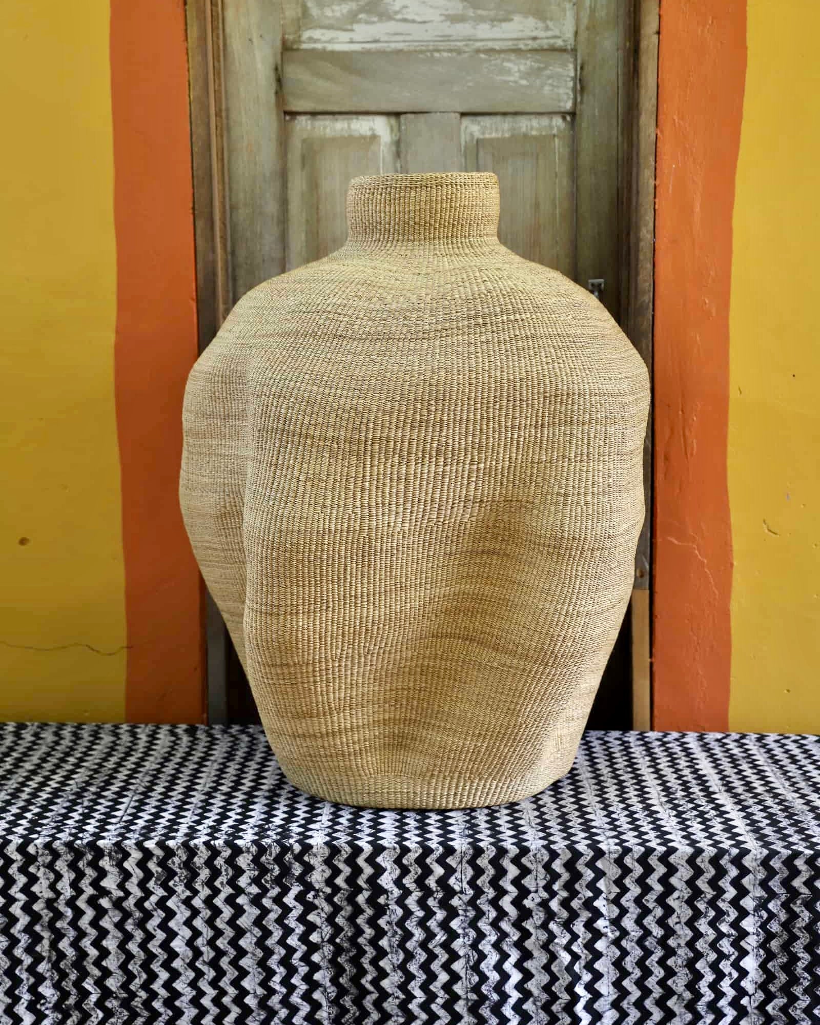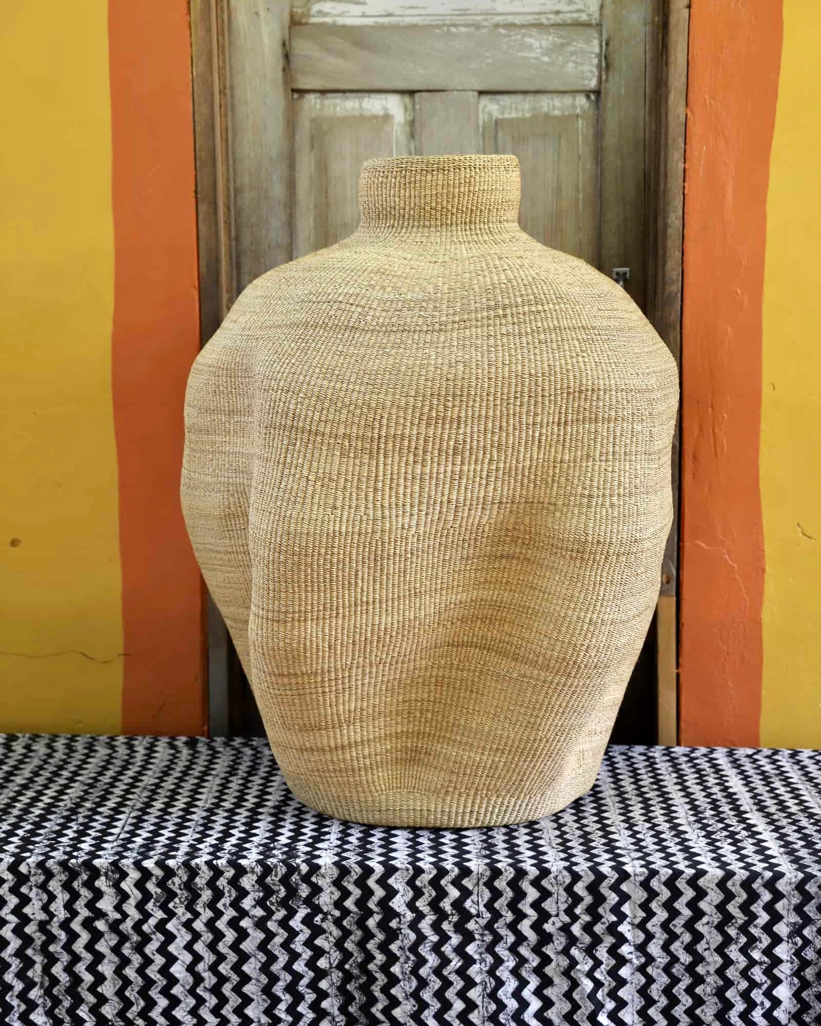 Slowly woven in our signature “Wave” design, these oversized specialty baskets are sculptural statements crafted from natural elephant grass. Each curve carries the handprint of its Master Weaver—perfect as a pair in a foyer or standing solo. Quiet drama. Functional art. Always one of a kind.