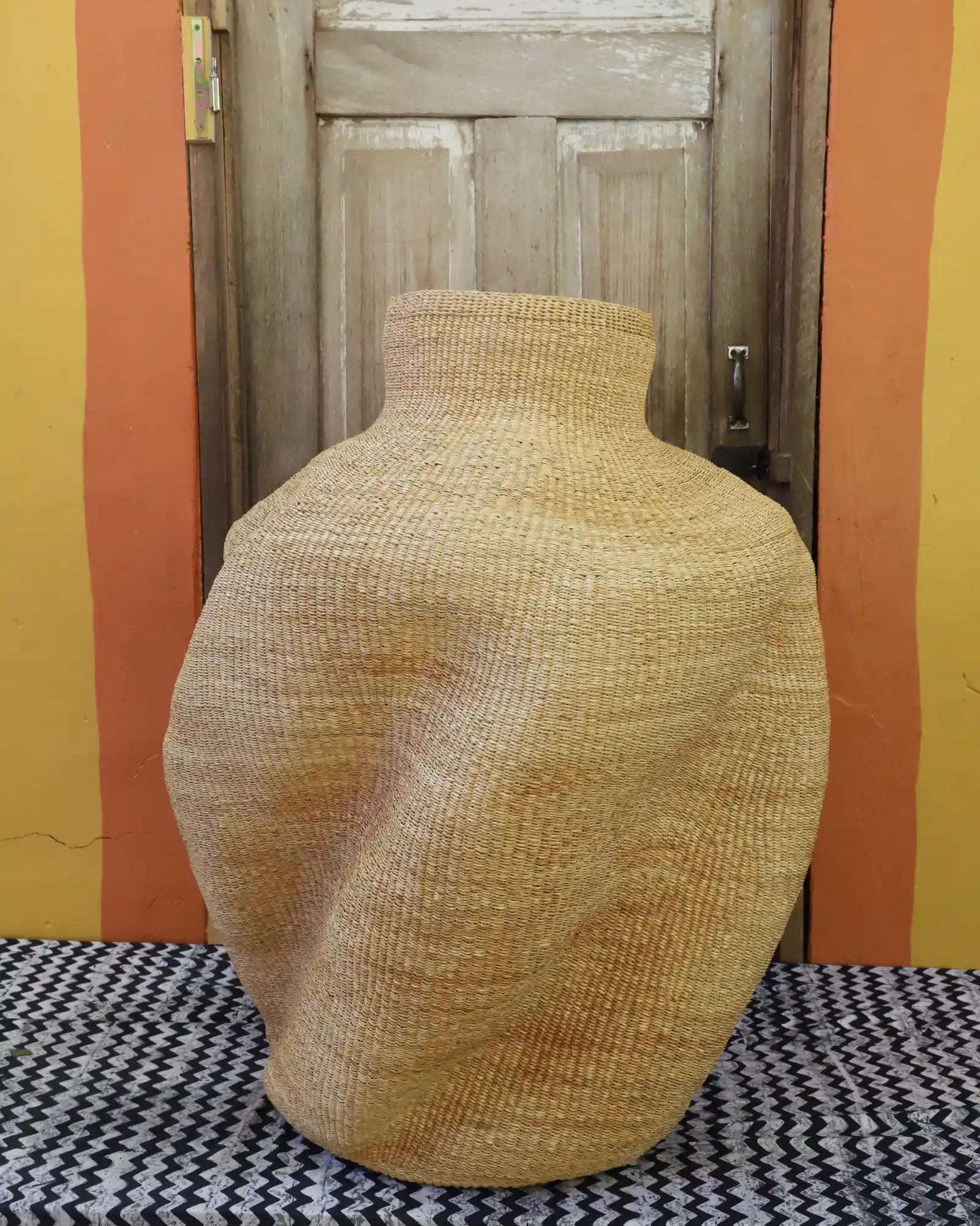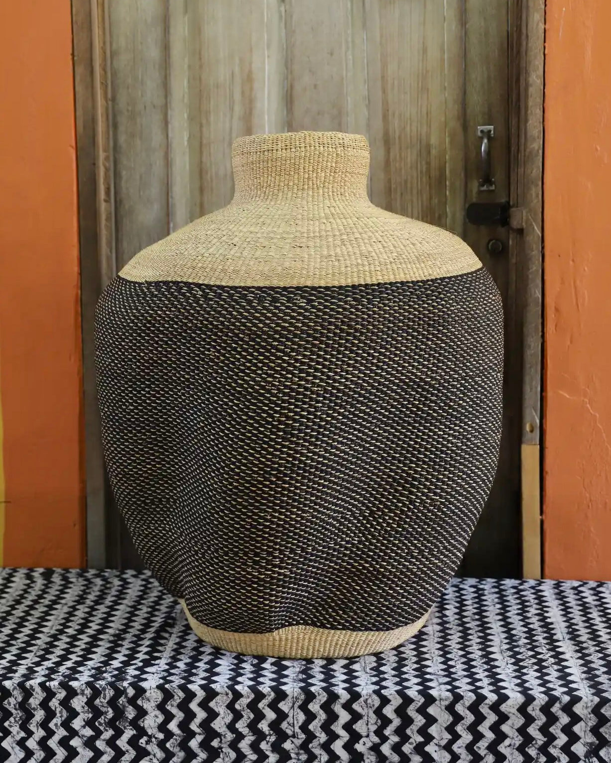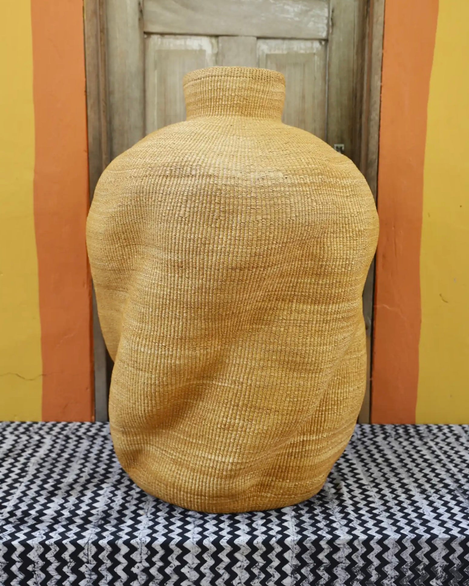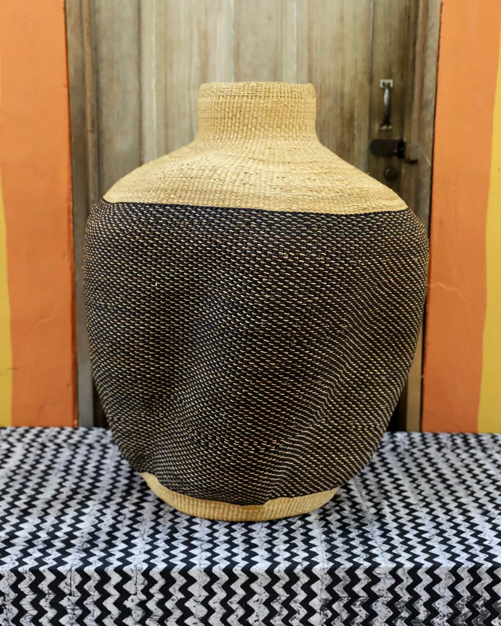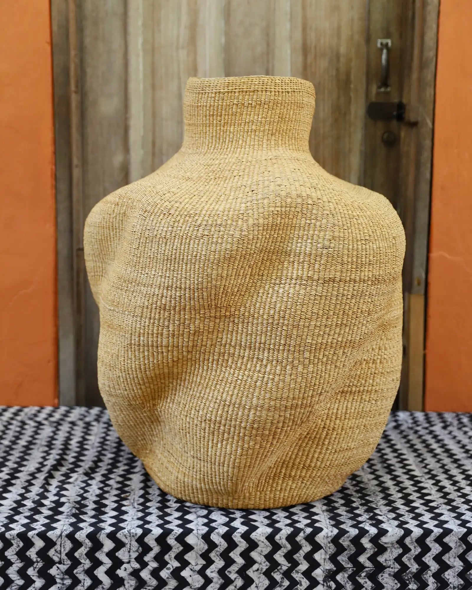 Slowly woven in our signature “Wave” design, these oversized specialty baskets are sculptural statements crafted from natural elephant grass. Each curve carries the handprint of its Master Weaver—perfect as a pair in a foyer or standing solo. Quiet drama. Functional art. Always one of a kind.