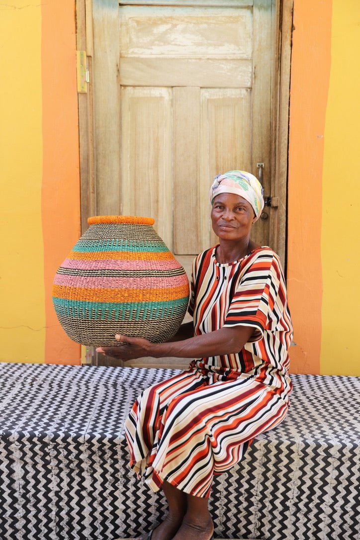 Kenkia, meaning a large water-carrying gourd in Gurune, the language of Ghana’s Gurunsi people is the inspiration behind this full-bodied basket. Though simple in design, its elegant proportions demand the skill of an expert weaver. A true art piece, the Kenkia basket doubles as a stunning woven vase—just add a glass jar for fresh flowers or garden finds.