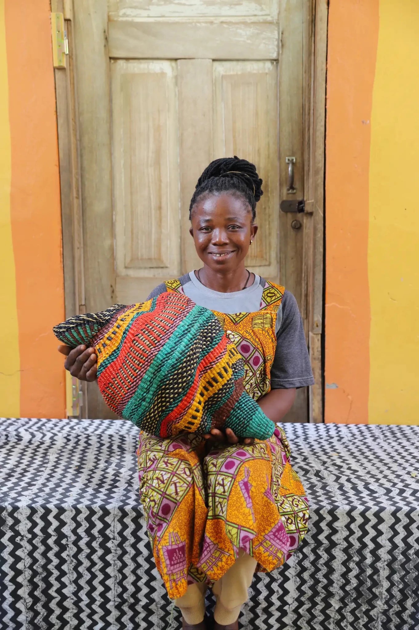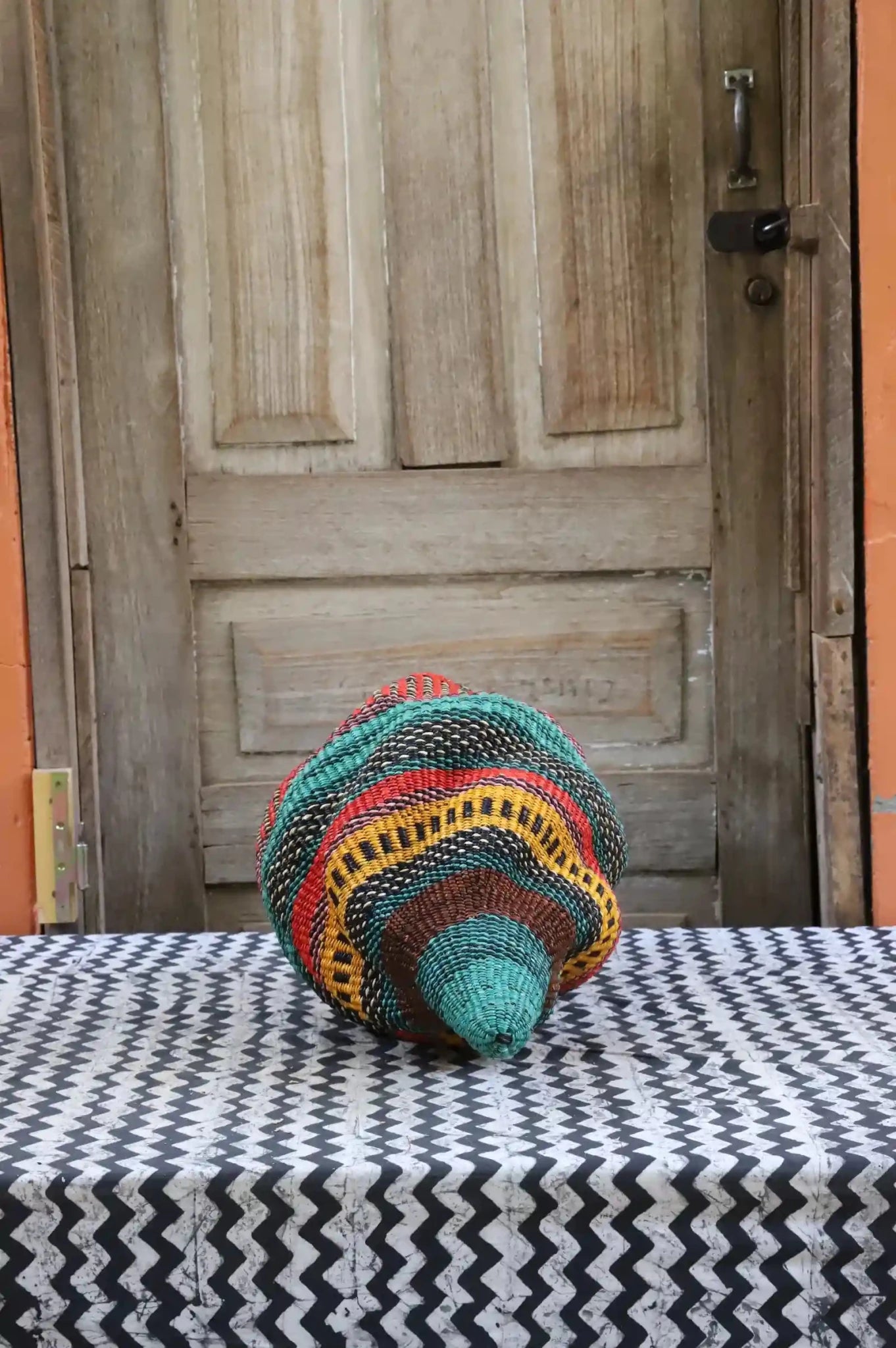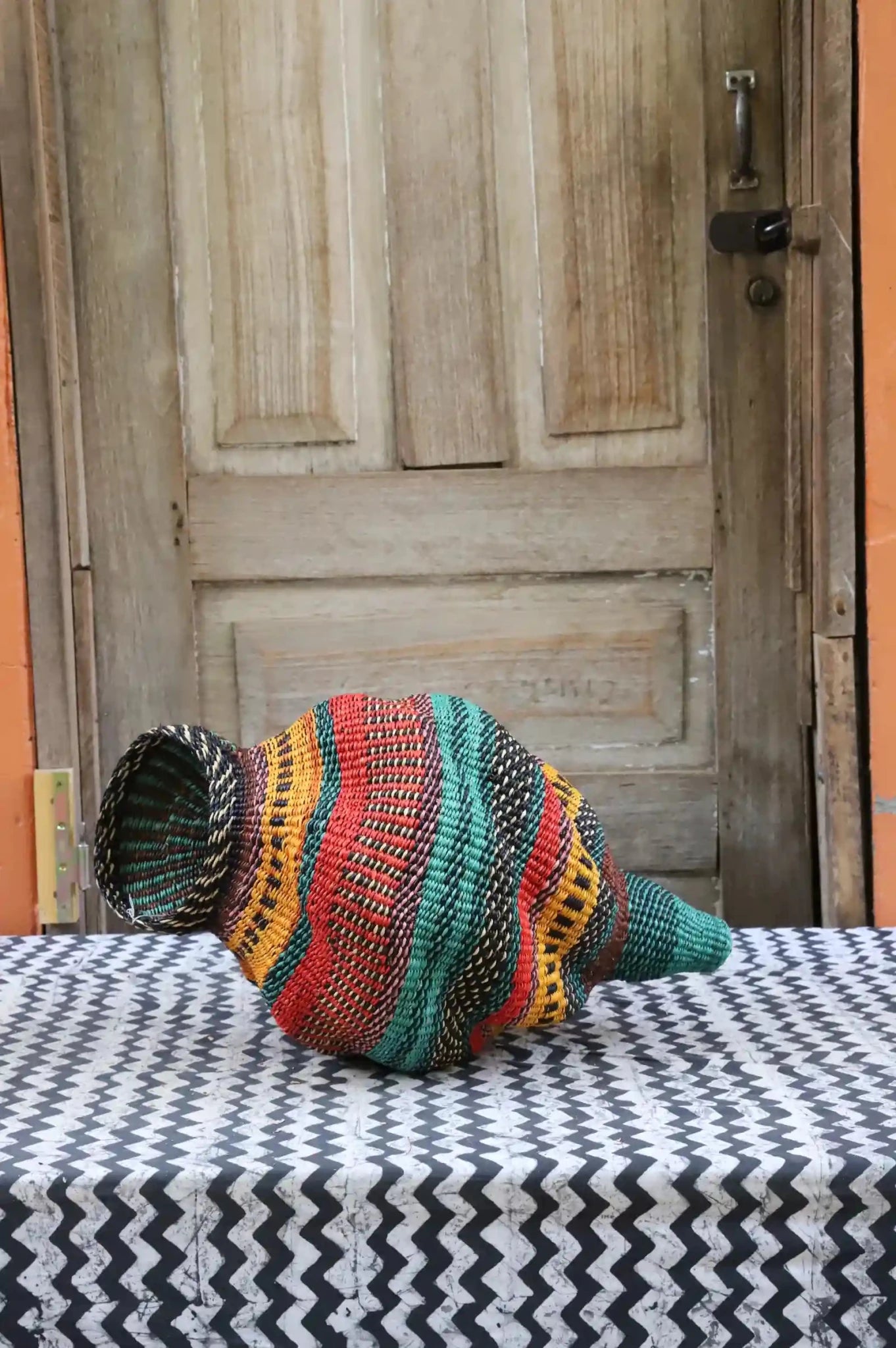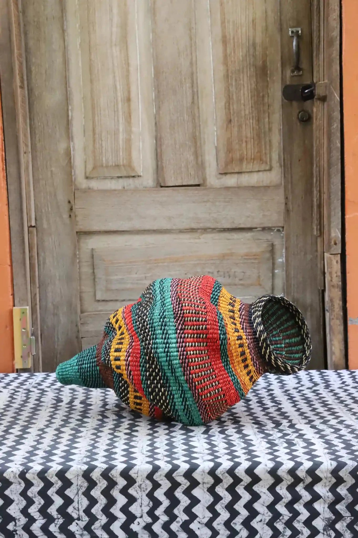Katayeli-tia (Conch), known as the snail basket in Gurune, is an ode to the feminine. Crafted by artisan Perpetual over 3 1⁄2 weeks, its exquisite spiral design captivates with multi-dimensional beauty. Perfect as a striking statement in an entrance or overlooking the ocean in your beach home.