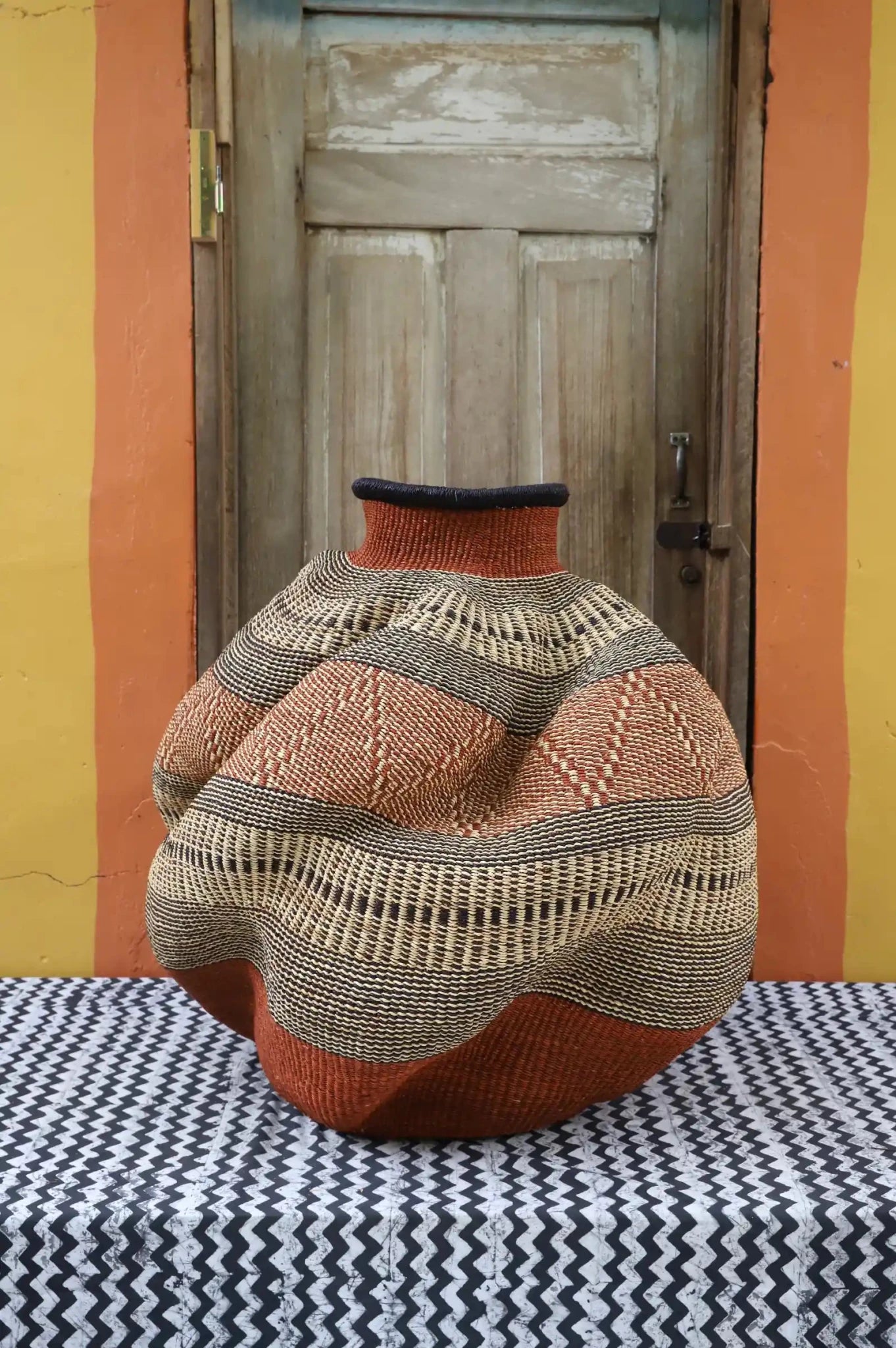 In the Gurune language of Ghana’s Upper East Region, De-engo means ‘a meeting of chiefs.’ These vibrant gatherings are filled with color, conversation, music, and dance. Our artisan weaver beautifully captures this spirit in the basket’s twisting form and striking use of color. Exclusive to The Baba Tree, this one-of-a-kind piece is perfect for the discerning collector.
