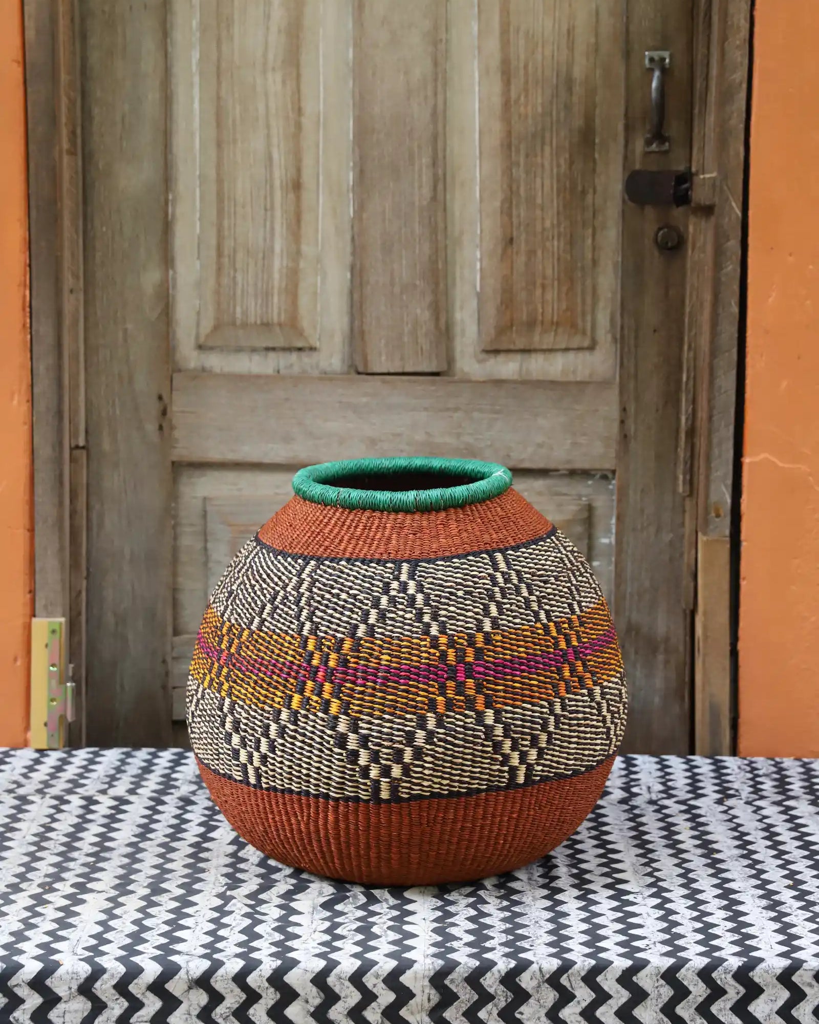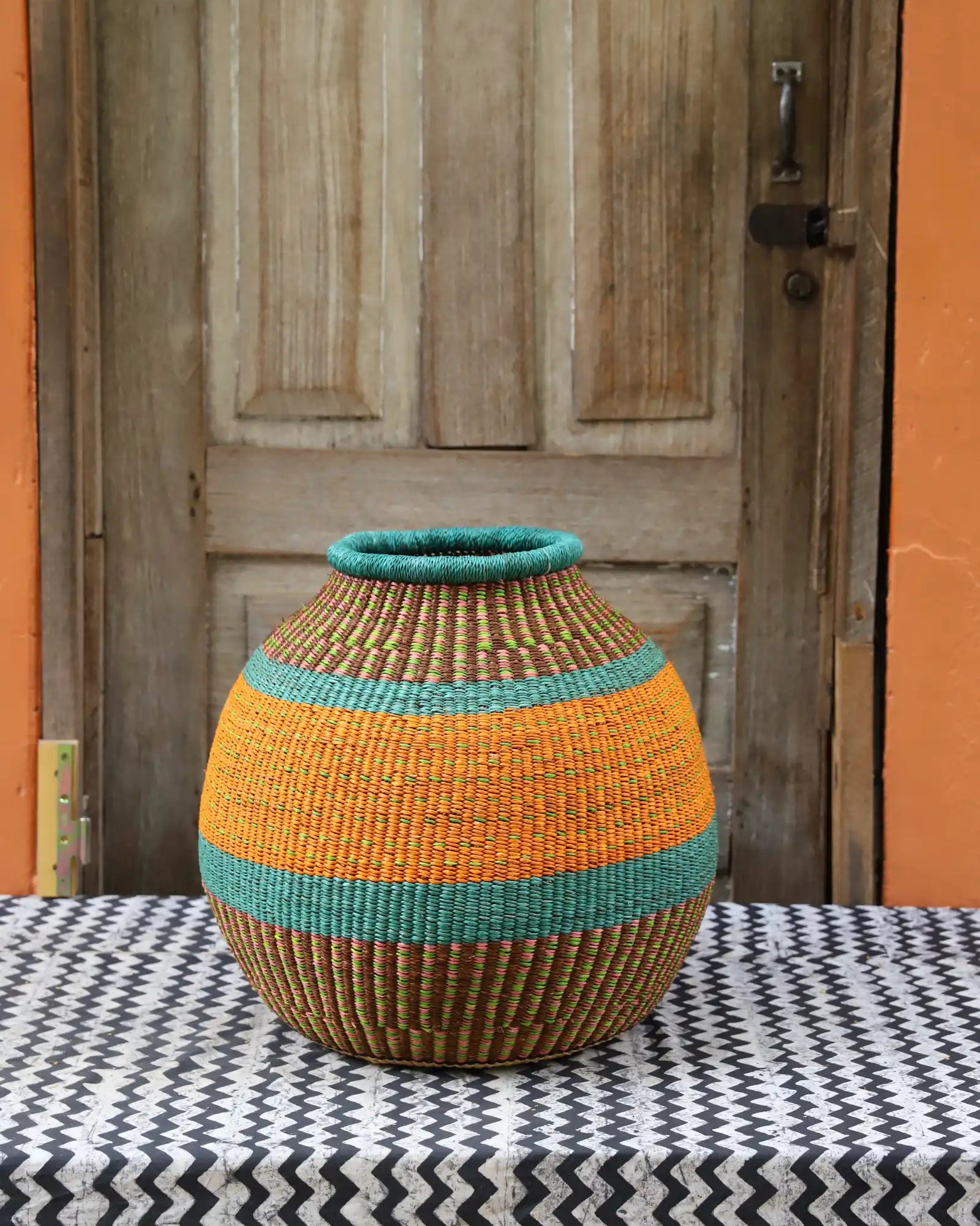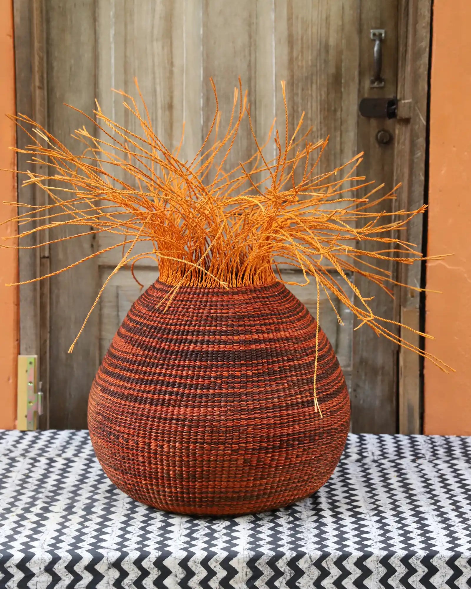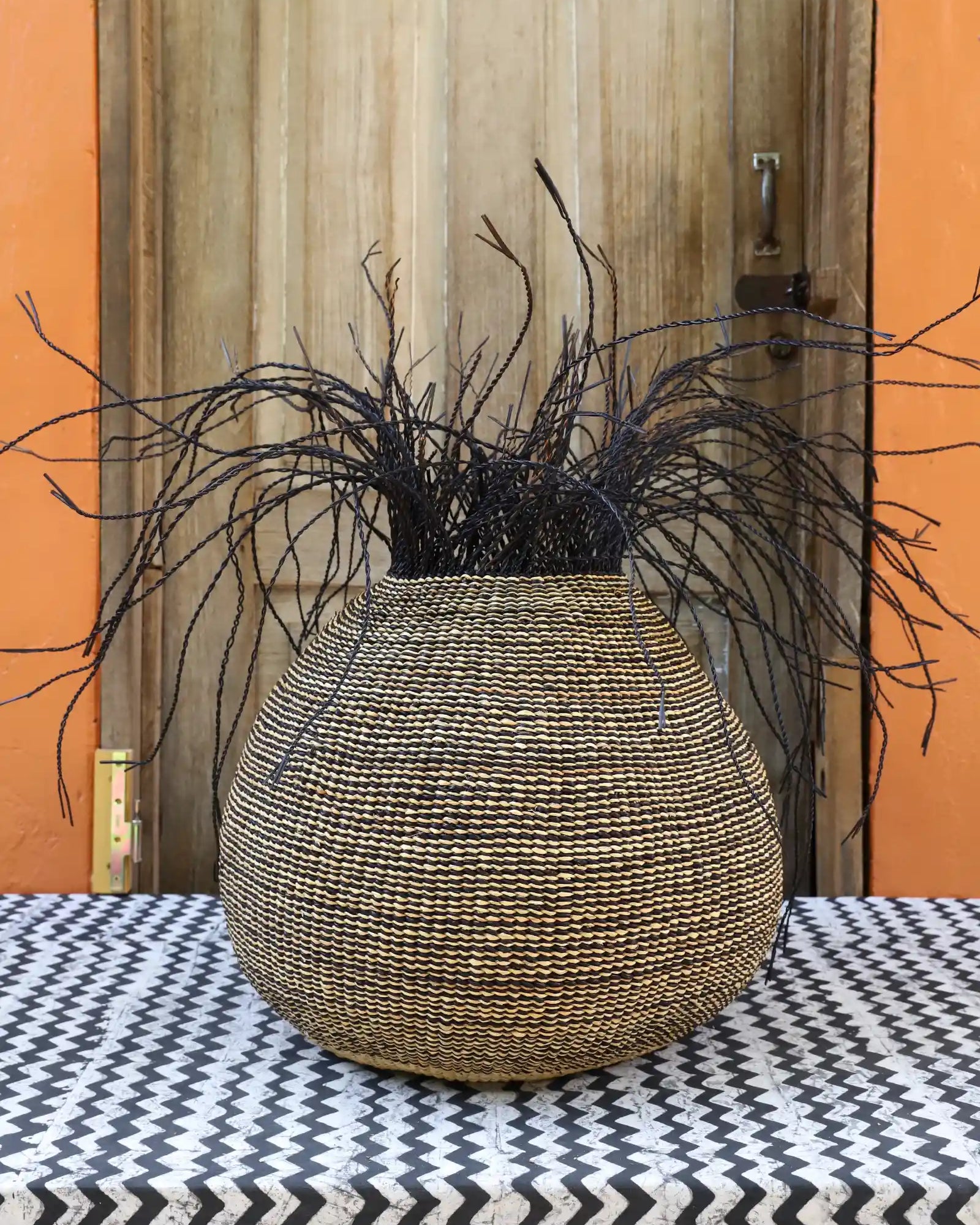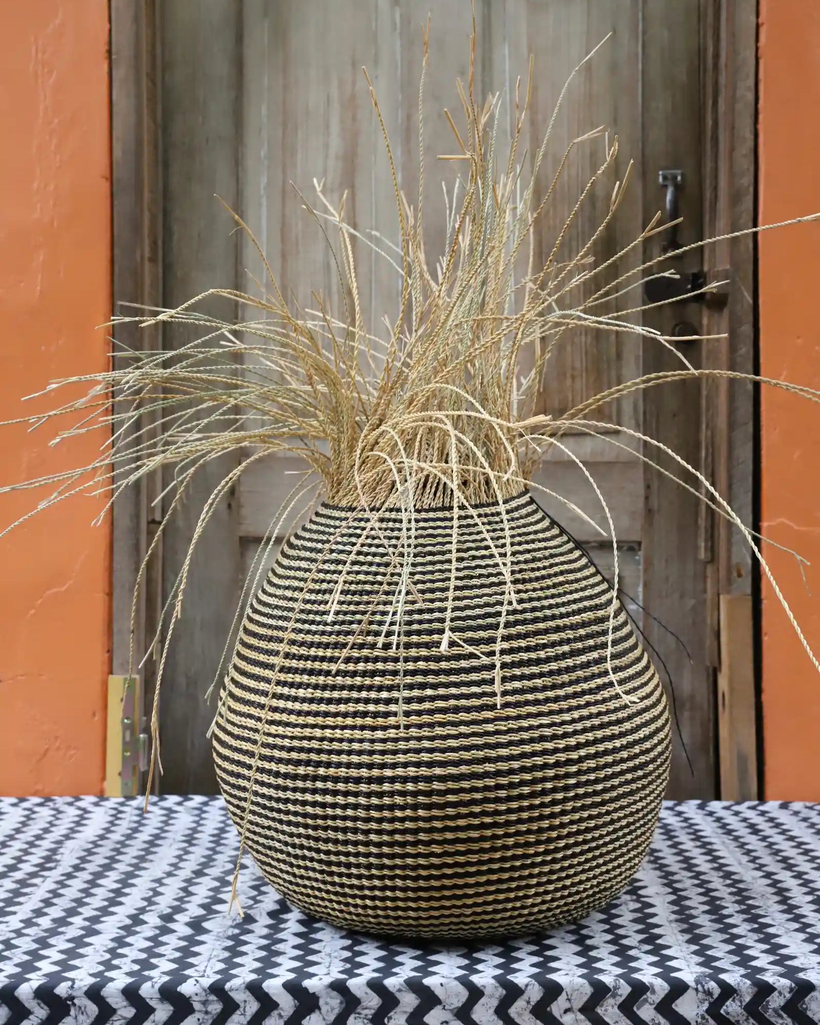 Kenkia, meaning a large water-carrying gourd in Gurune, the language of Ghana’s Gurunsi people is the inspiration behind this full-bodied basket. Though simple in design, its elegant proportions demand the skill of an expert weaver. A true art piece, the Kenkia basket doubles as a stunning woven vase—just add a glass jar for fresh flowers or garden finds.