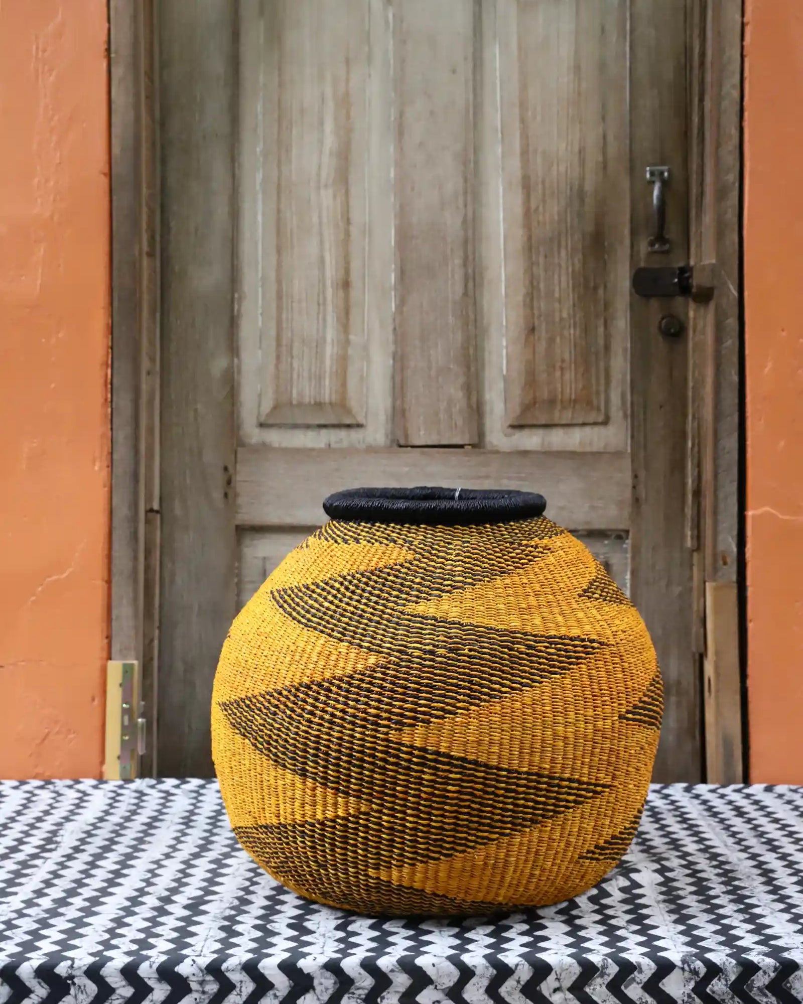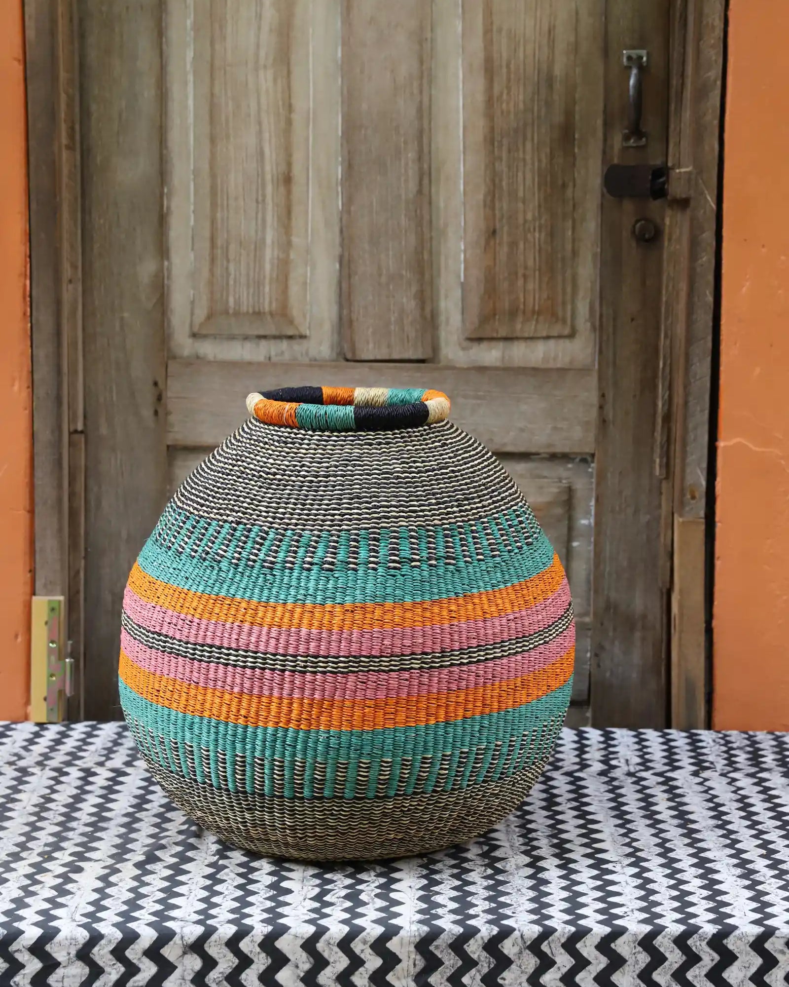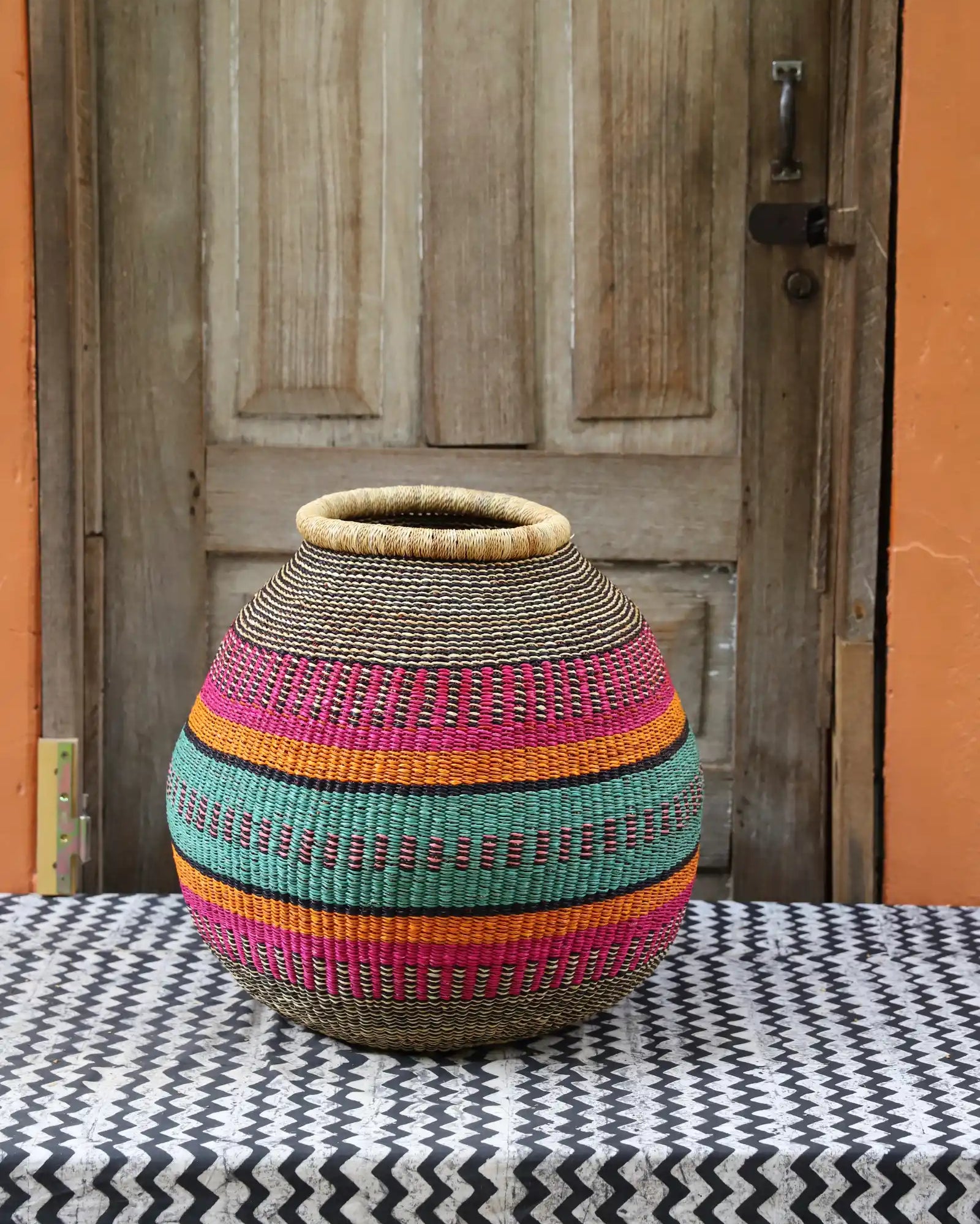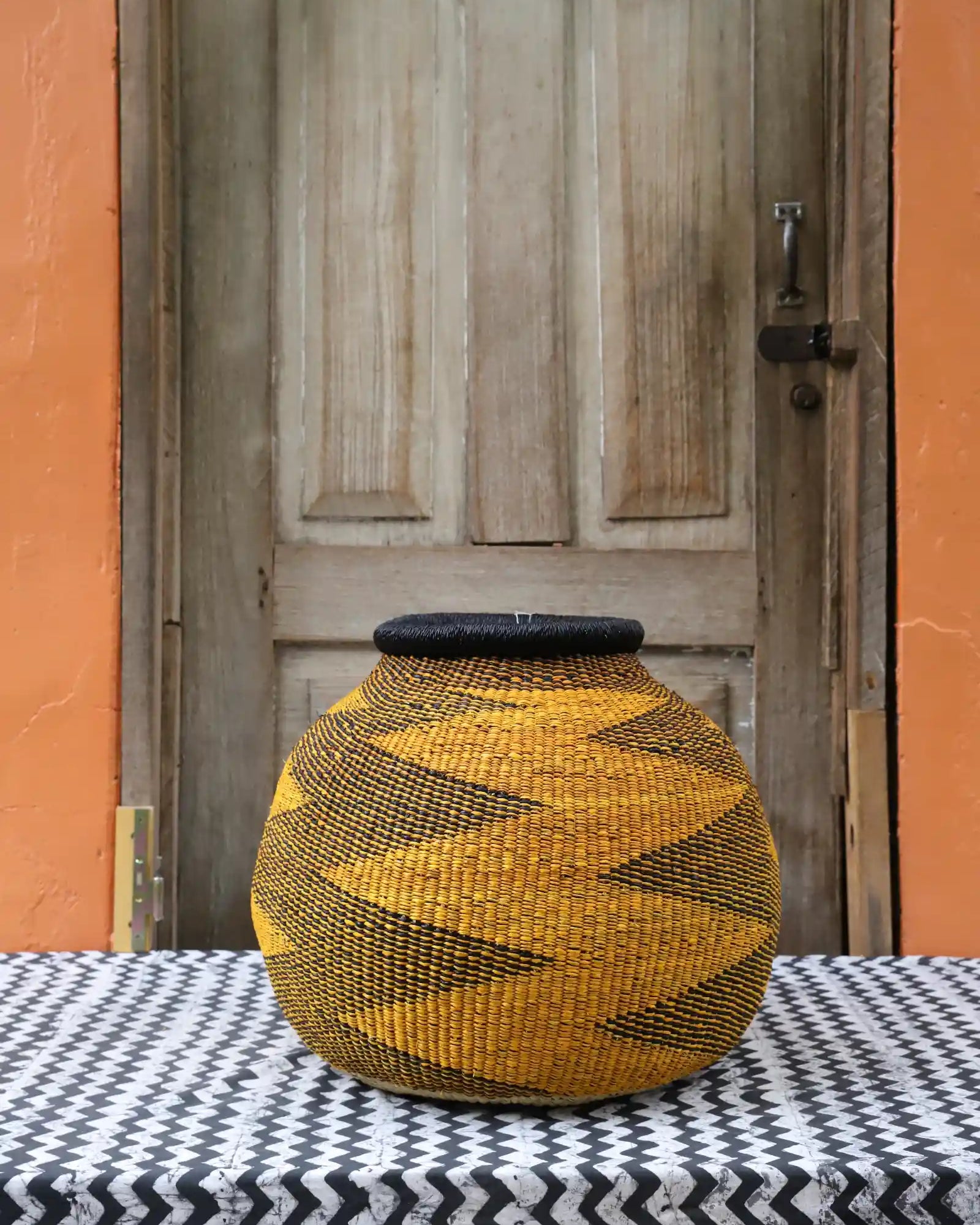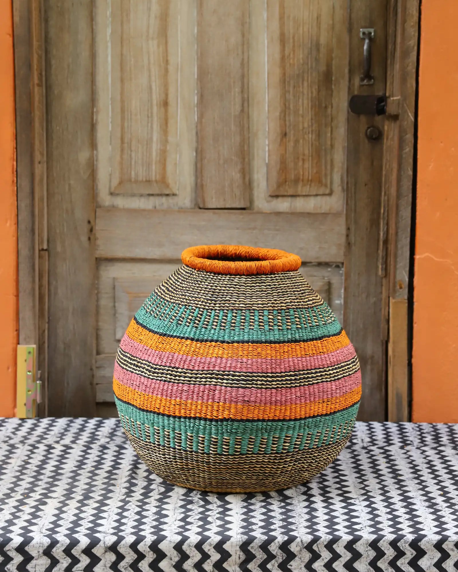 Kenkia, meaning a large water-carrying gourd in Gurune, the language of Ghana’s Gurunsi people is the inspiration behind this full-bodied basket. Though simple in design, its elegant proportions demand the skill of an expert weaver. A true art piece, the Kenkia basket doubles as a stunning woven vase—just add a glass jar for fresh flowers or garden finds.