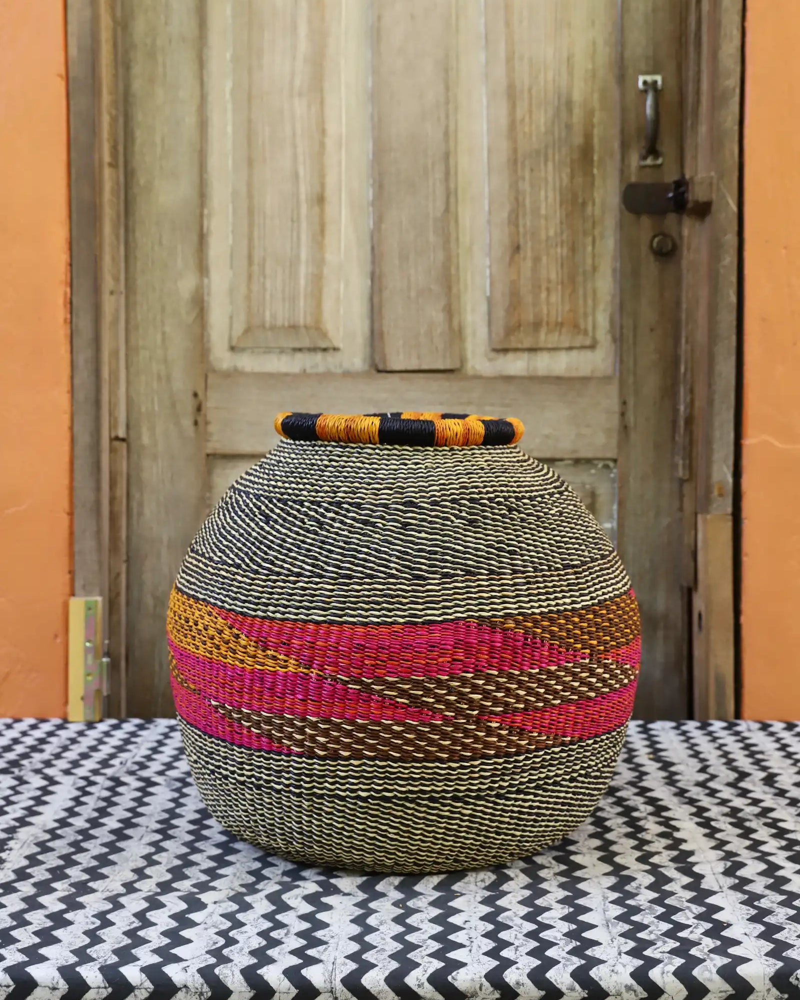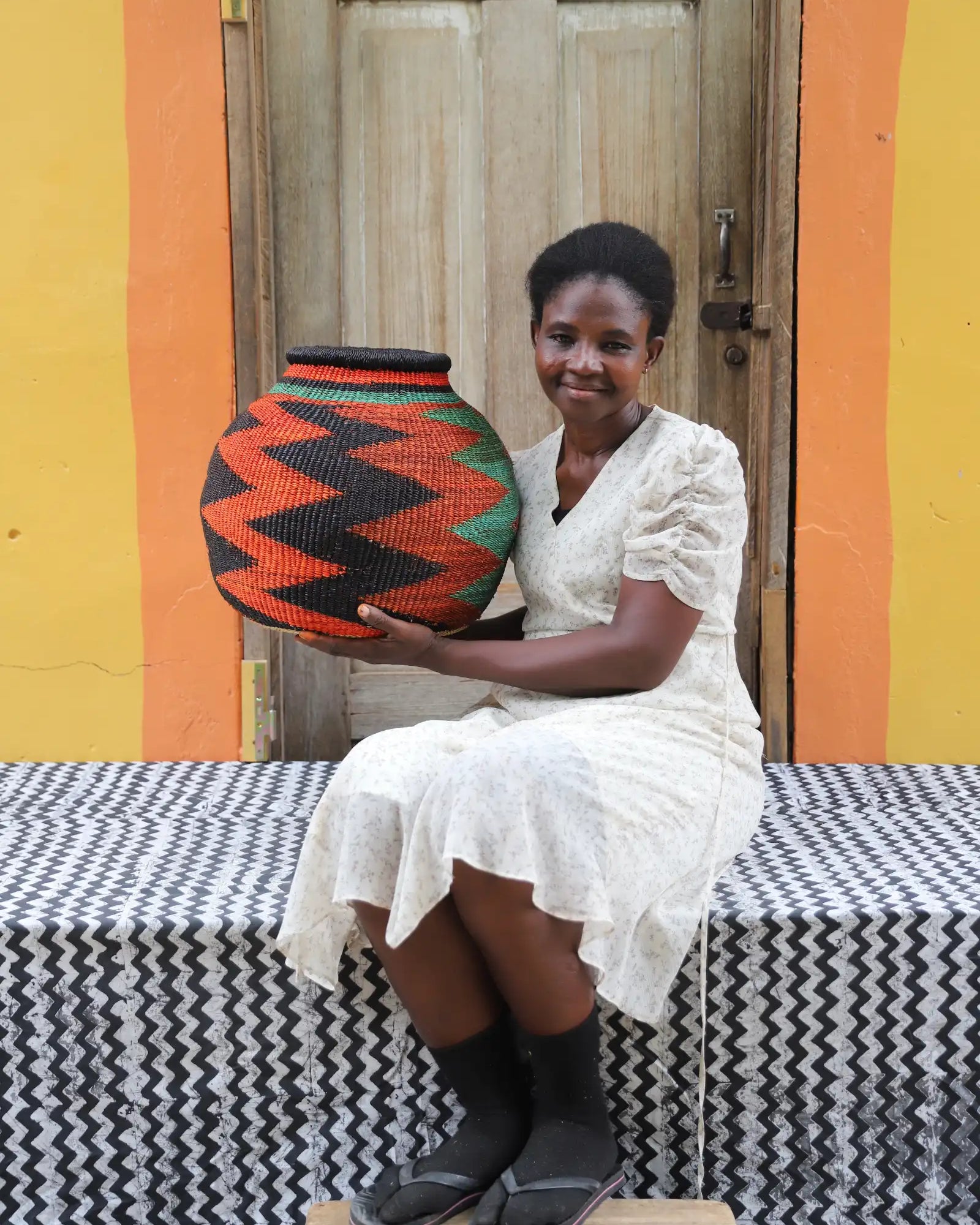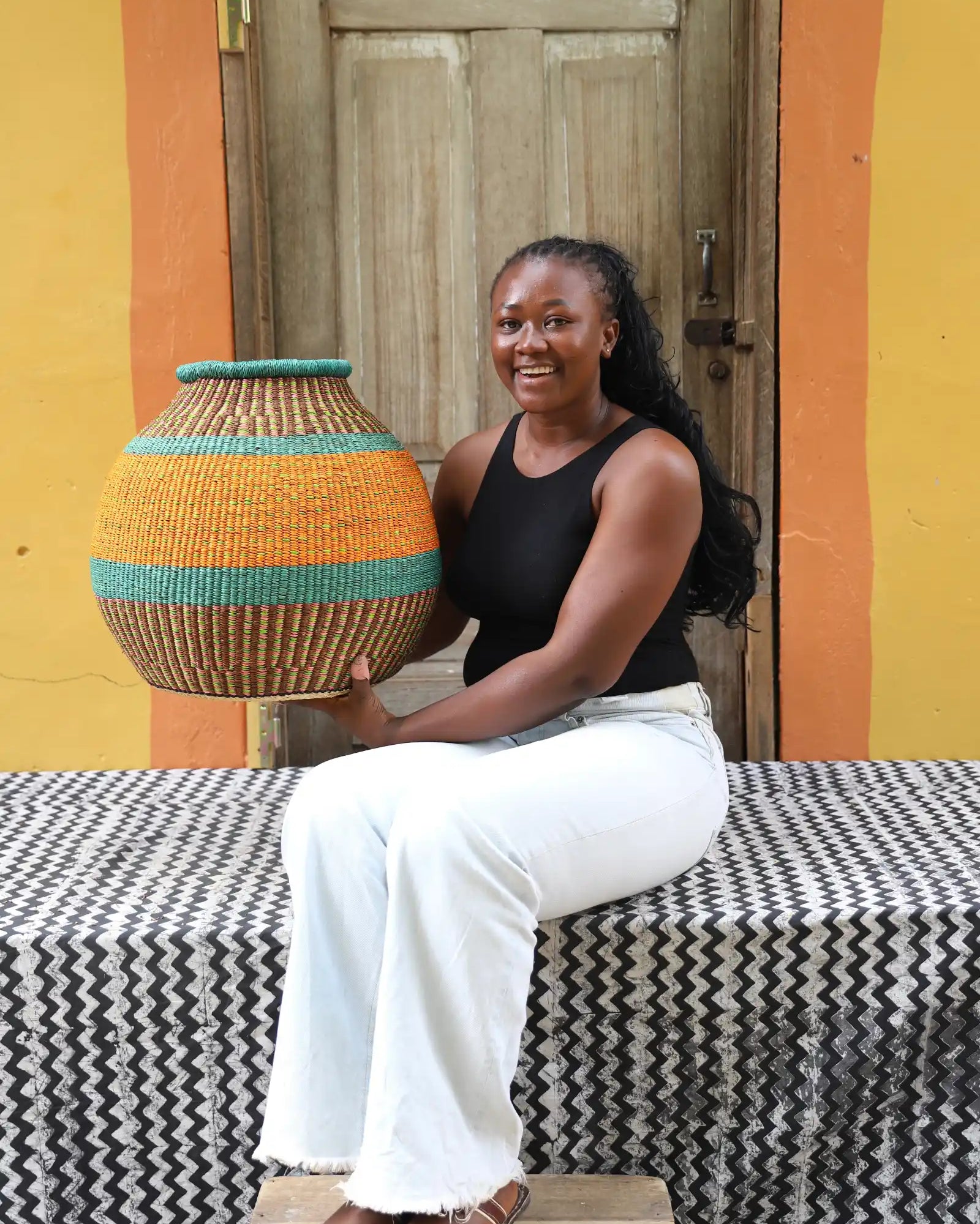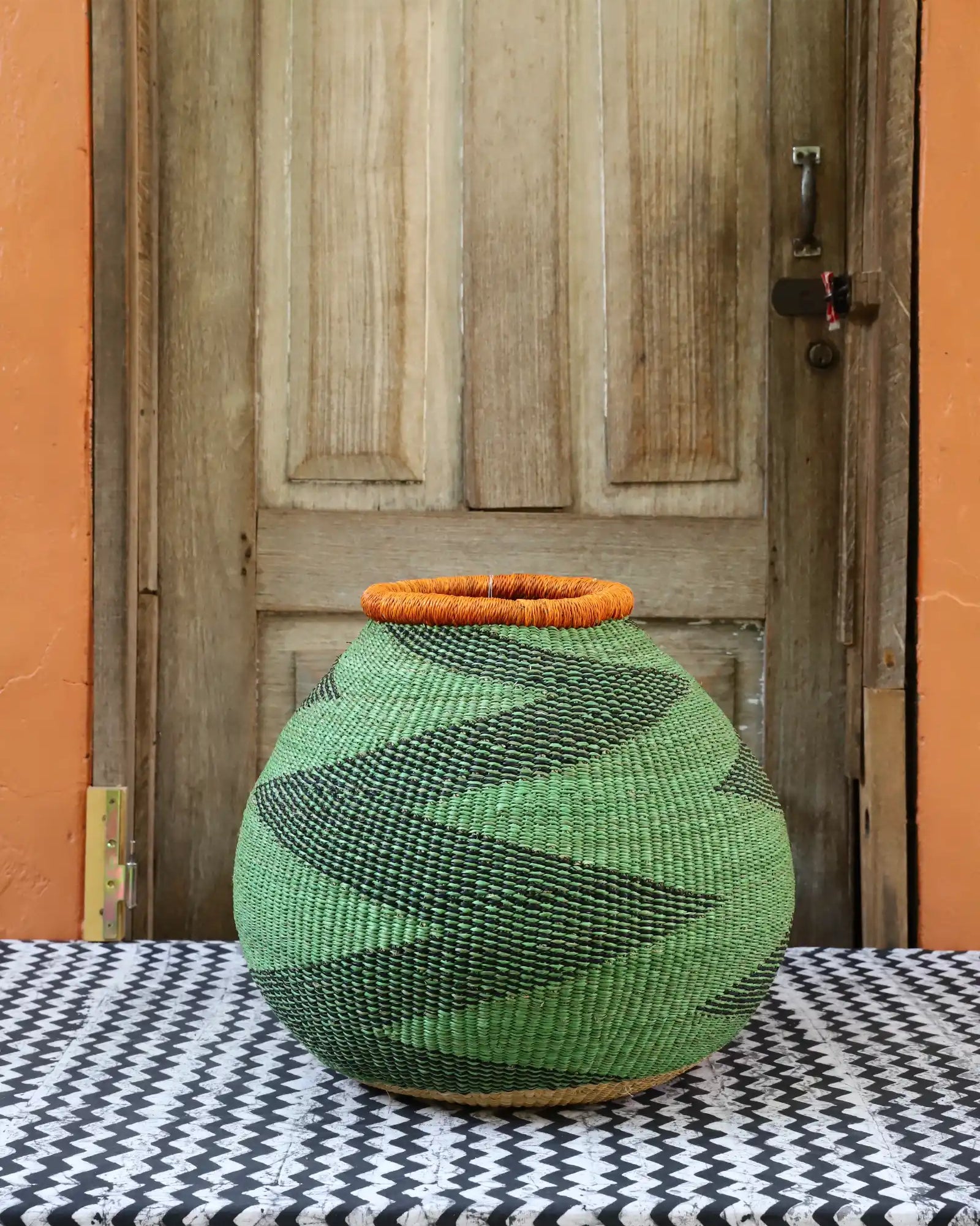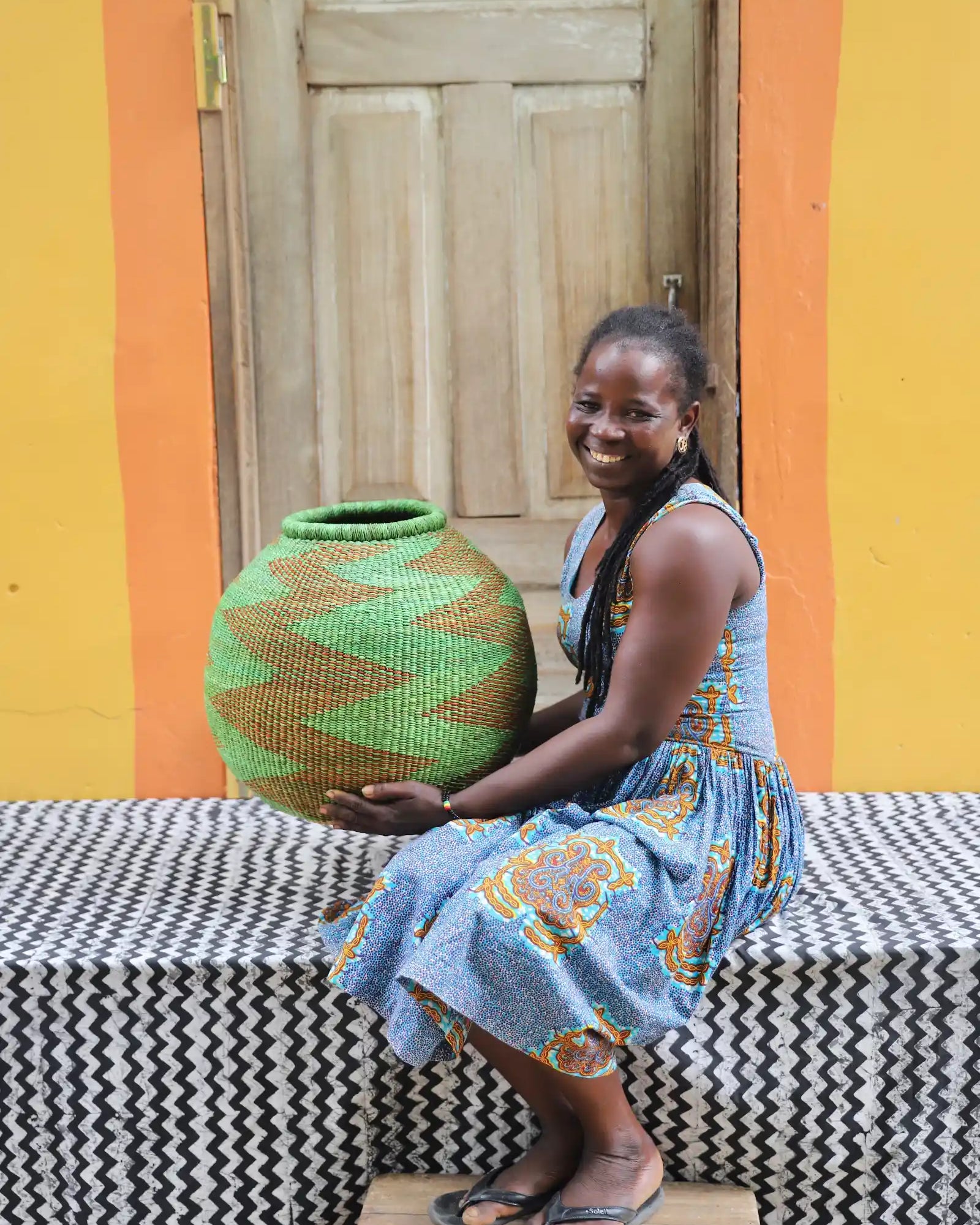 Kenkia, meaning a large water-carrying gourd in Gurune, the language of Ghana’s Gurunsi people is the inspiration behind this full-bodied basket. Though simple in design, its elegant proportions demand the skill of an expert weaver. A true art piece, the Kenkia basket doubles as a stunning woven vase—just add a glass jar for fresh flowers or garden finds.