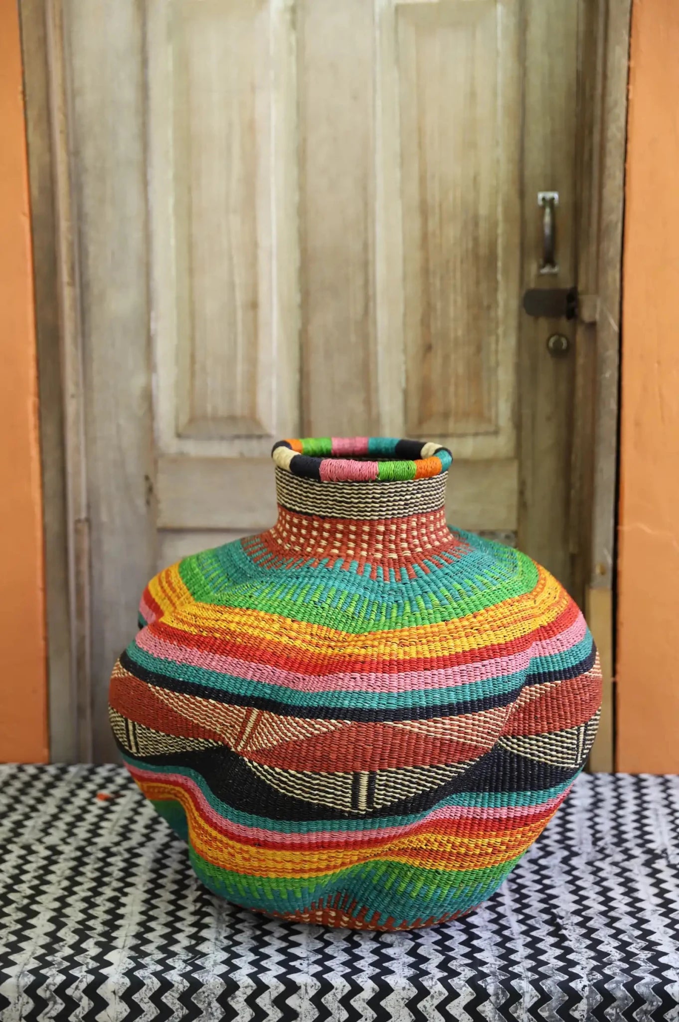 In the Gurune language of Ghana’s Upper East Region, De-engo means ‘a meeting of chiefs.’ These vibrant gatherings are filled with color, conversation, music, and dance. Our artisan weaver beautifully captures this spirit in the basket’s twisting form and striking use of color. Exclusive to The Baba Tree, this one-of-a-kind piece is perfect for the discerning collector.