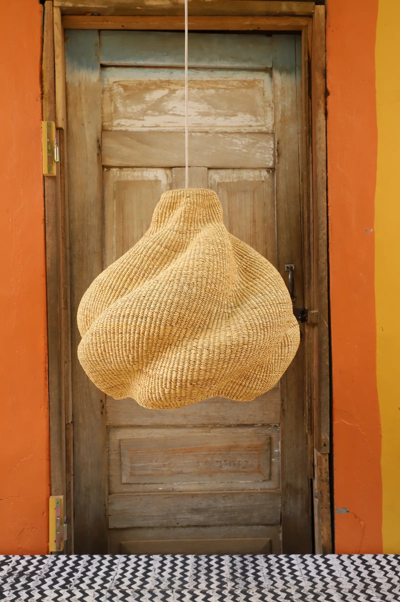 Woven Cloud is a sculptural lampshade handwoven from elephant grass, designed to soften light into a warm, calming glow. Its flowing silhouette brings quiet character to a space, with a refined woven surface that adds natural texture.