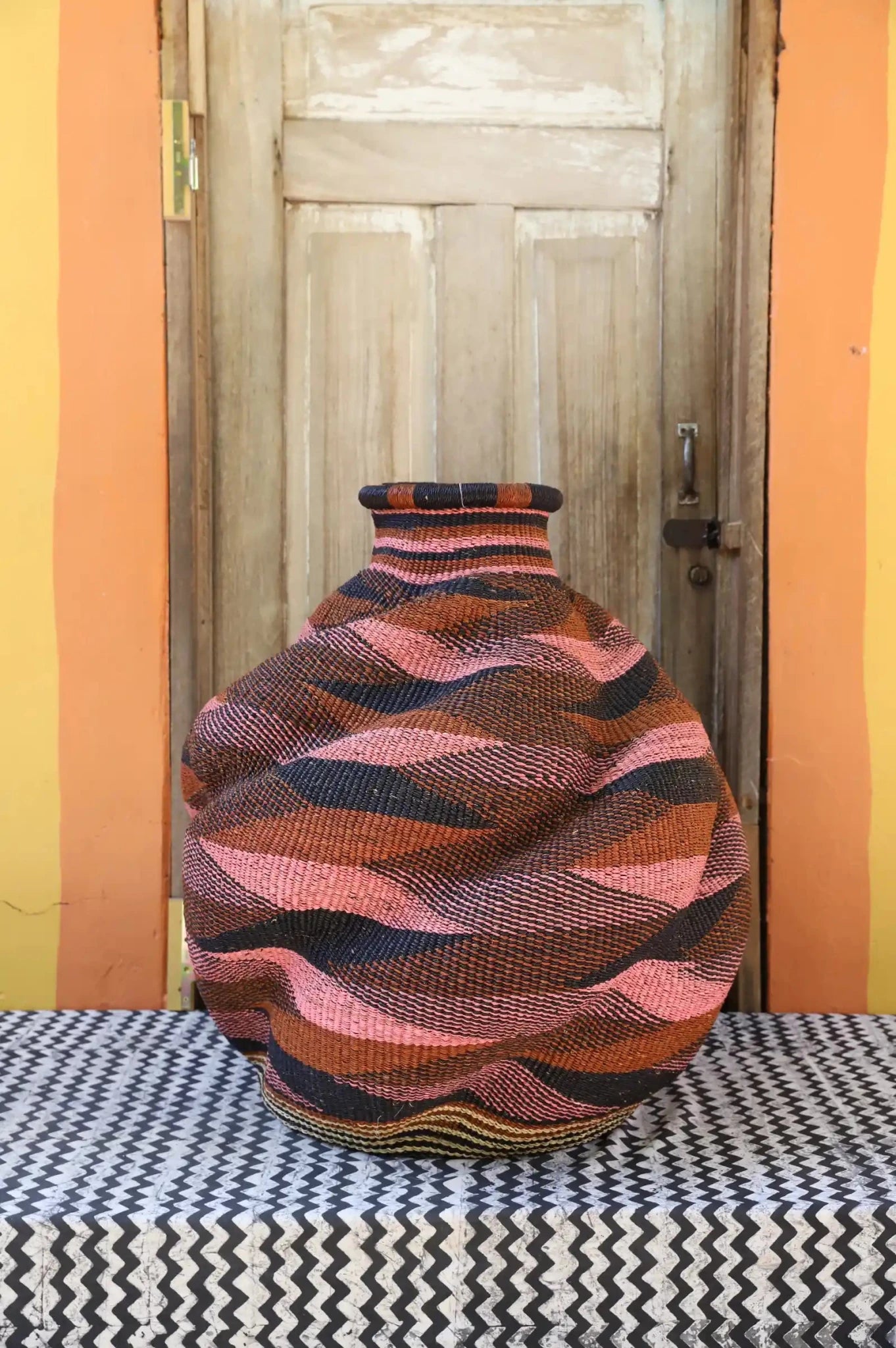 In the Gurune language of Ghana’s Upper East Region, De-engo means ‘a meeting of chiefs.’ These vibrant gatherings are filled with color, conversation, music, and dance. Our artisan weaver beautifully captures this spirit in the basket’s twisting form and striking use of color. Exclusive to The Baba Tree, this one-of-a-kind piece is perfect for the discerning collector.