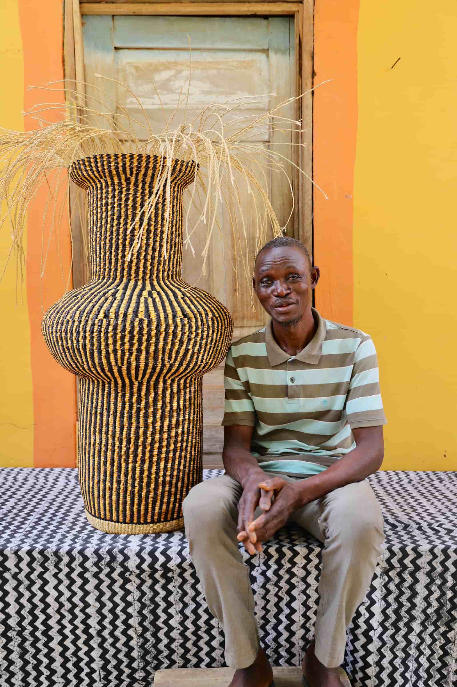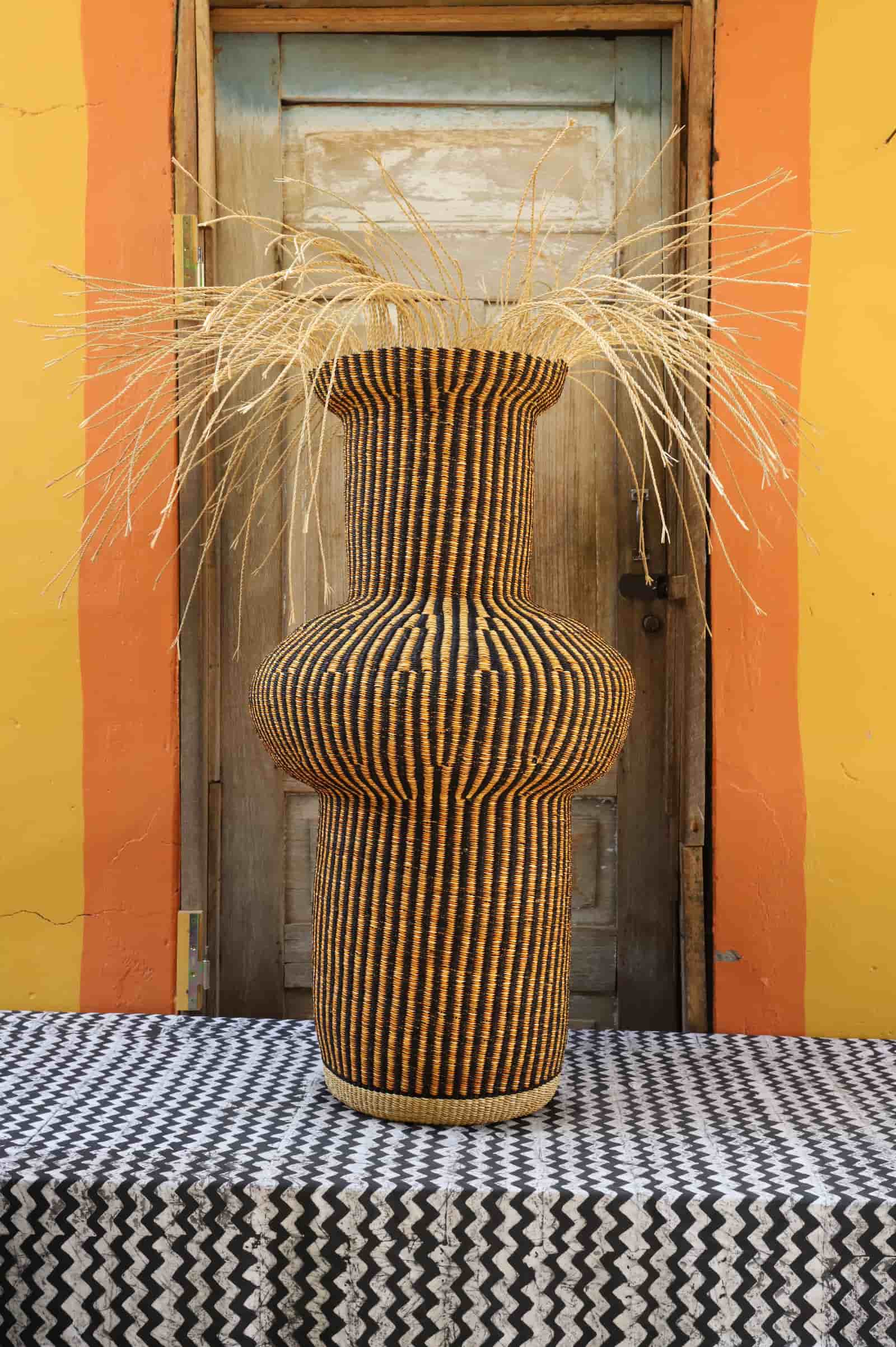 Dugla is a small, pot-like vessel traditionally used to store shea butter. Inspired by the Gurunsi’s shea butter-making rituals, the Tall Dugla basket is an art sculpture in its own right—or insert a glass jar to transform it into a woven vase for fresh flowers or garden greens.