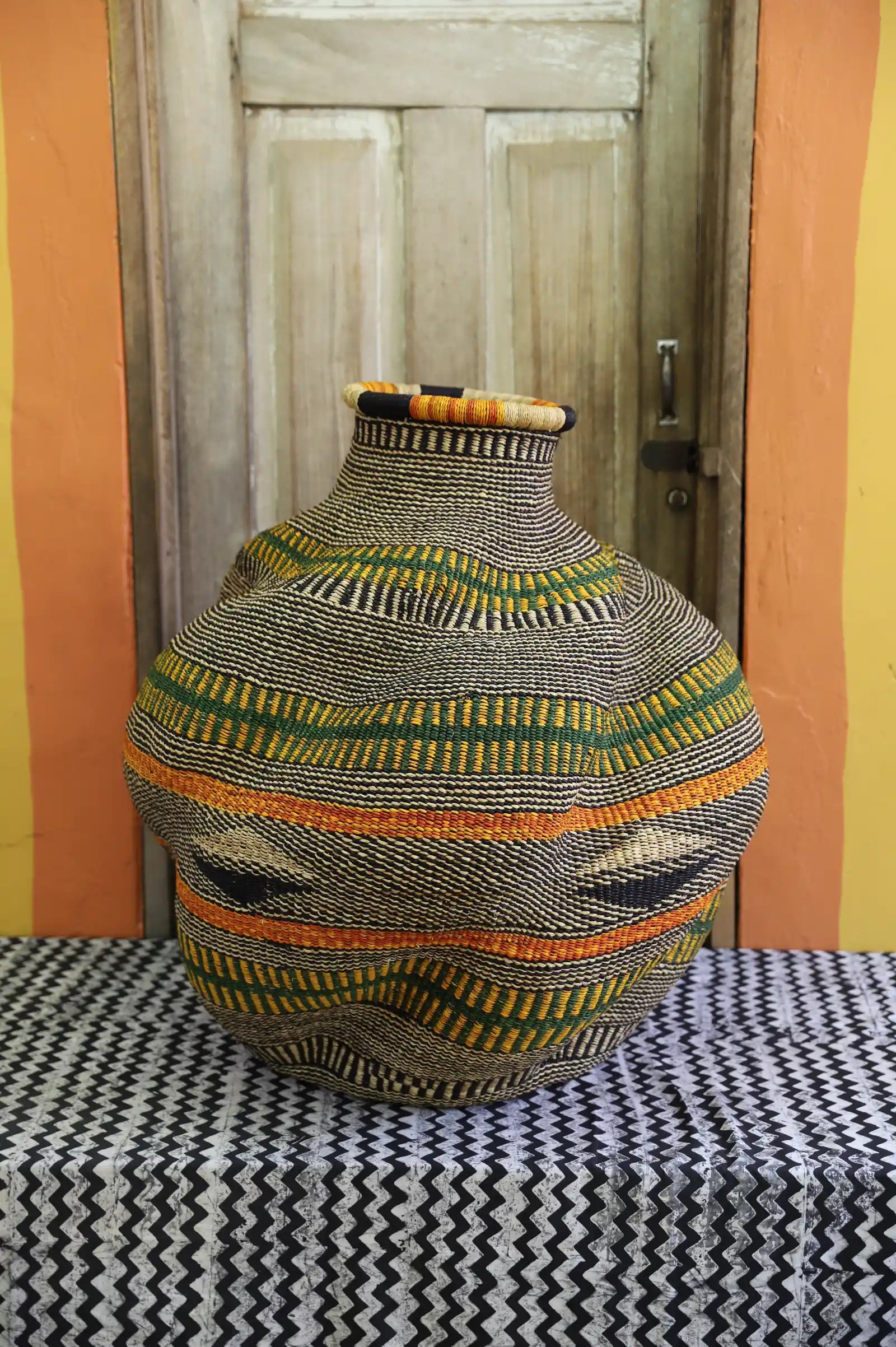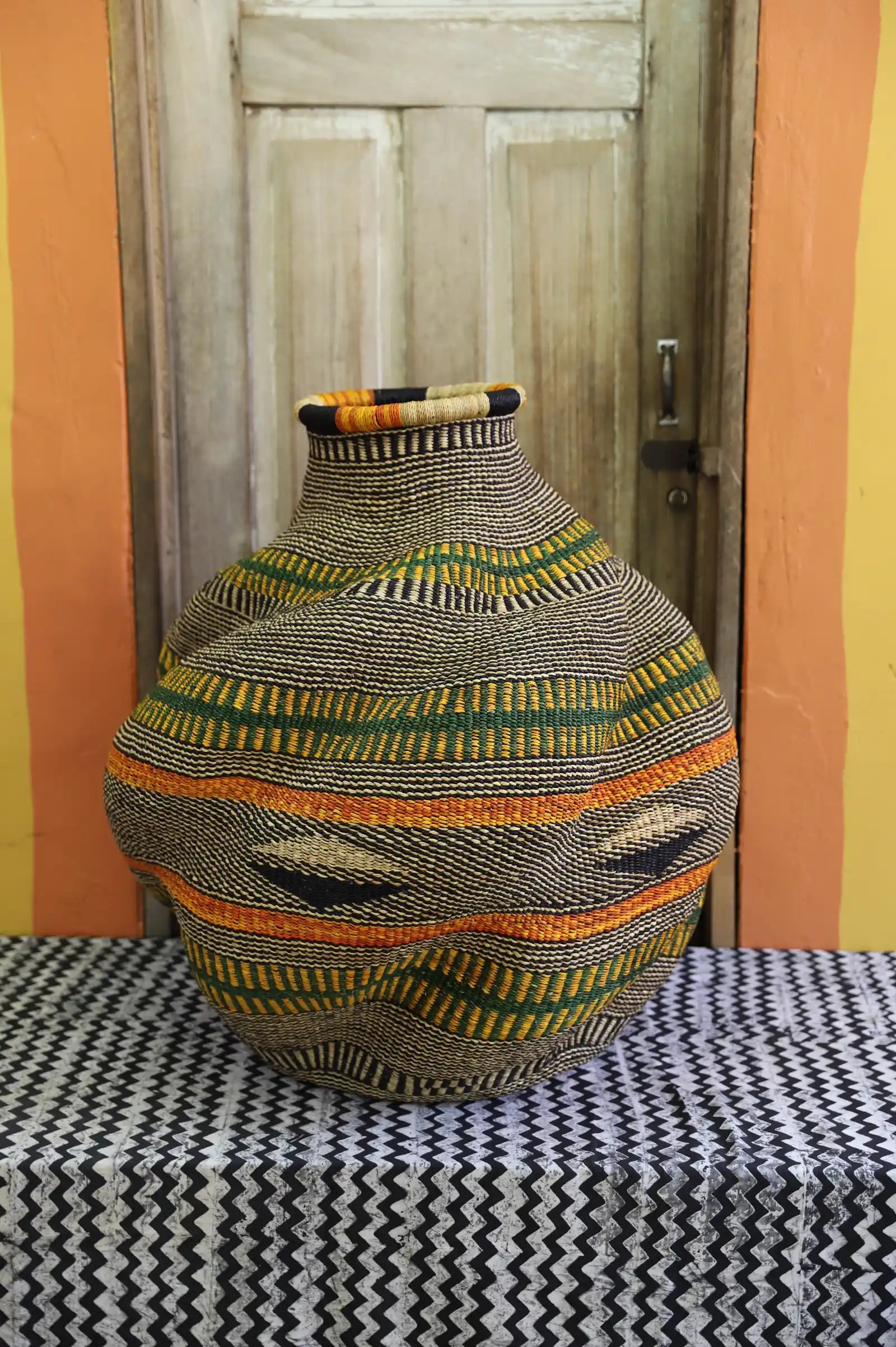In the Gurune language of Ghana’s Upper East Region, De-engo means ‘a meeting of chiefs.’ These vibrant gatherings are filled with color, conversation, music, and dance. Our artisan weaver beautifully captures this spirit in the basket’s twisting form and striking use of color. Exclusive to The Baba Tree, this one-of-a-kind piece is perfect for the discerning collector.