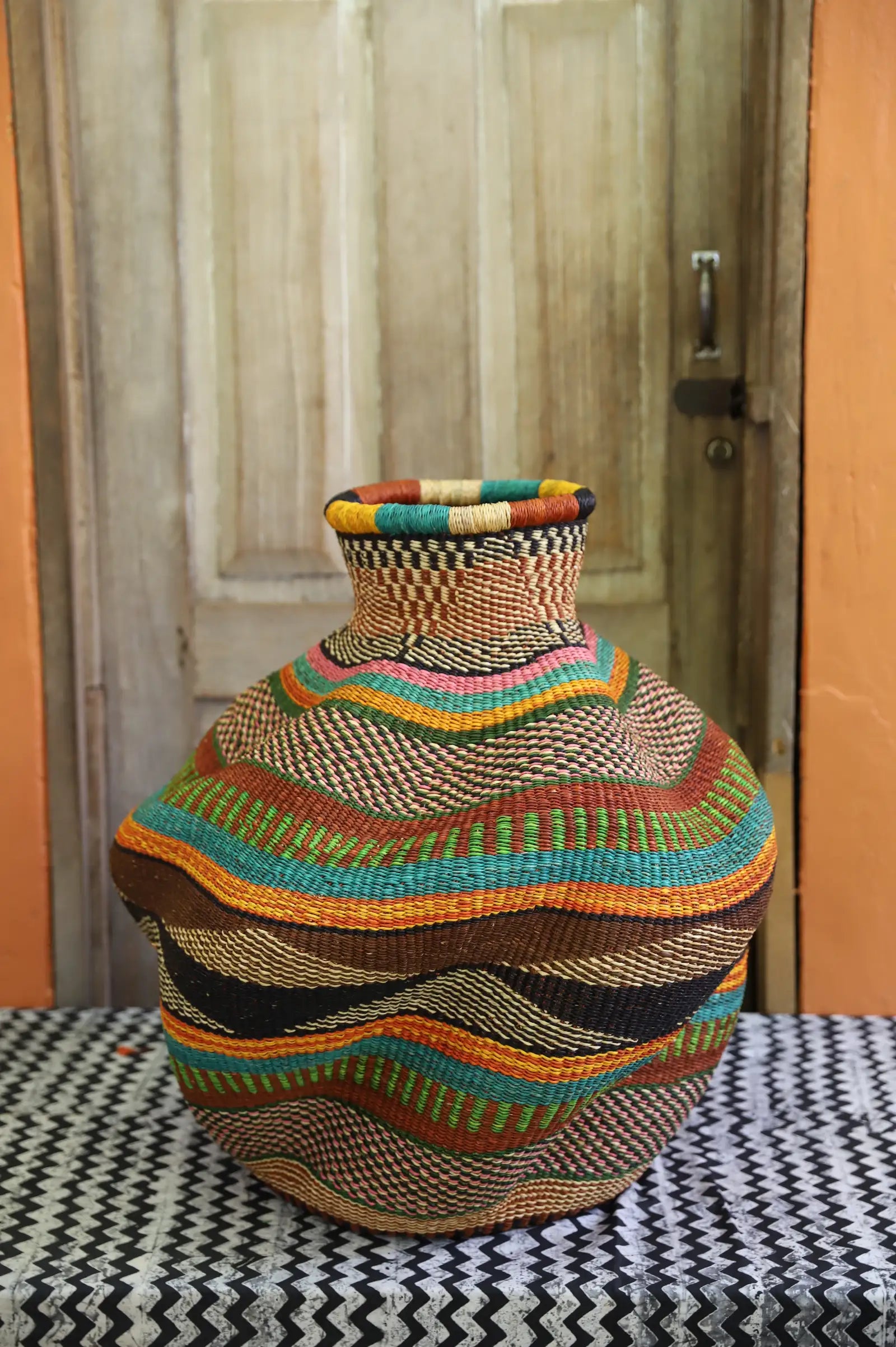 In the Gurune language of Ghana’s Upper East Region, De-engo means ‘a meeting of chiefs.’ These vibrant gatherings are filled with color, conversation, music, and dance. Our artisan weaver beautifully captures this spirit in the basket’s twisting form and striking use of color. Exclusive to The Baba Tree, this one-of-a-kind piece is perfect for the discerning collector.