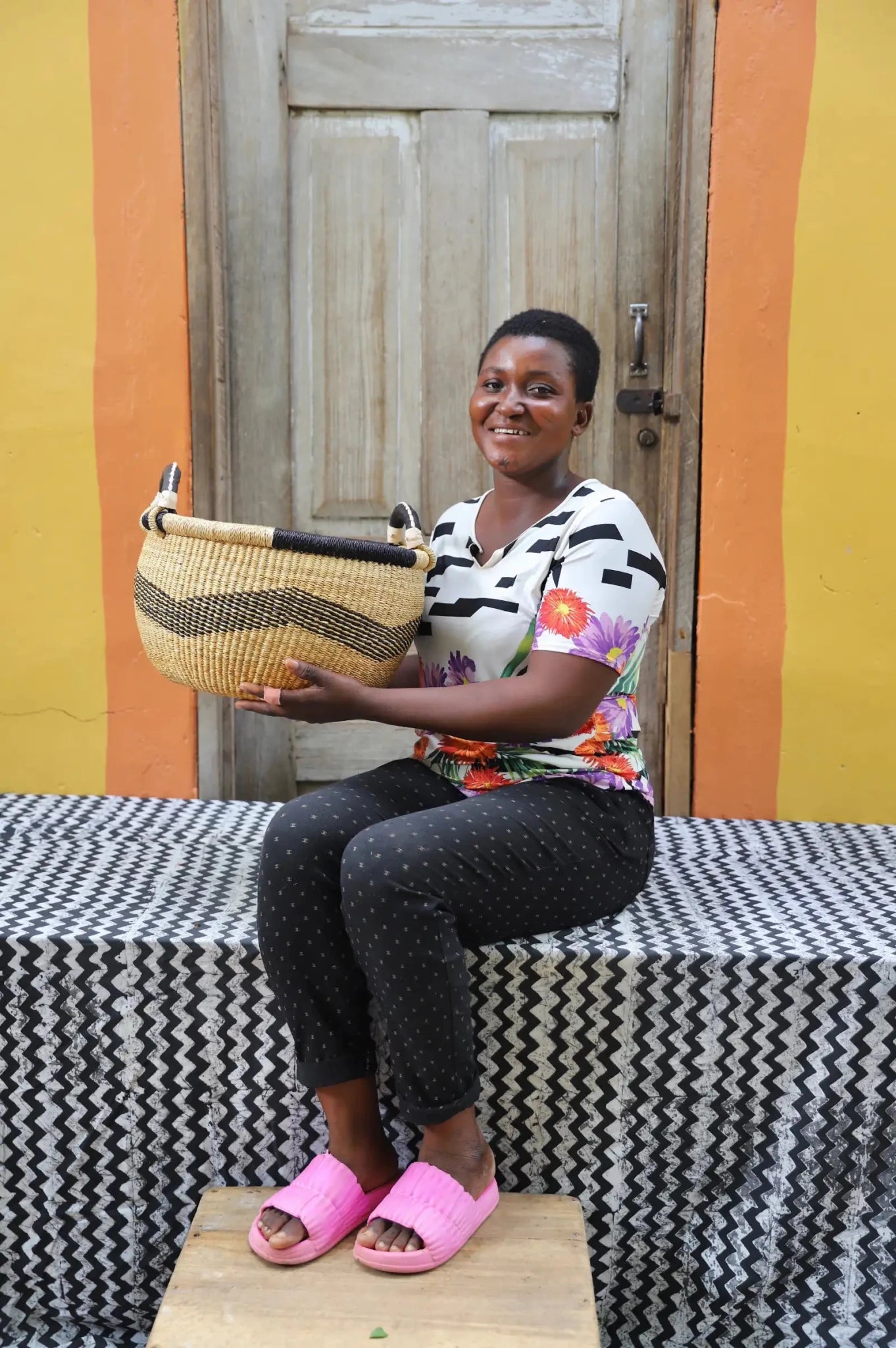Le gbenka, qui tire son nom du tamis traditionnel utilisé pour filtrer le pito (une boisson à base de millet très appréciée), est l'une des premières formes de vannerie tissées dans la région du Haut-Est du Ghana. Symbole d'hospitalité et de convivialité, il incarne l'esprit de fête partagée. Aujourd'hui, il est réinventé comme un contenant fonctionnel pour ranger fruits, textiles ou objets précieux.