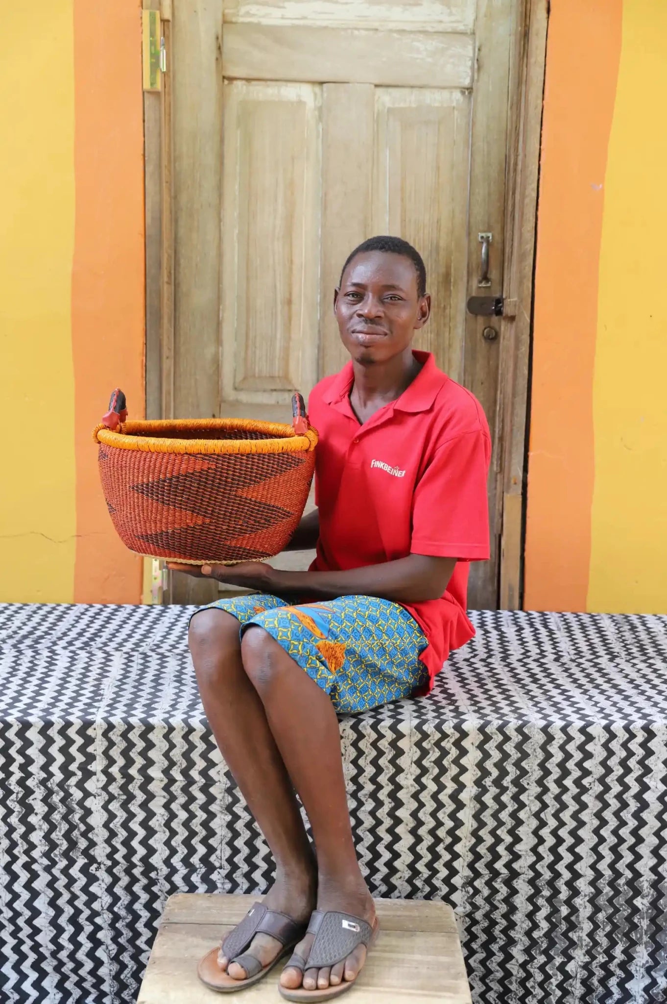 Le gbenka, qui tire son nom du tamis traditionnel utilisé pour filtrer le pito (une boisson à base de millet très appréciée), est l'une des premières formes de vannerie tissées dans la région du Haut-Est du Ghana. Symbole d'hospitalité et de convivialité, il incarne l'esprit de fête partagée. Aujourd'hui, il est réinventé comme un contenant fonctionnel pour ranger fruits, textiles ou objets précieux.