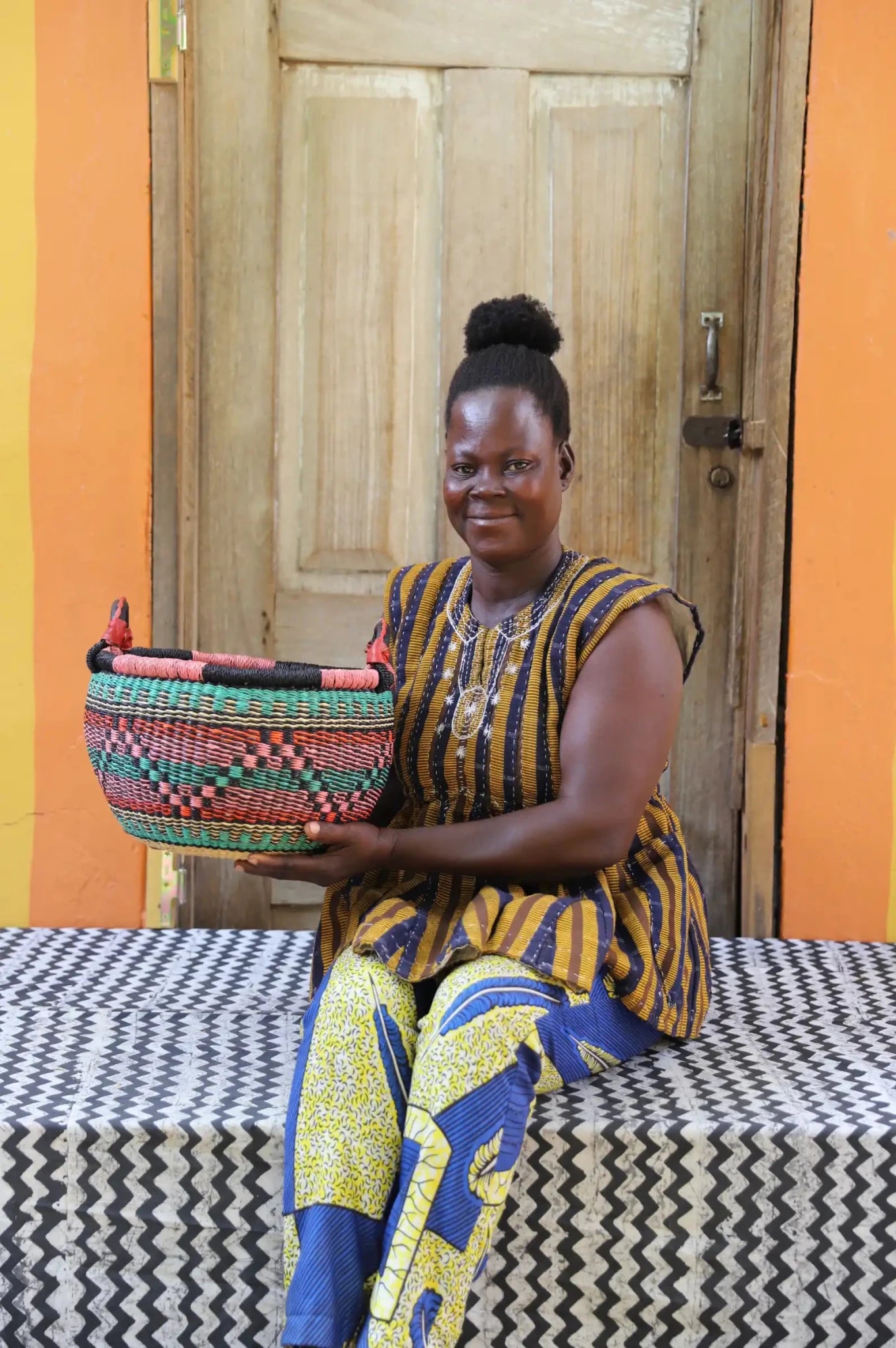 Le gbenka, qui tire son nom du tamis traditionnel utilisé pour filtrer le pito (une boisson à base de millet très appréciée), est l'une des premières formes de vannerie tissées dans la région du Haut-Est du Ghana. Symbole d'hospitalité et de convivialité, il incarne l'esprit de fête partagée. Aujourd'hui, il est réinventé comme un contenant fonctionnel pour ranger fruits, textiles ou objets précieux.