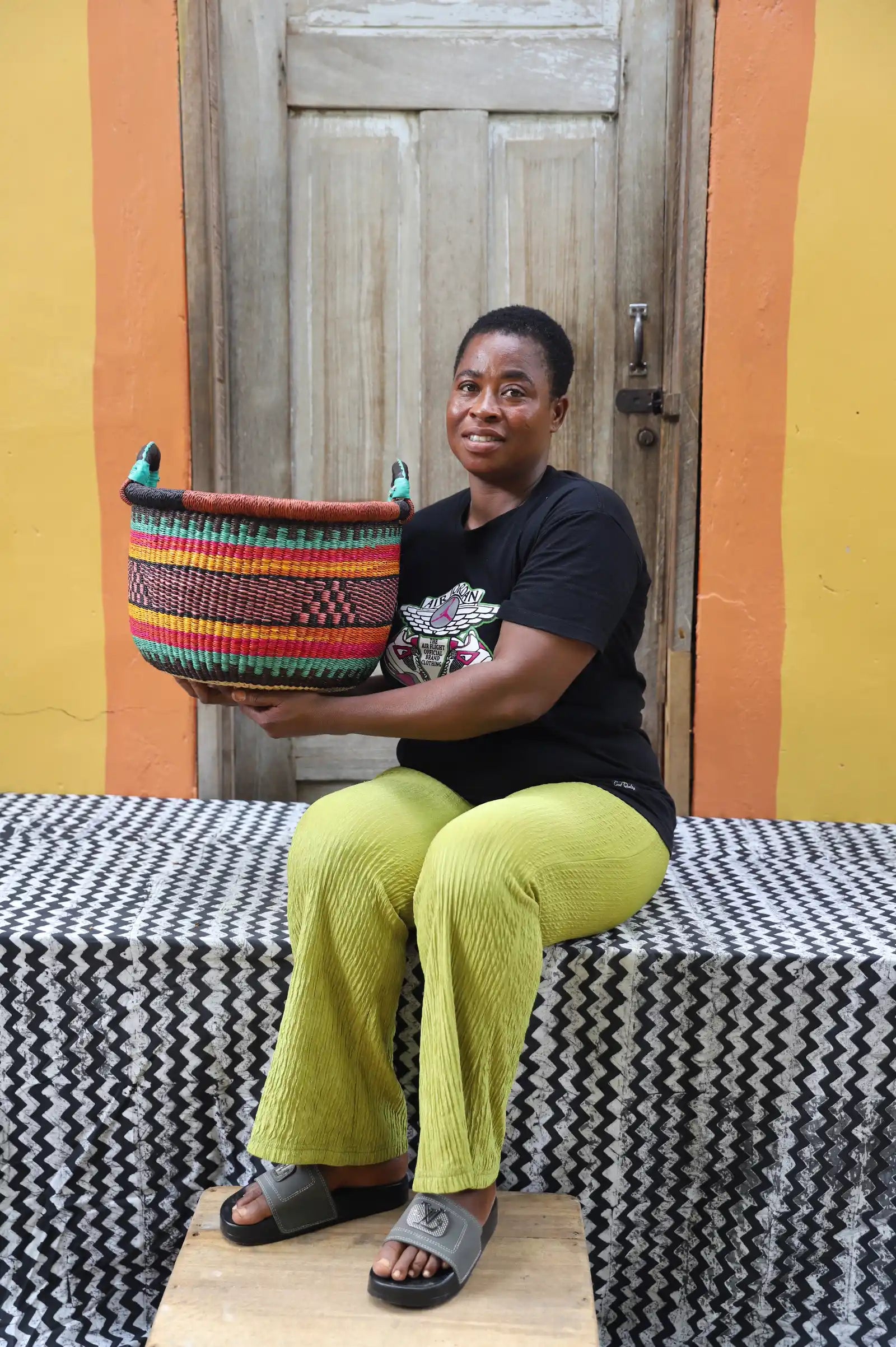 Le gbenka, qui tire son nom du tamis traditionnel utilisé pour filtrer le pito (une boisson à base de millet très appréciée), est l'une des premières formes de vannerie tissées dans la région du Haut-Est du Ghana. Symbole d'hospitalité et de convivialité, il incarne l'esprit de fête partagée. Aujourd'hui, il est réinventé comme un contenant fonctionnel pour ranger fruits, textiles ou objets précieux.