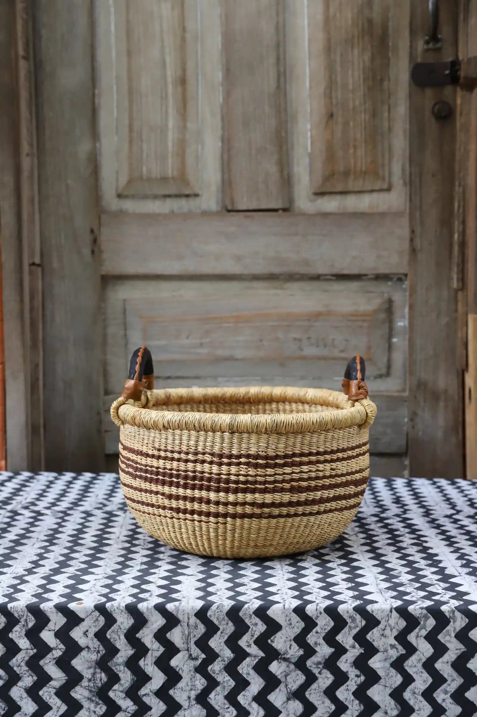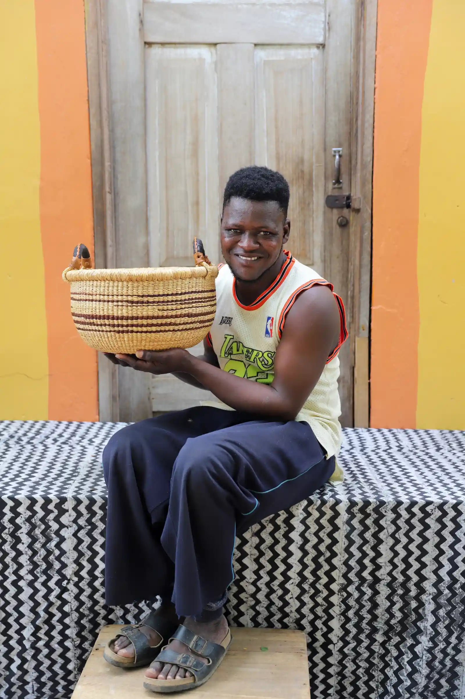 Le gbenka, qui tire son nom du tamis traditionnel utilisé pour filtrer le pito (une boisson à base de millet très appréciée), est l'une des premières formes de vannerie tissées dans la région du Haut-Est du Ghana. Symbole d'hospitalité et de convivialité, il incarne l'esprit de fête partagée. Aujourd'hui, il est réinventé comme un contenant fonctionnel pour ranger fruits, textiles ou objets précieux.