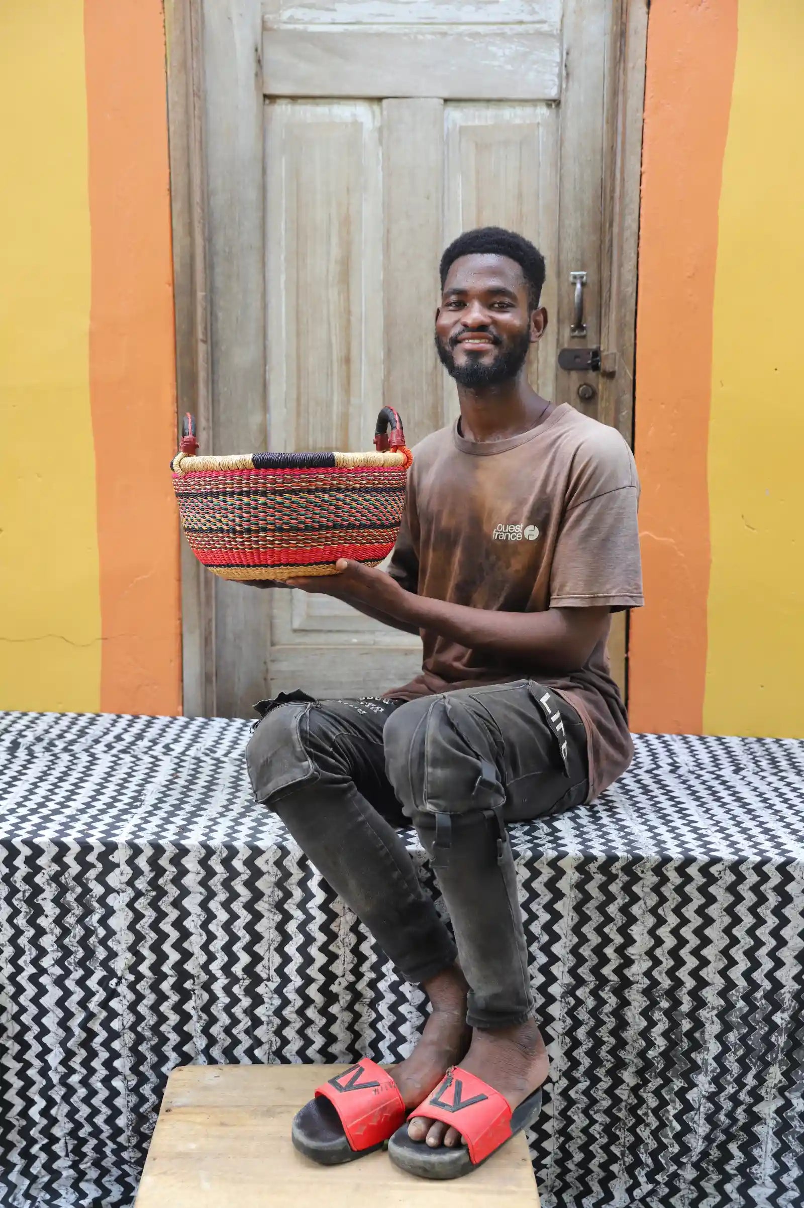 Le gbenka, qui tire son nom du tamis traditionnel utilisé pour filtrer le pito (une boisson à base de millet très appréciée), est l'une des premières formes de vannerie tissées dans la région du Haut-Est du Ghana. Symbole d'hospitalité et de convivialité, il incarne l'esprit de fête partagée. Aujourd'hui, il est réinventé comme un contenant fonctionnel pour ranger fruits, textiles ou objets précieux.
