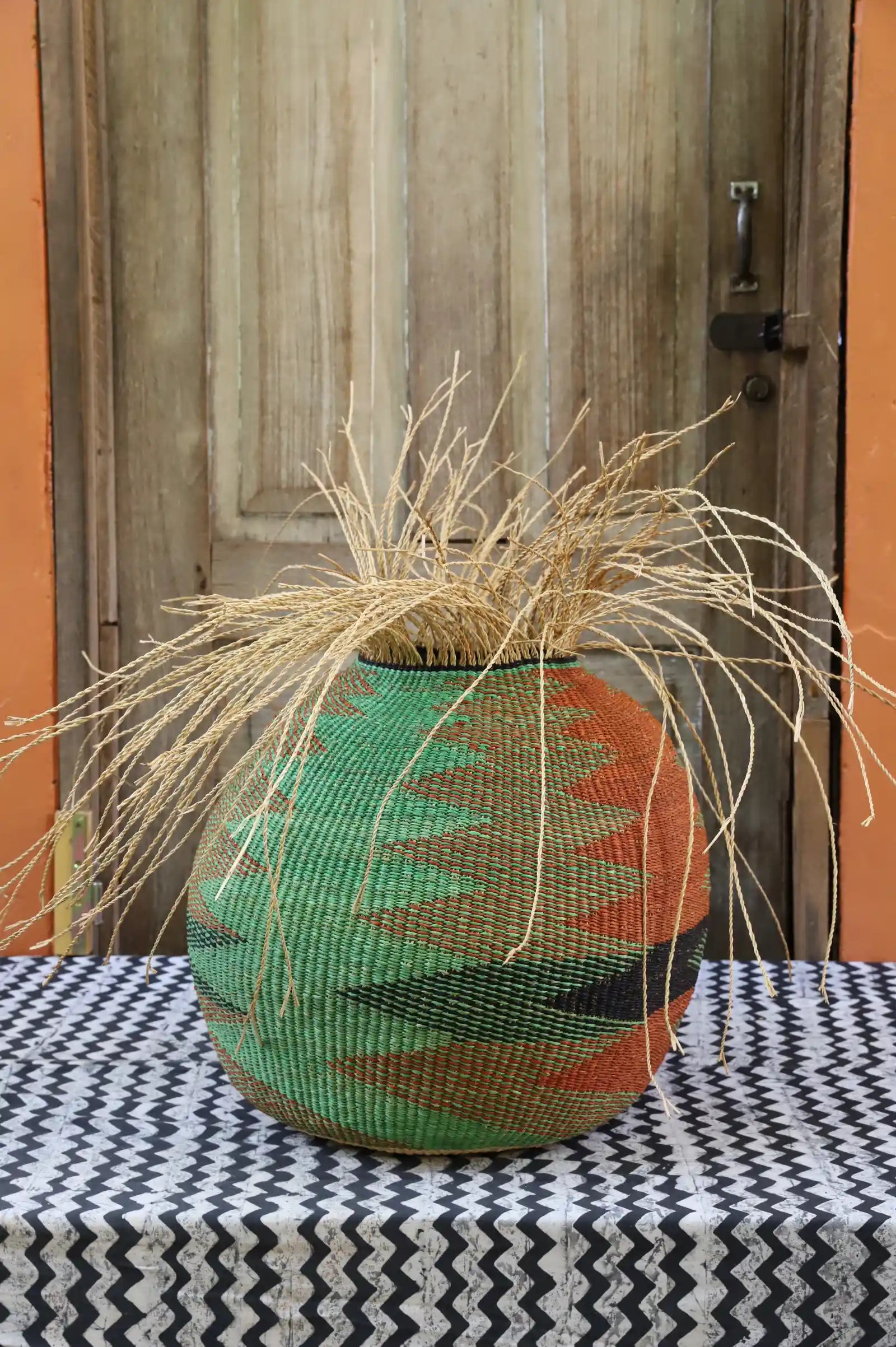 Kenkia, qui signifie « grande calebasse à eau » en gurune, la langue du peuple Gurunsi du Ghana, est à l'origine de ce panier aux formes généreuses. D'une conception simple, ses proportions élégantes témoignent du savoir-faire d'un expert en vannerie. Véritable œuvre d'art, le panier Kenkia se transforme en un magnifique vase tressé : il suffit d'y ajouter un bocal en verre pour y déposer des fleurs fraîches ou des trésors du jardin.
