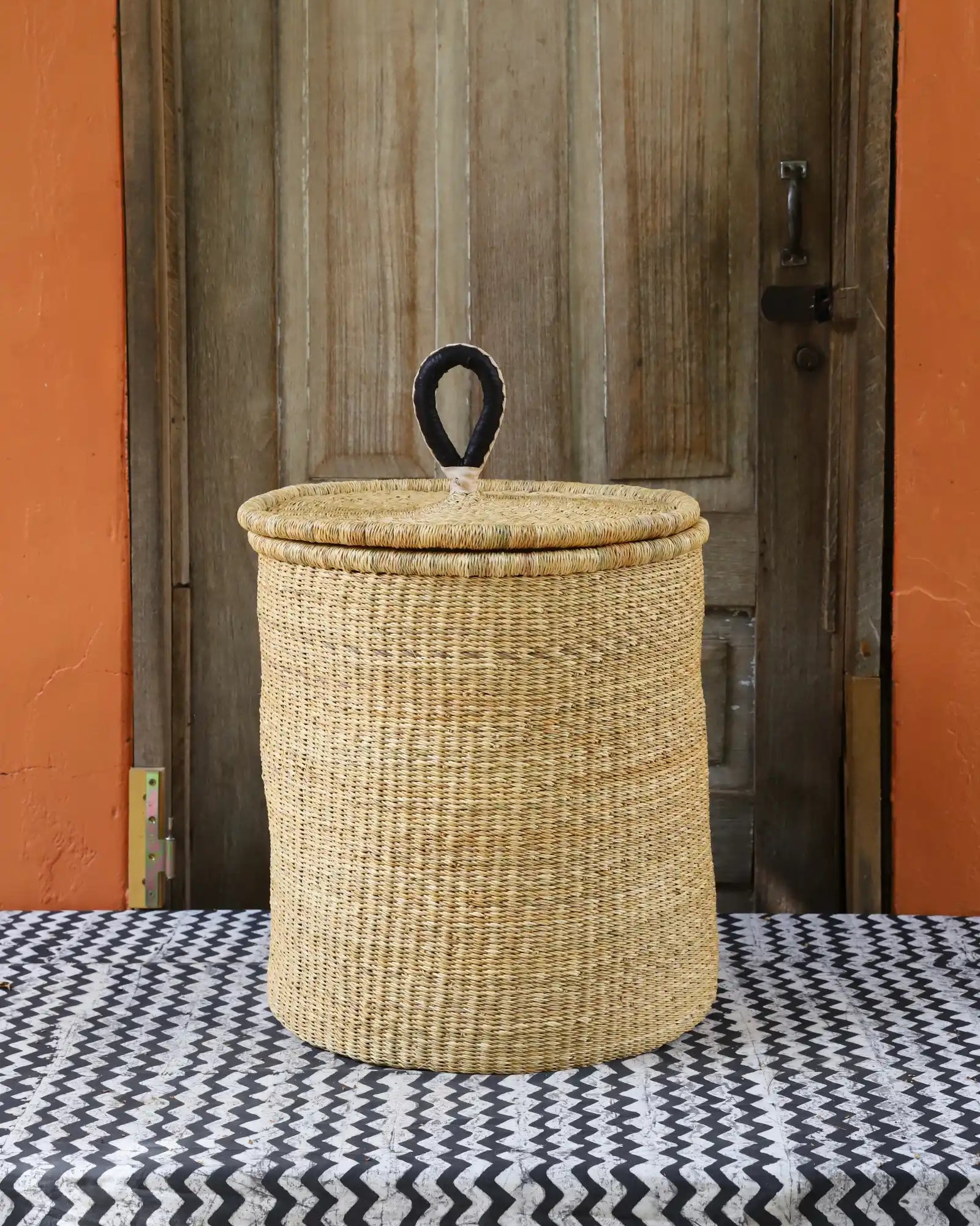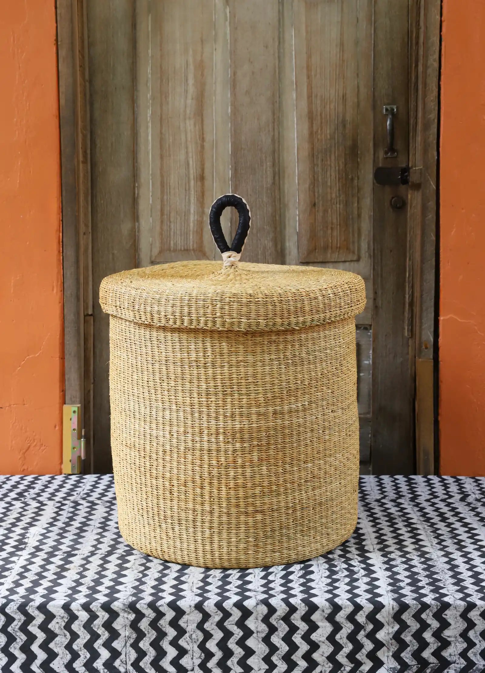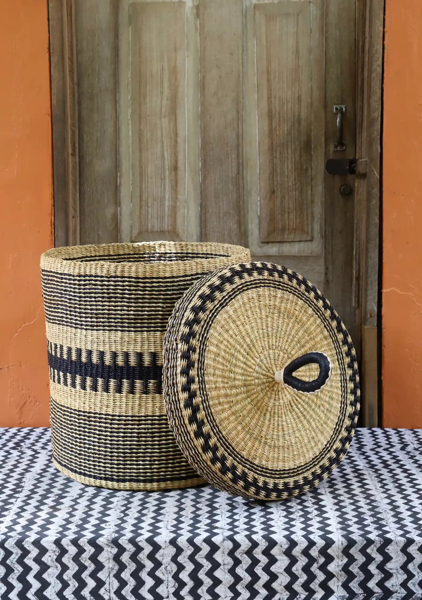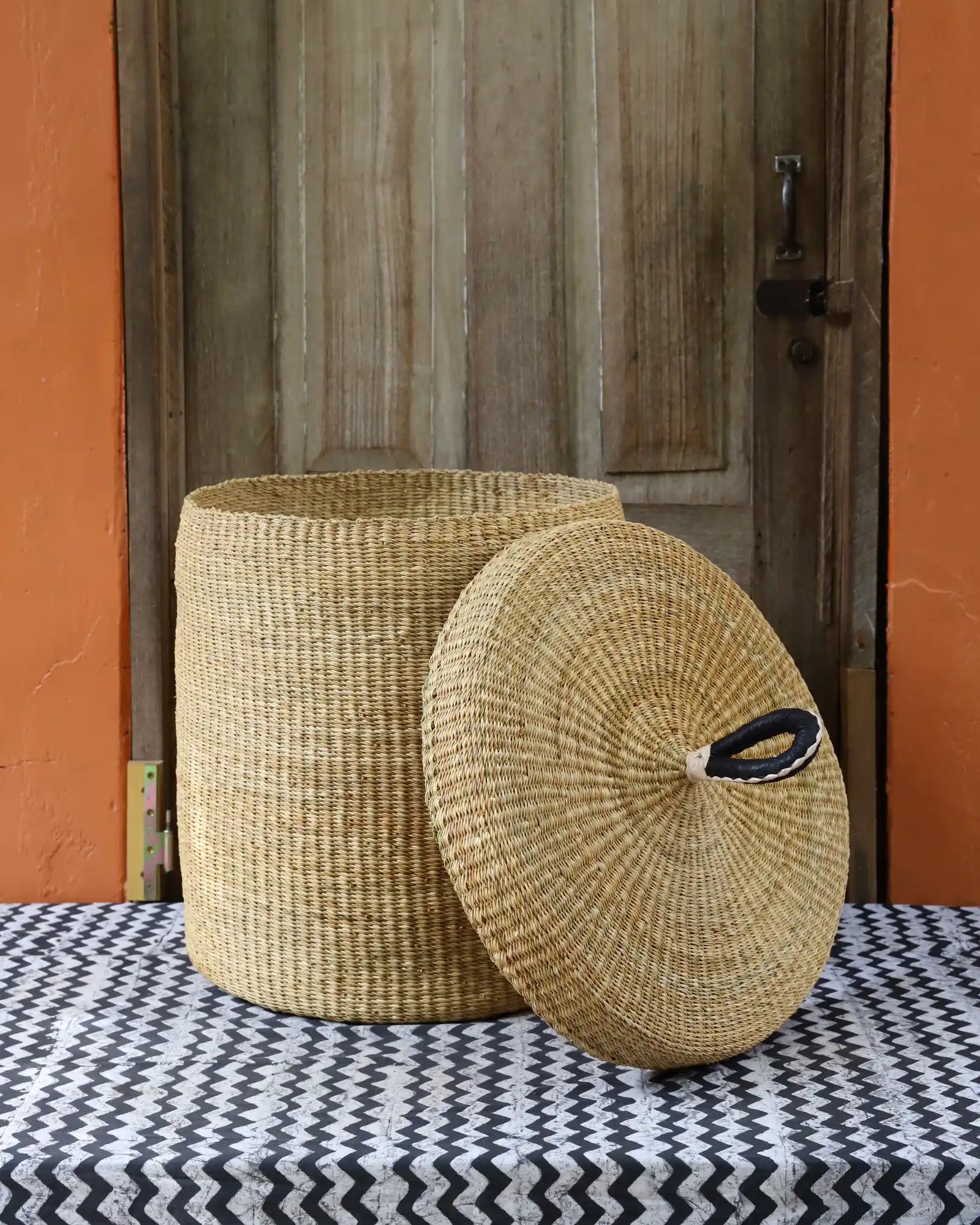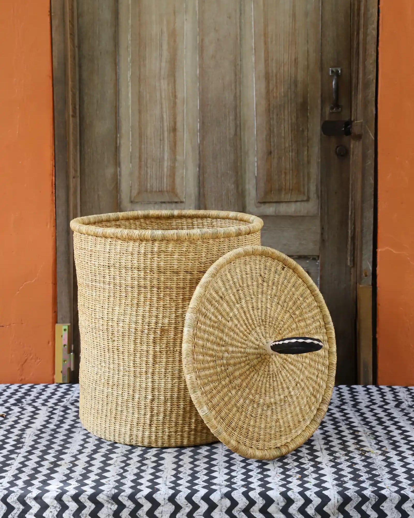 Nos paniers à linge artisanaux tissés à la main sont disponibles en tailles L, M et S. Choisissez parmi des tons naturels et chaleureux, du jonc de mer ou de magnifiques combinaisons inspirées des couleurs du Ghana. Ils sont désormais également disponibles avec couvercle et doublure en batik local signé Esther Amate, en wax ghanéen et en tissu naturel tissé à la main. Un luxe moderne pour faire de la lessive un véritable plaisir.