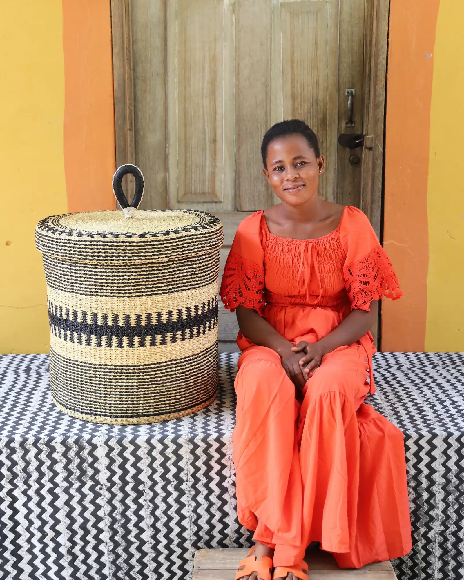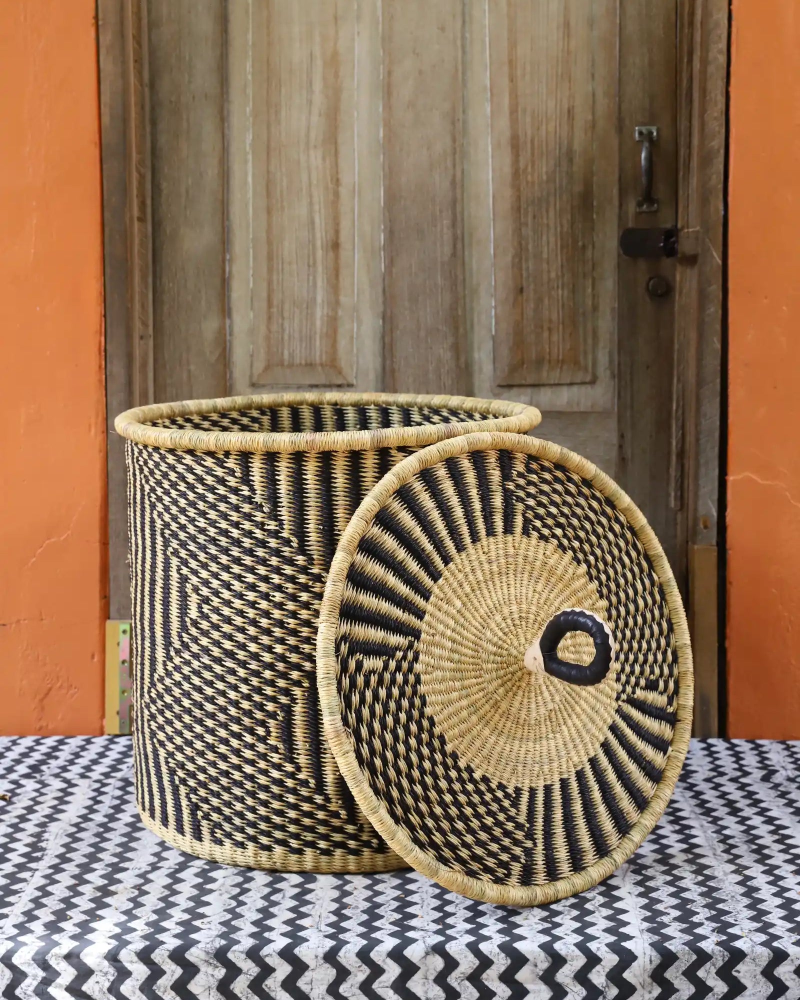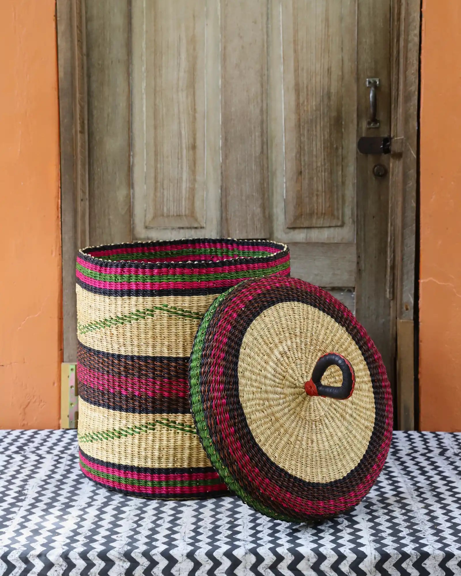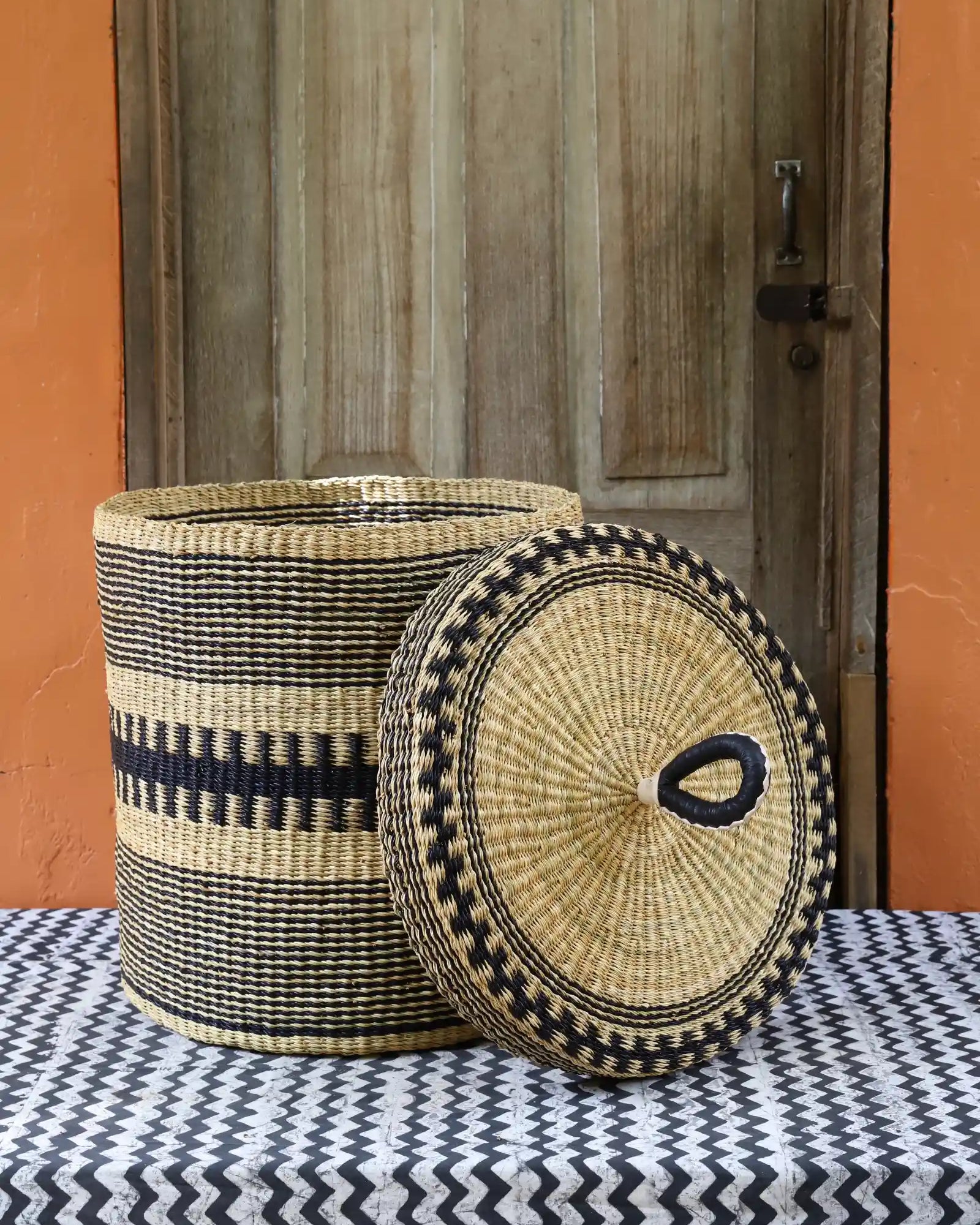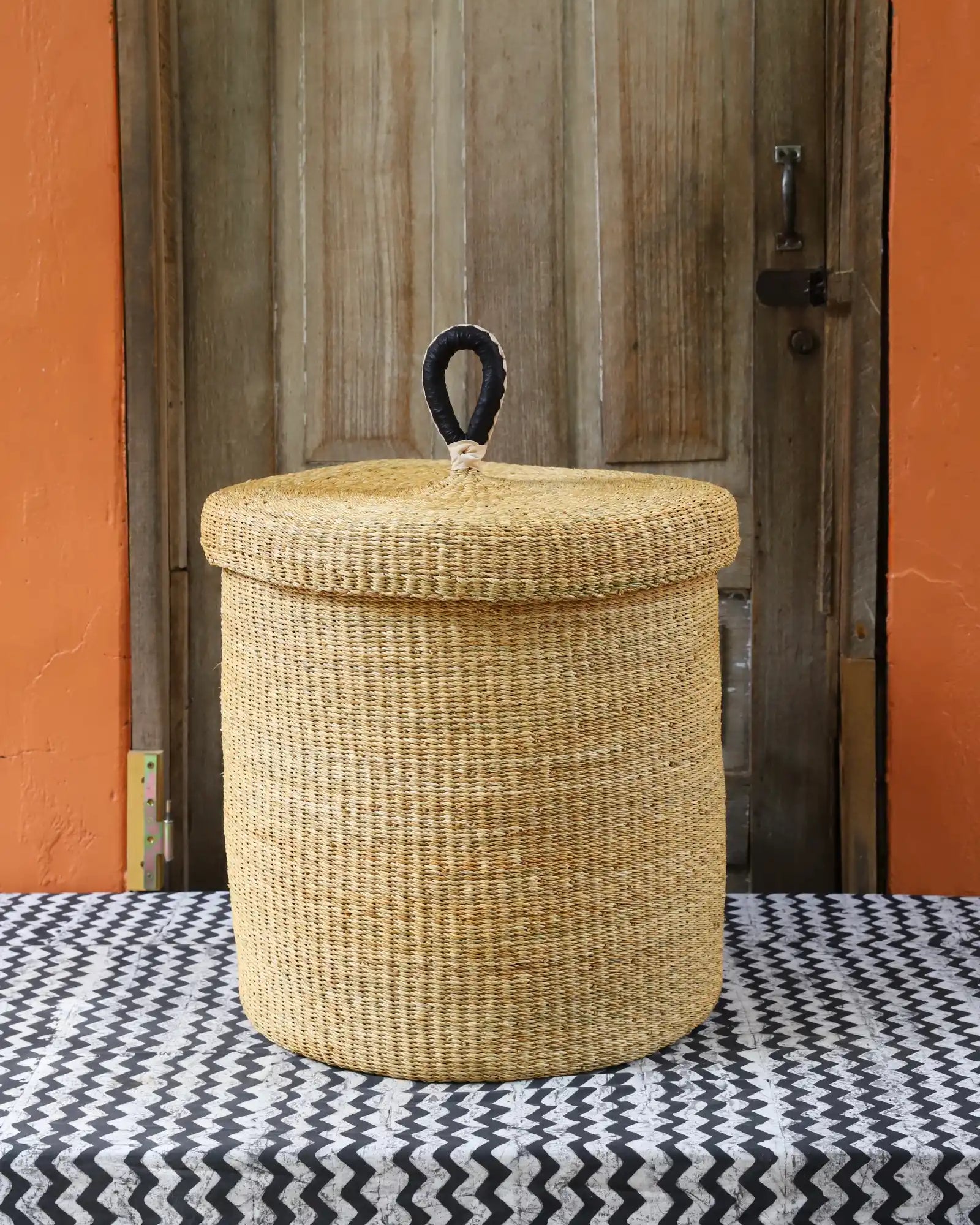 Nos paniers à linge artisanaux tissés à la main sont disponibles en tailles L, M et S. Choisissez parmi des tons naturels et chaleureux, du jonc de mer ou de magnifiques combinaisons inspirées des couleurs du Ghana. Ils sont désormais également disponibles avec couvercle et doublure en batik local signé Esther Amate, en wax ghanéen et en tissu naturel tissé à la main. Un luxe moderne pour faire de la lessive un véritable plaisir.