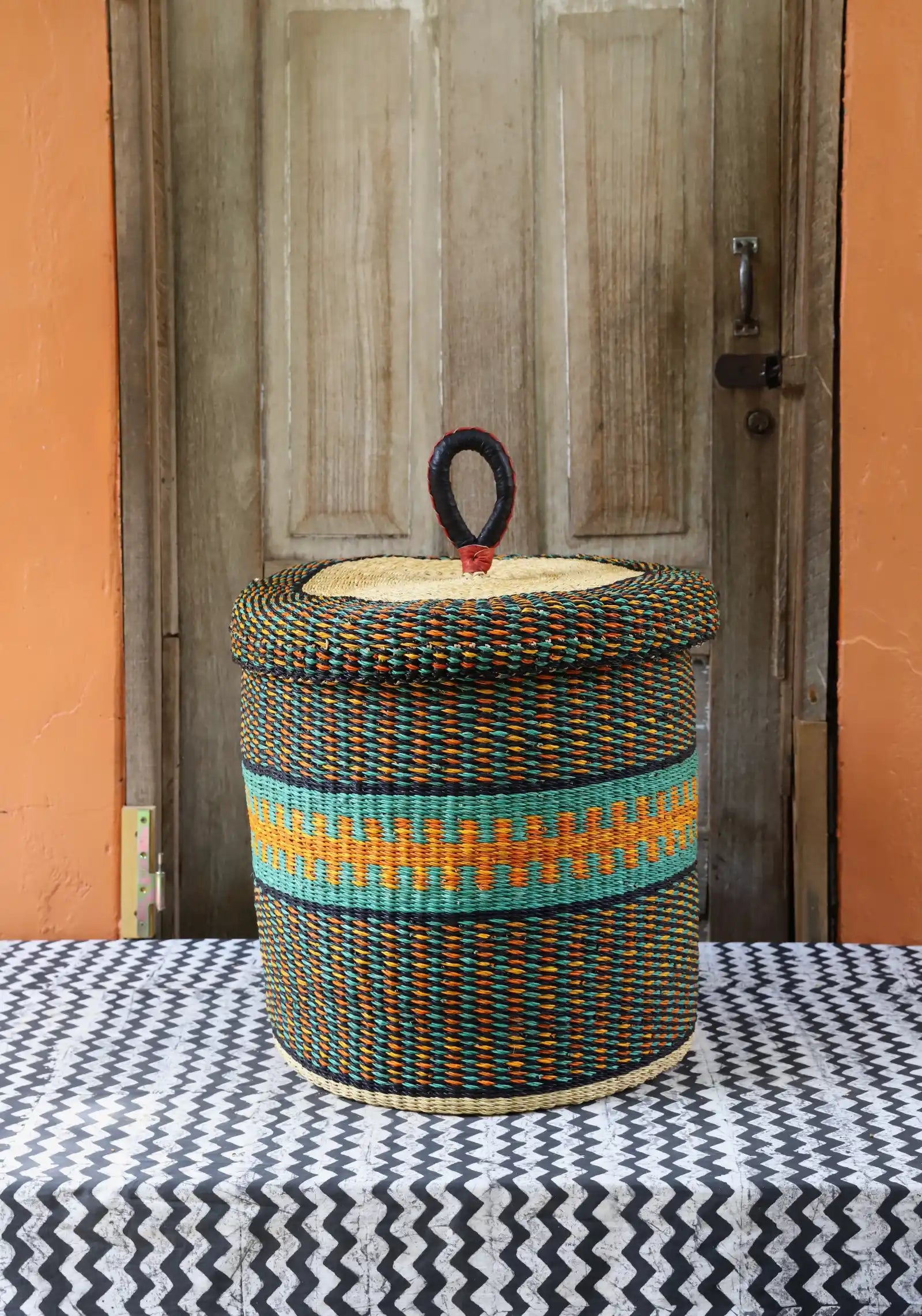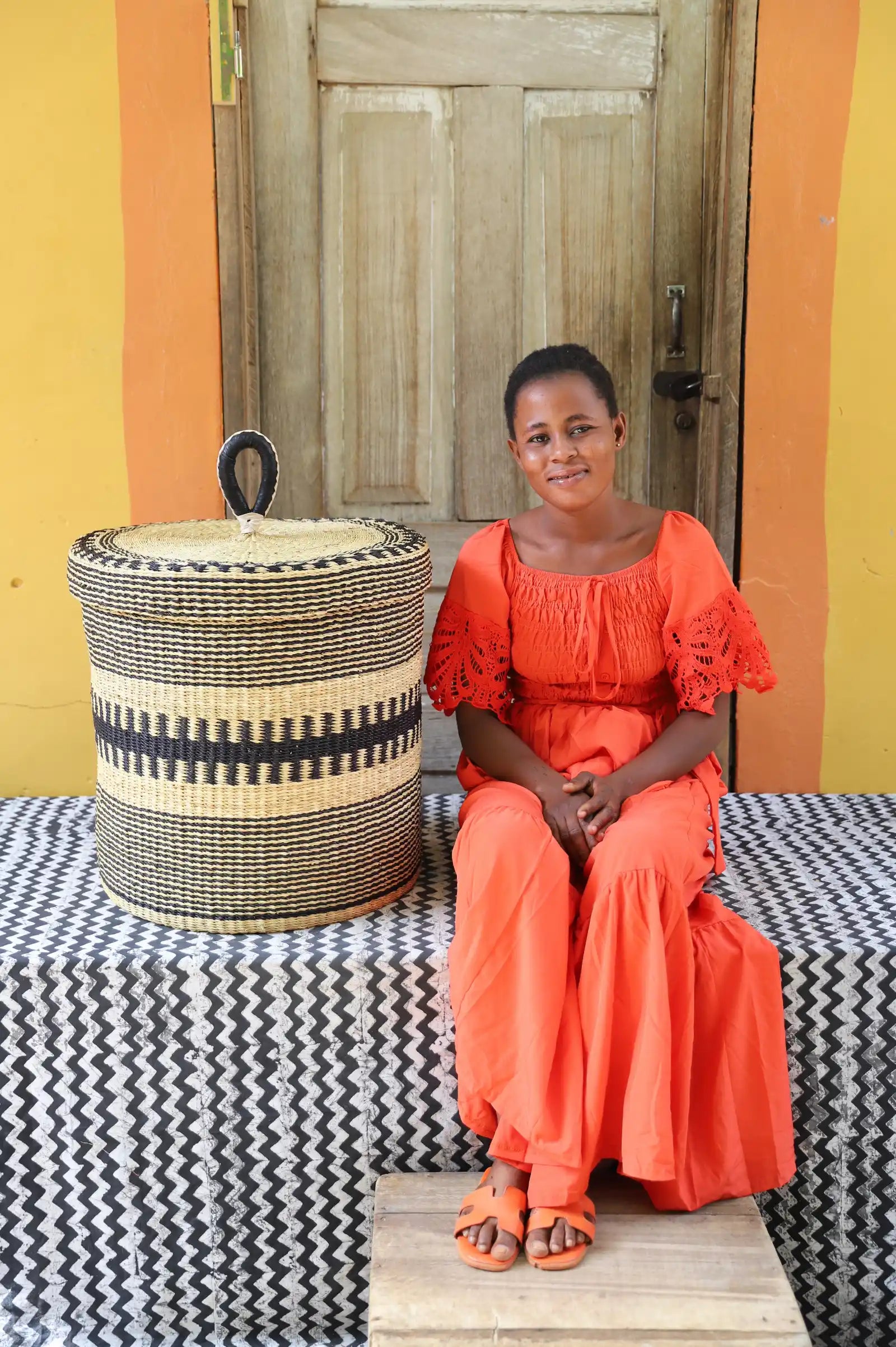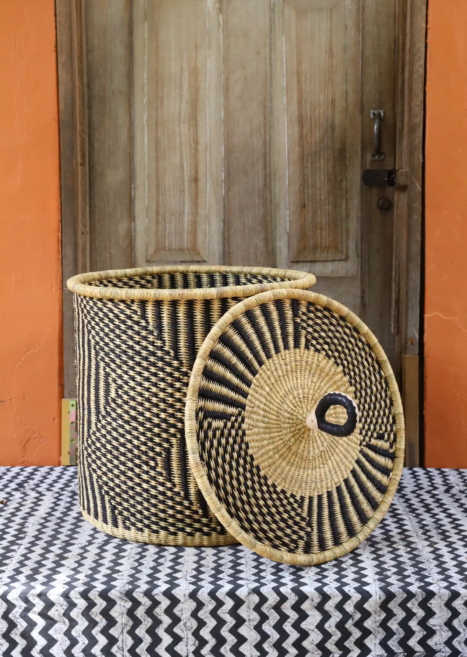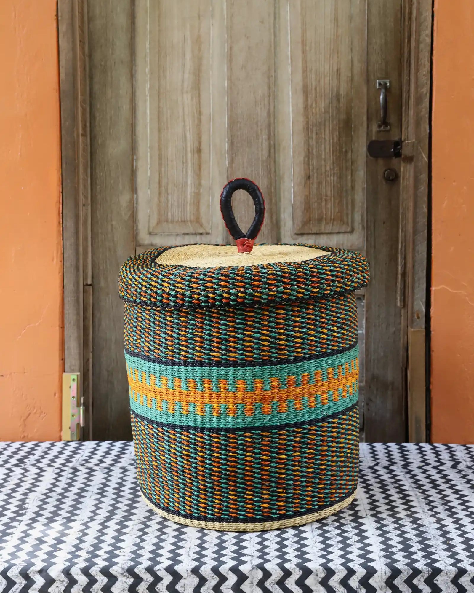 Nos paniers à linge artisanaux tissés à la main sont disponibles en tailles L, M et S. Choisissez parmi des tons naturels et chaleureux, du jonc de mer ou de magnifiques combinaisons inspirées des couleurs du Ghana. Ils sont désormais également disponibles avec couvercle et doublure en batik local signé Esther Amate, en wax ghanéen et en tissu naturel tissé à la main. Un luxe moderne pour faire de la lessive un véritable plaisir.