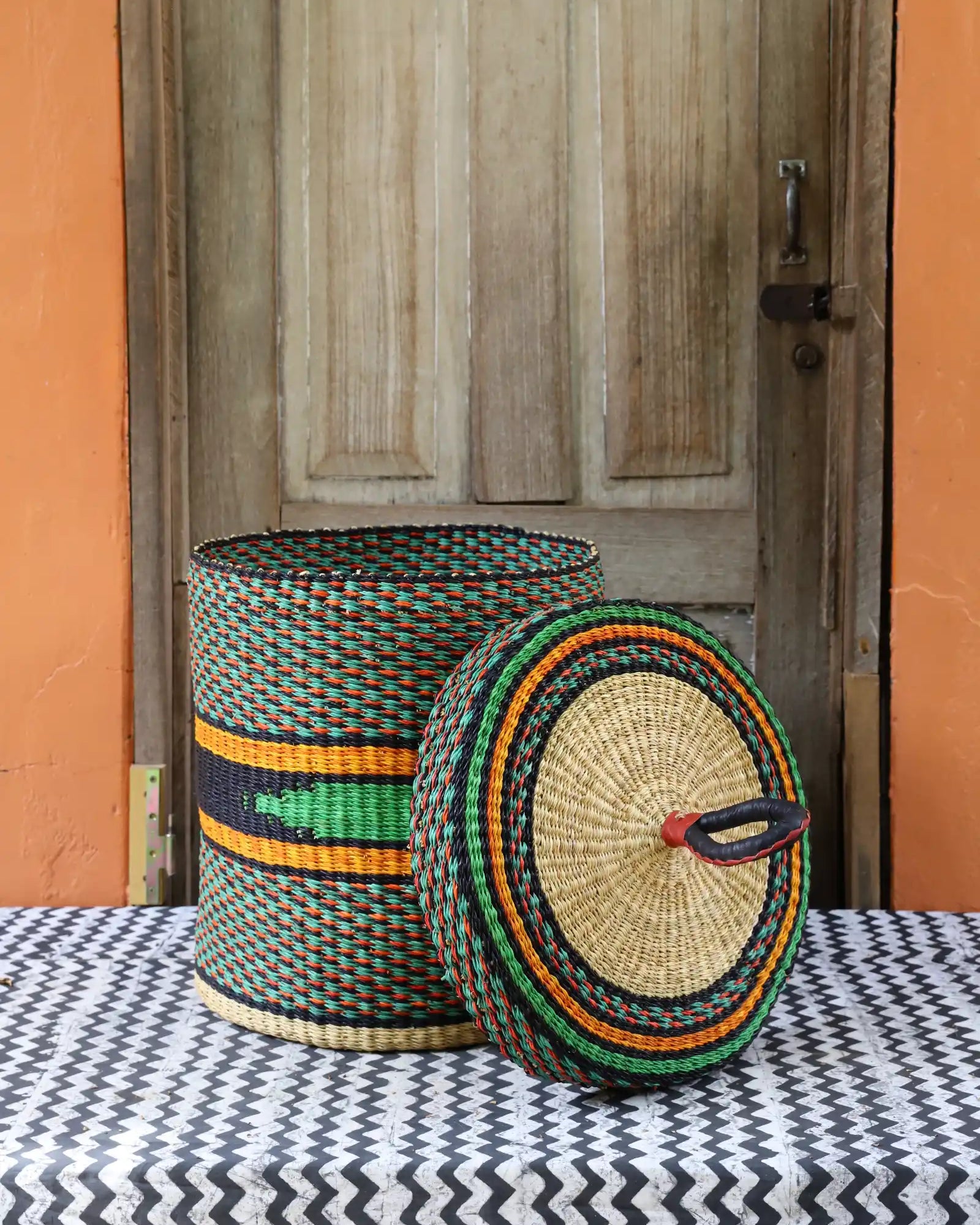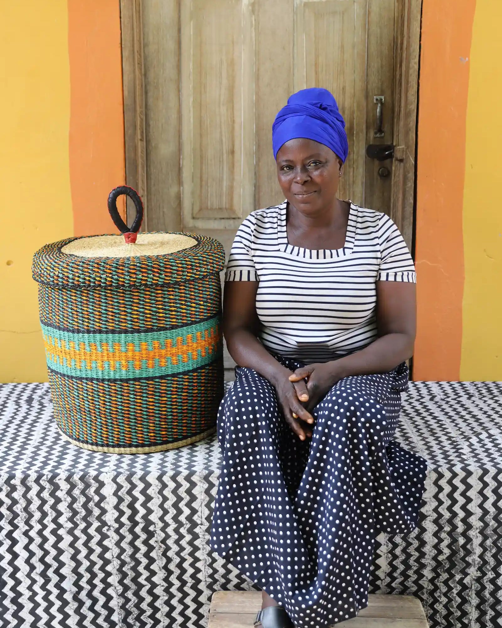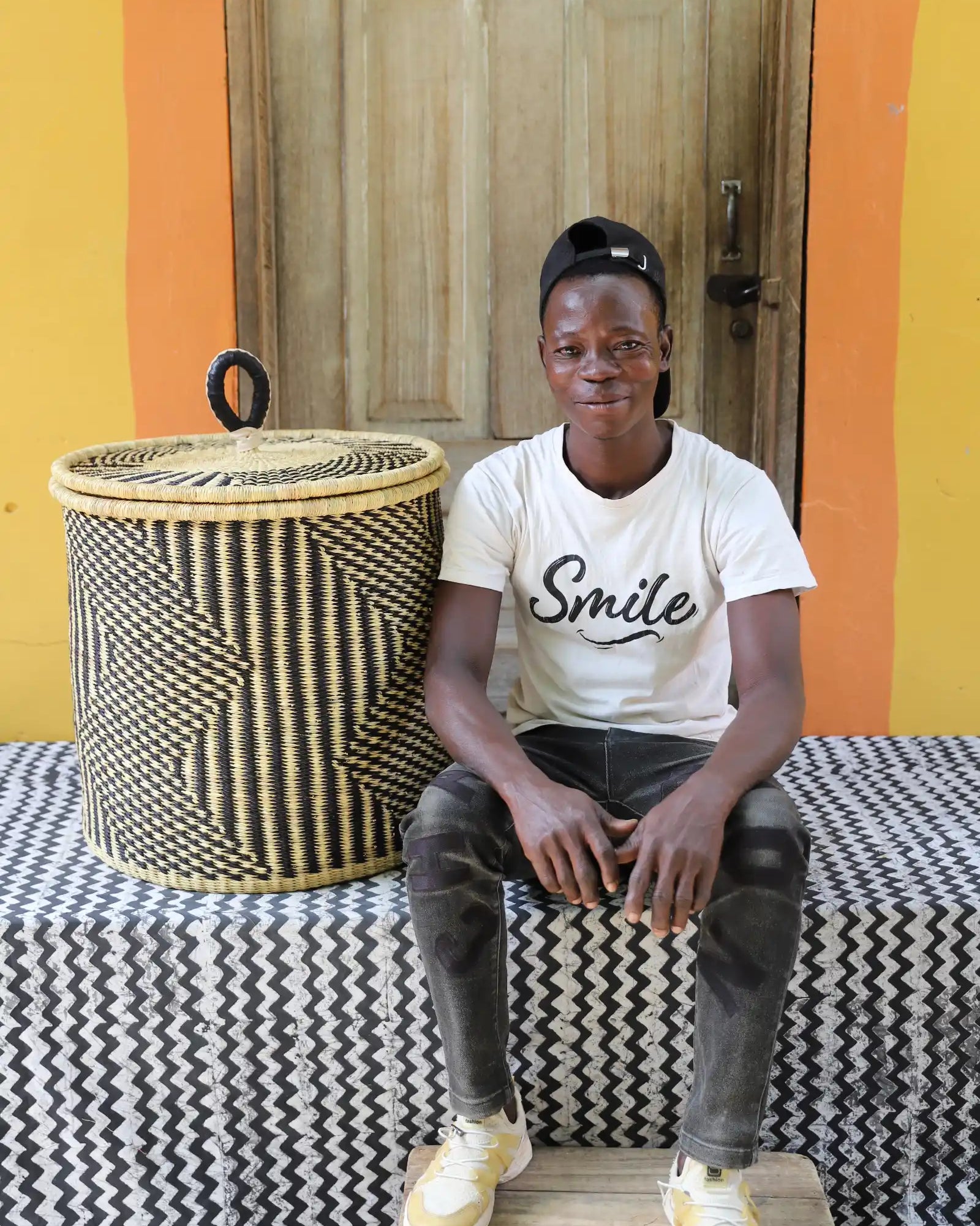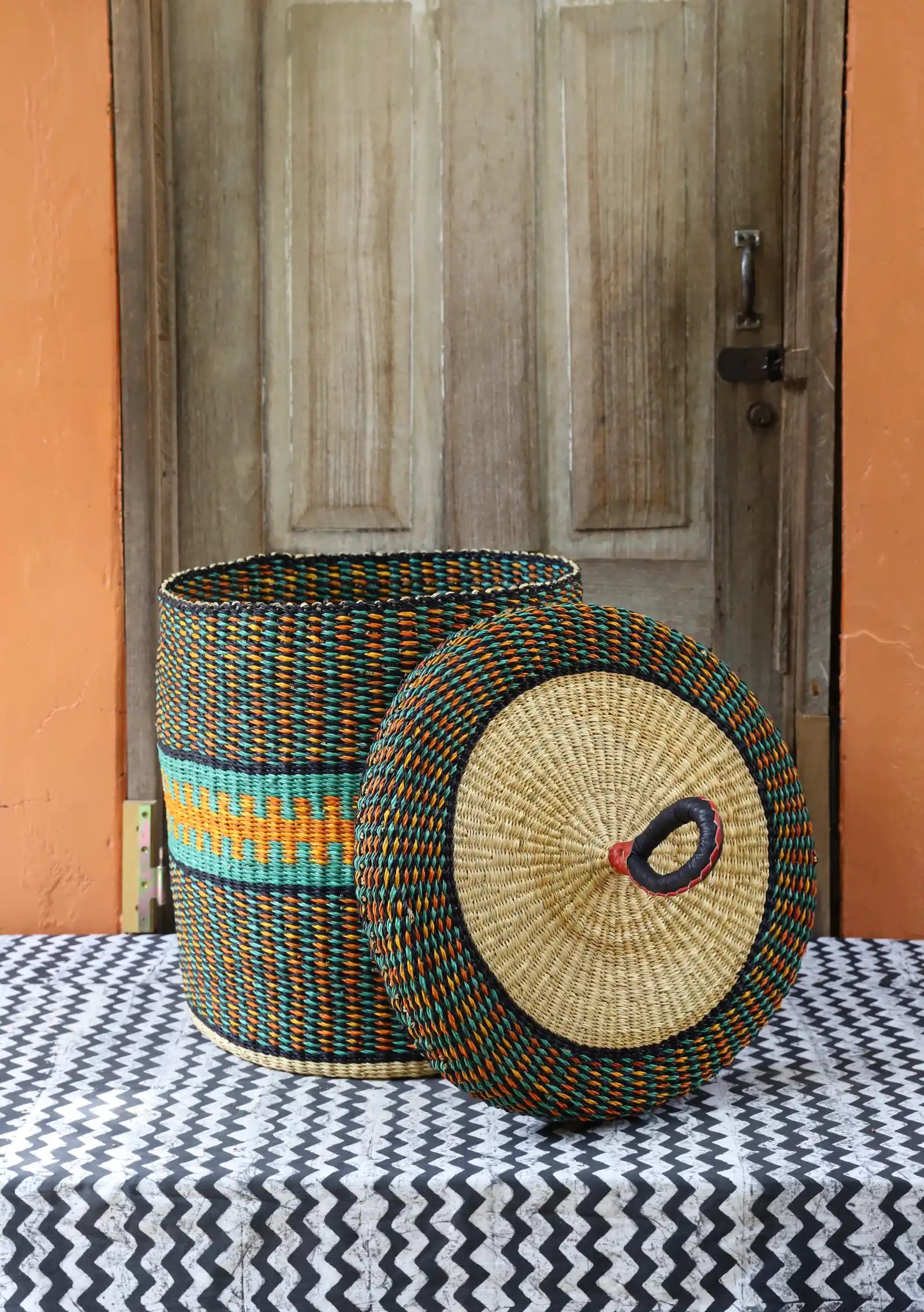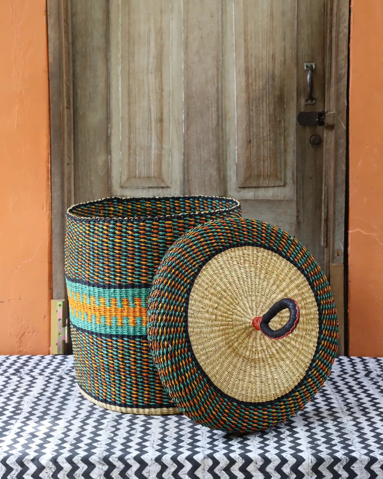 Nos paniers à linge artisanaux tissés à la main sont disponibles en tailles L, M et S. Choisissez parmi des tons naturels et chaleureux, du jonc de mer ou de magnifiques combinaisons inspirées des couleurs du Ghana. Ils sont désormais également disponibles avec couvercle et doublure en batik local signé Esther Amate, en wax ghanéen et en tissu naturel tissé à la main. Un luxe moderne pour faire de la lessive un véritable plaisir.