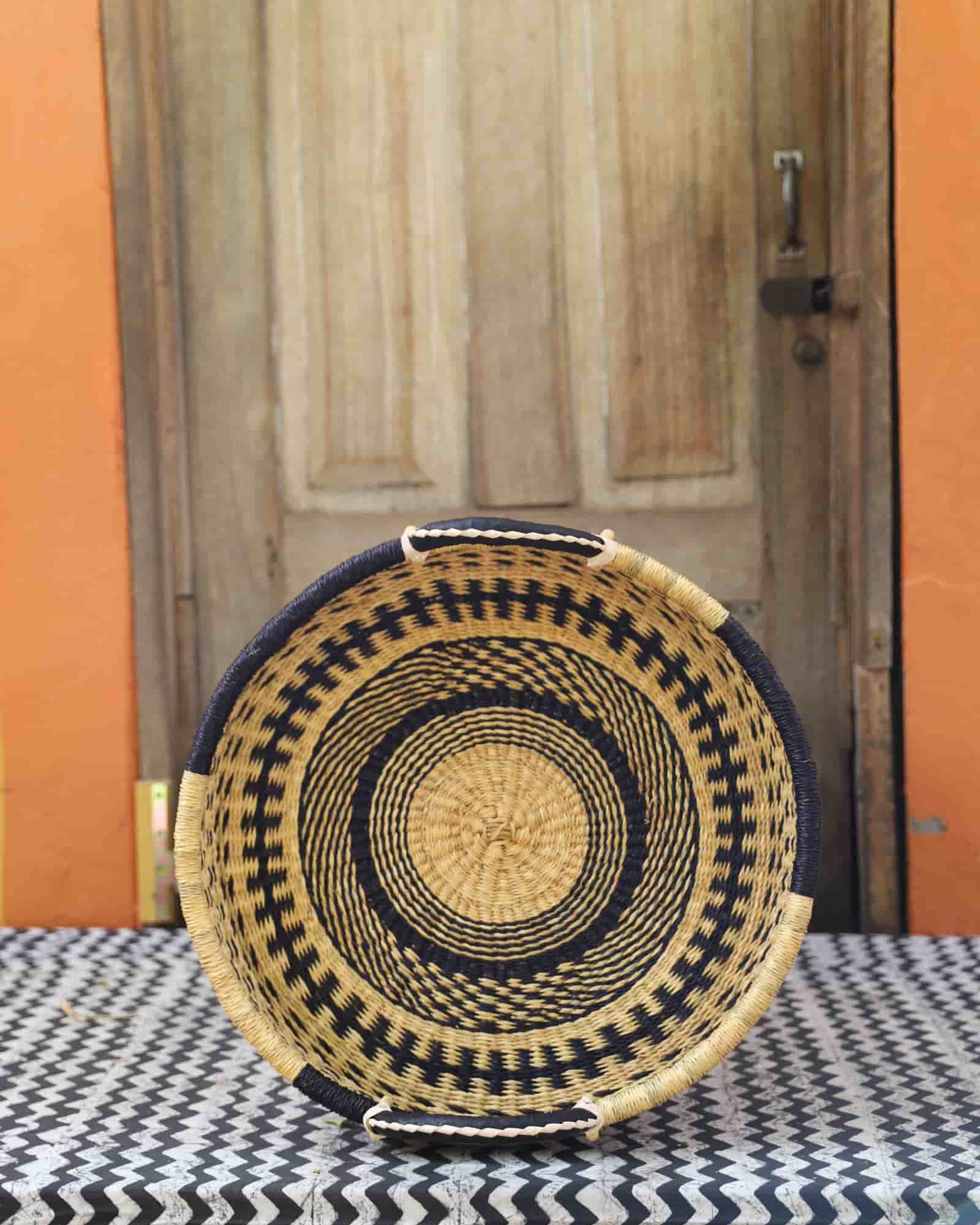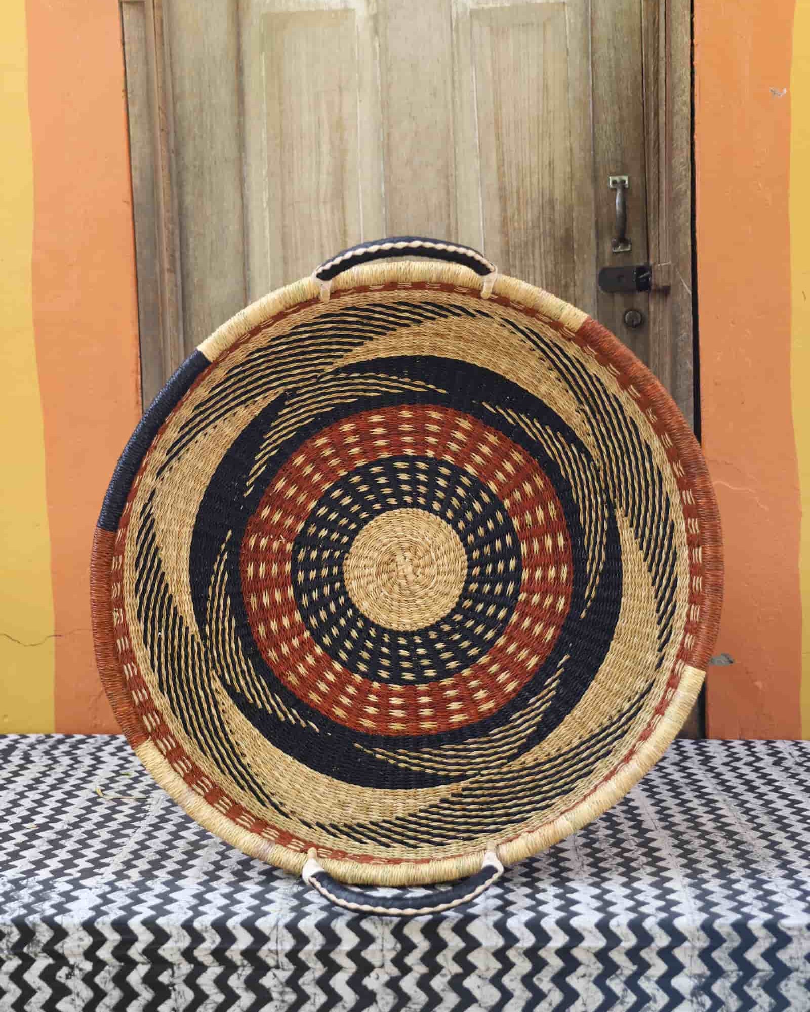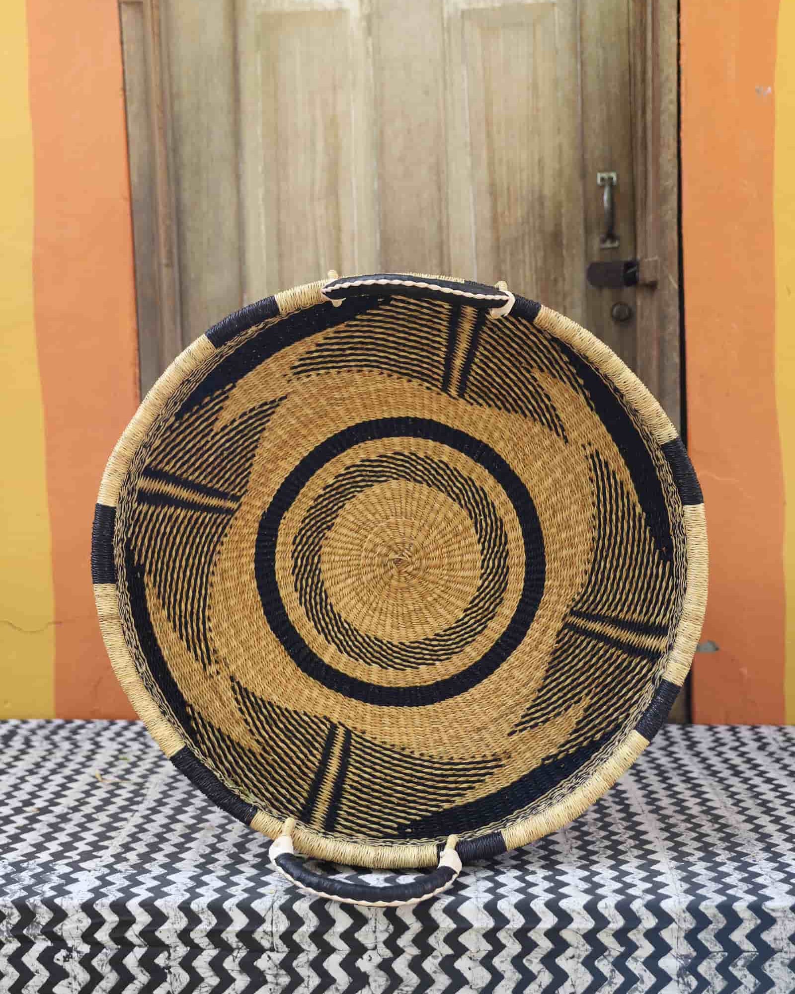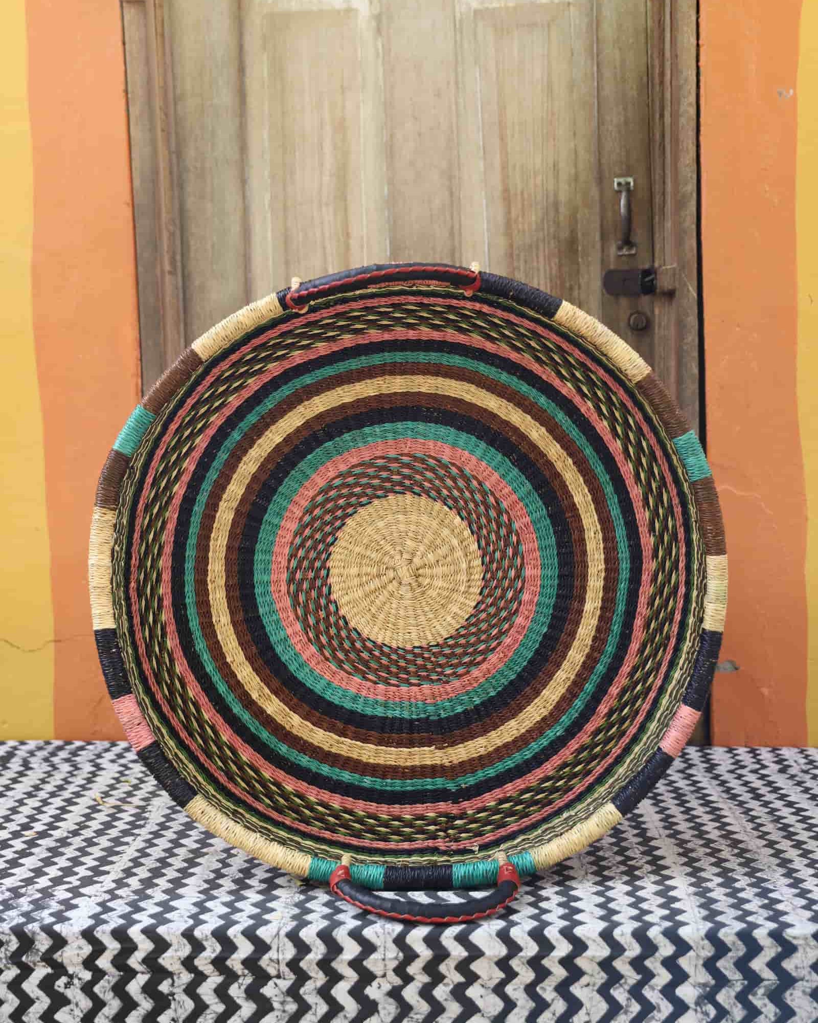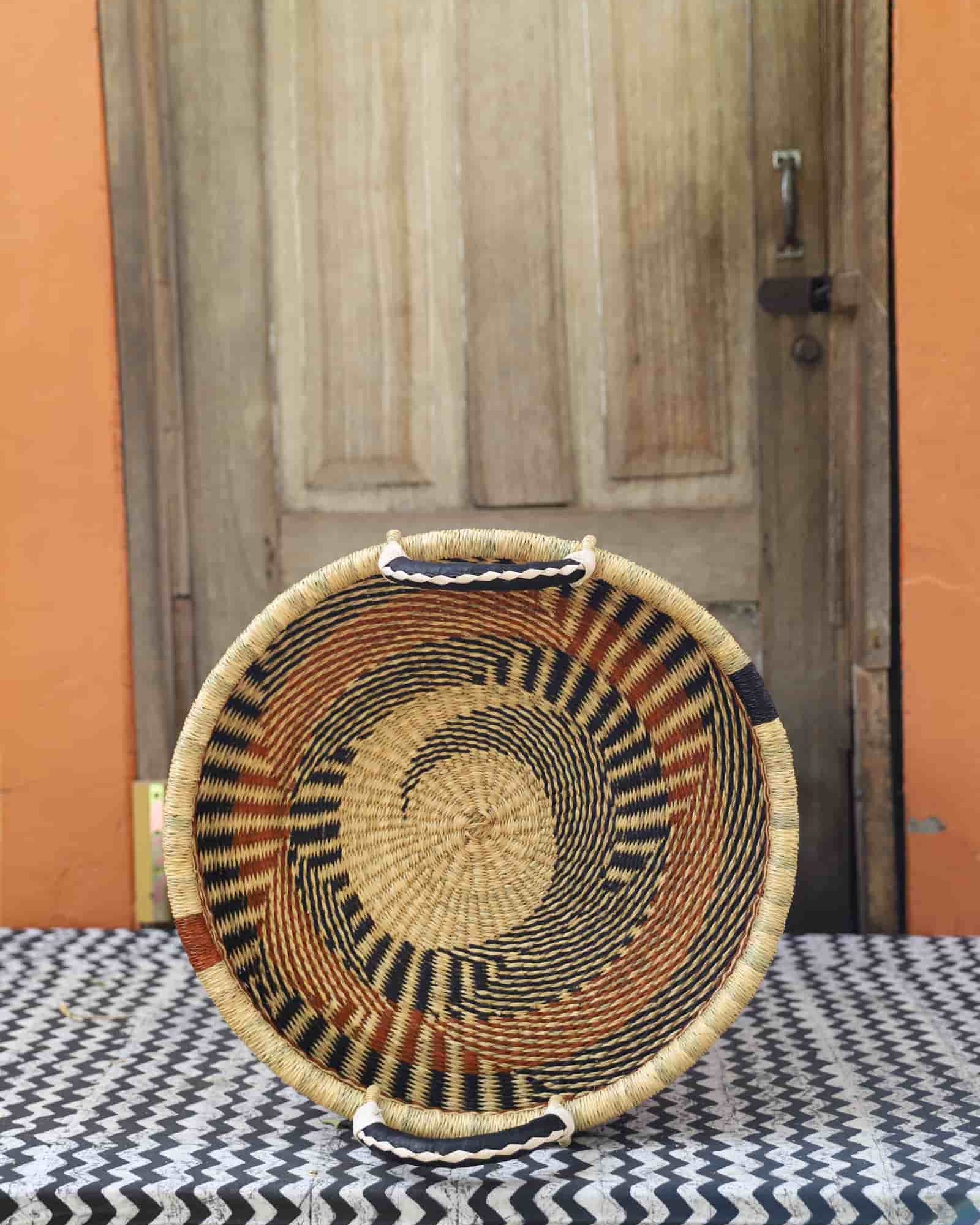 Vous recevrez le plateau tressé présenté sur la photo. Sur nos photos, les plateaux tressés sont présentés par les artisans qui les ont confectionnés.