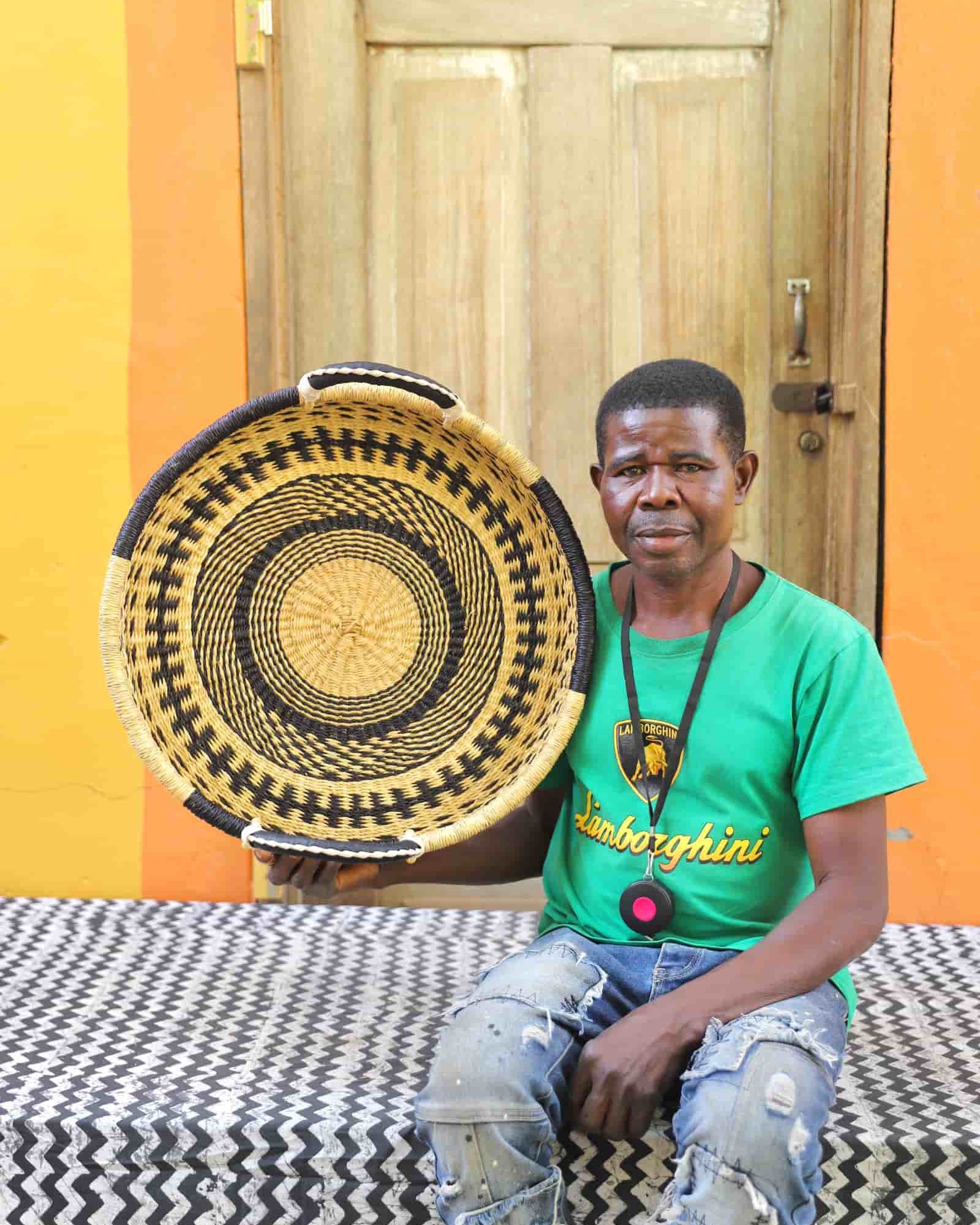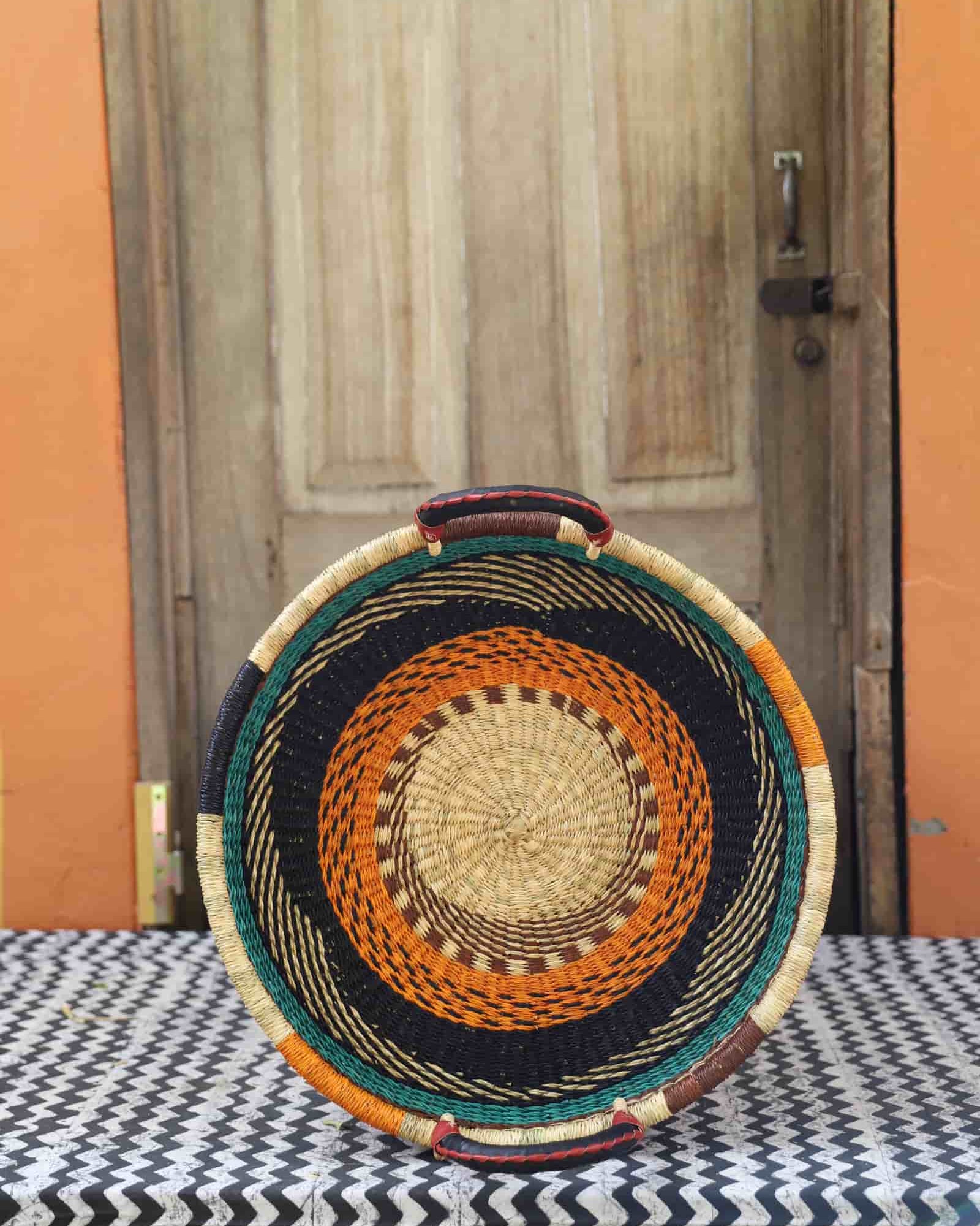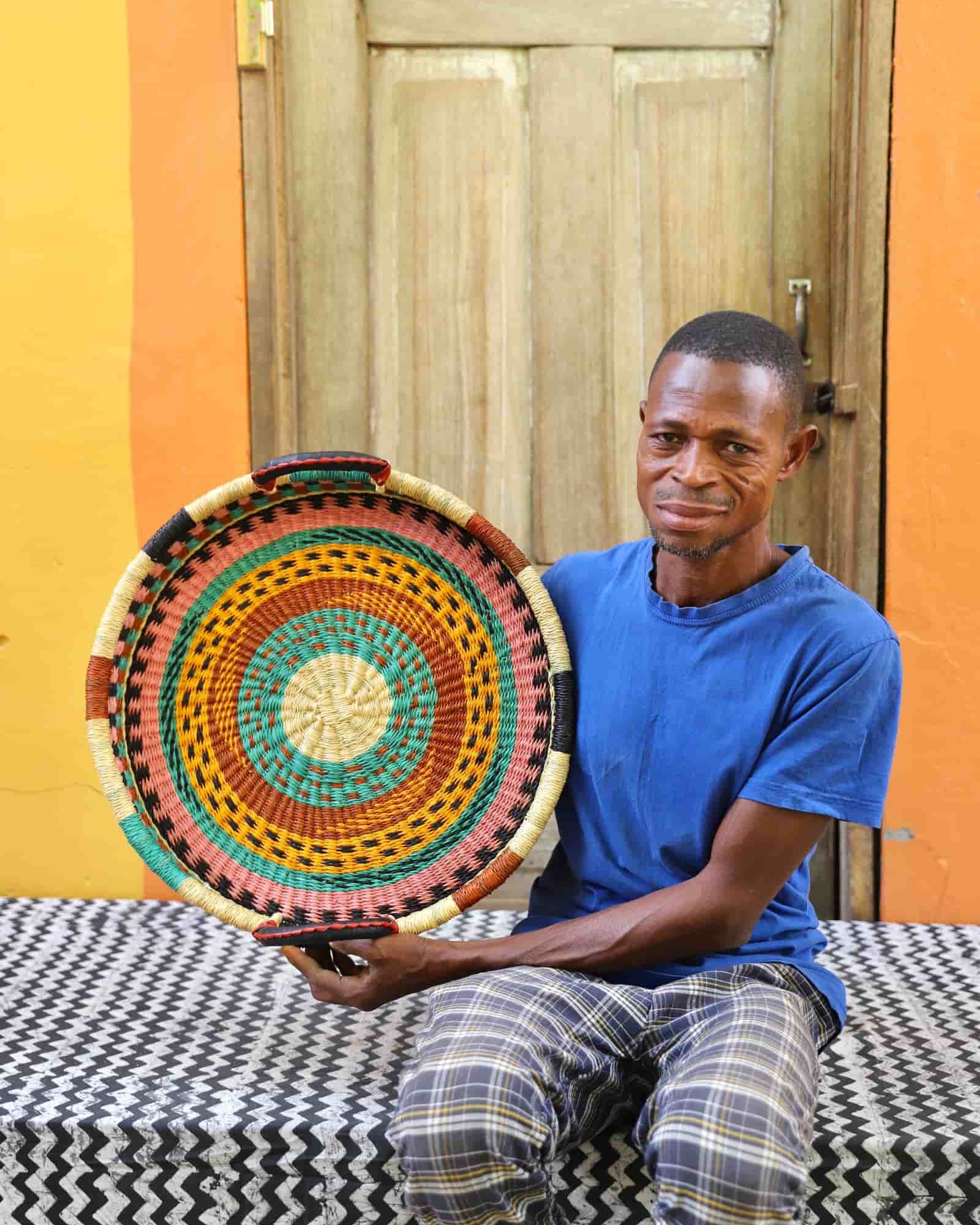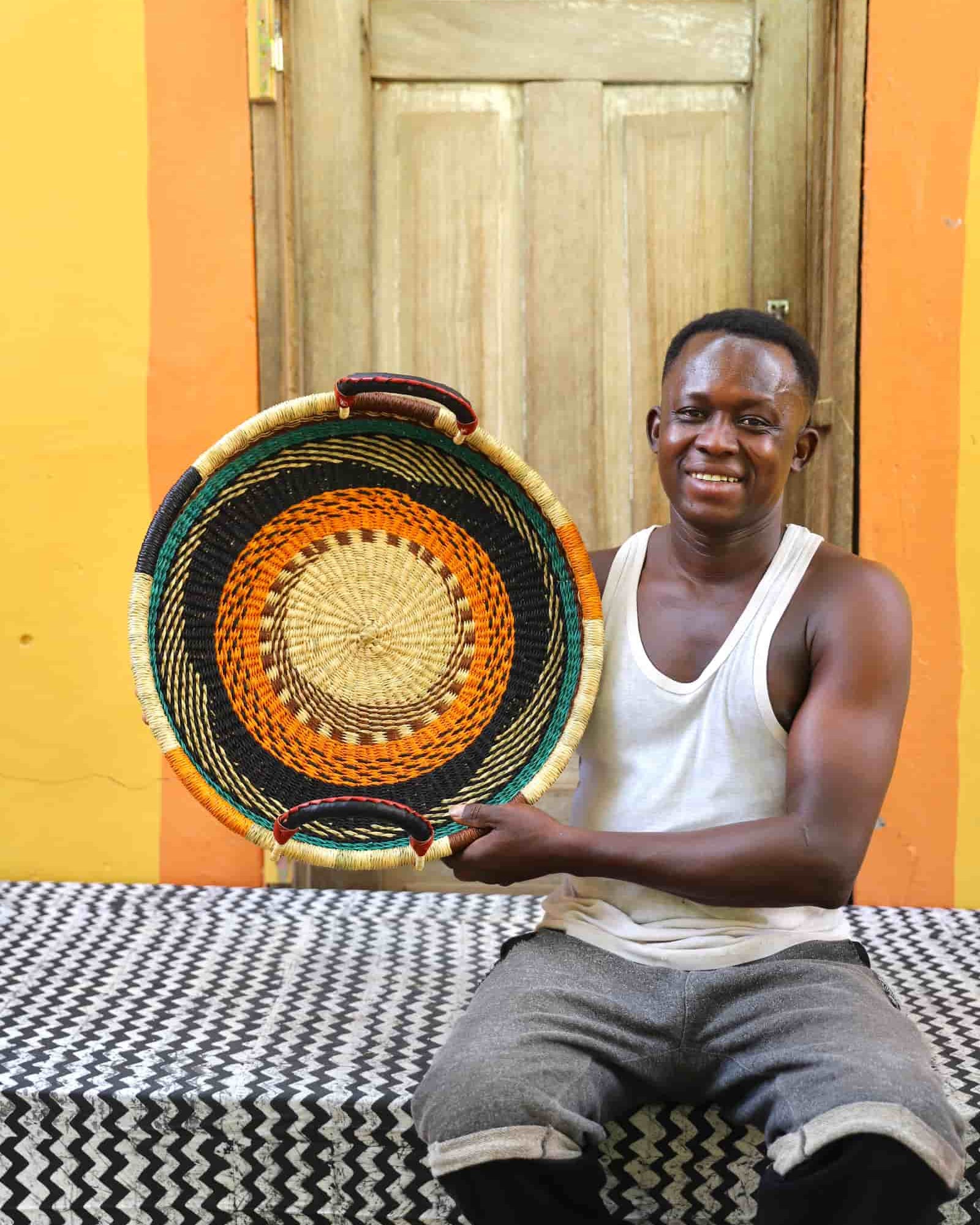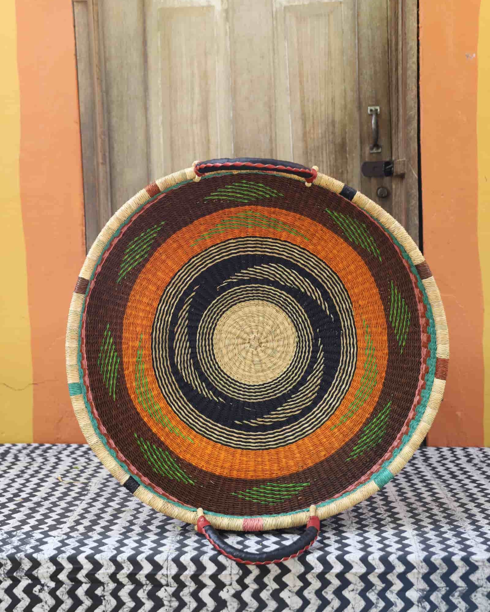 Vous recevrez le plateau tressé présenté sur la photo. Sur nos photos, les plateaux tressés sont présentés par les artisans qui les ont confectionnés.