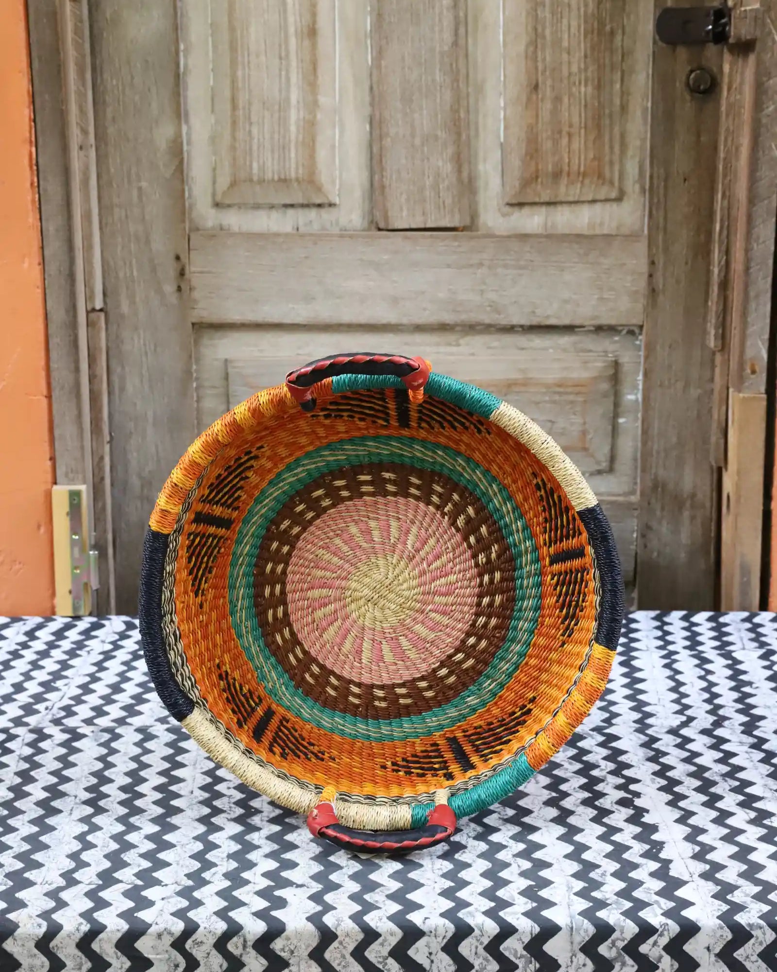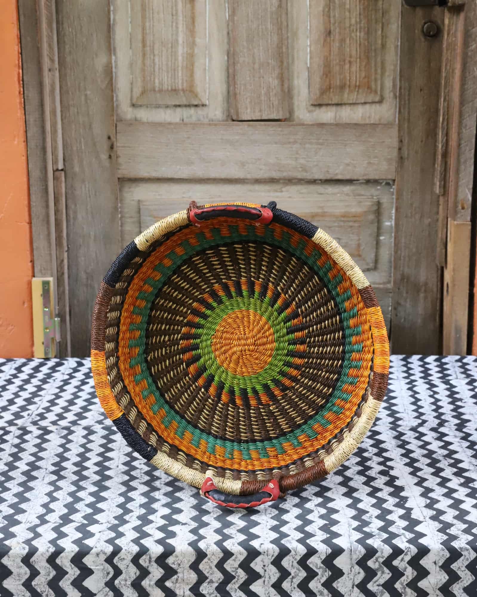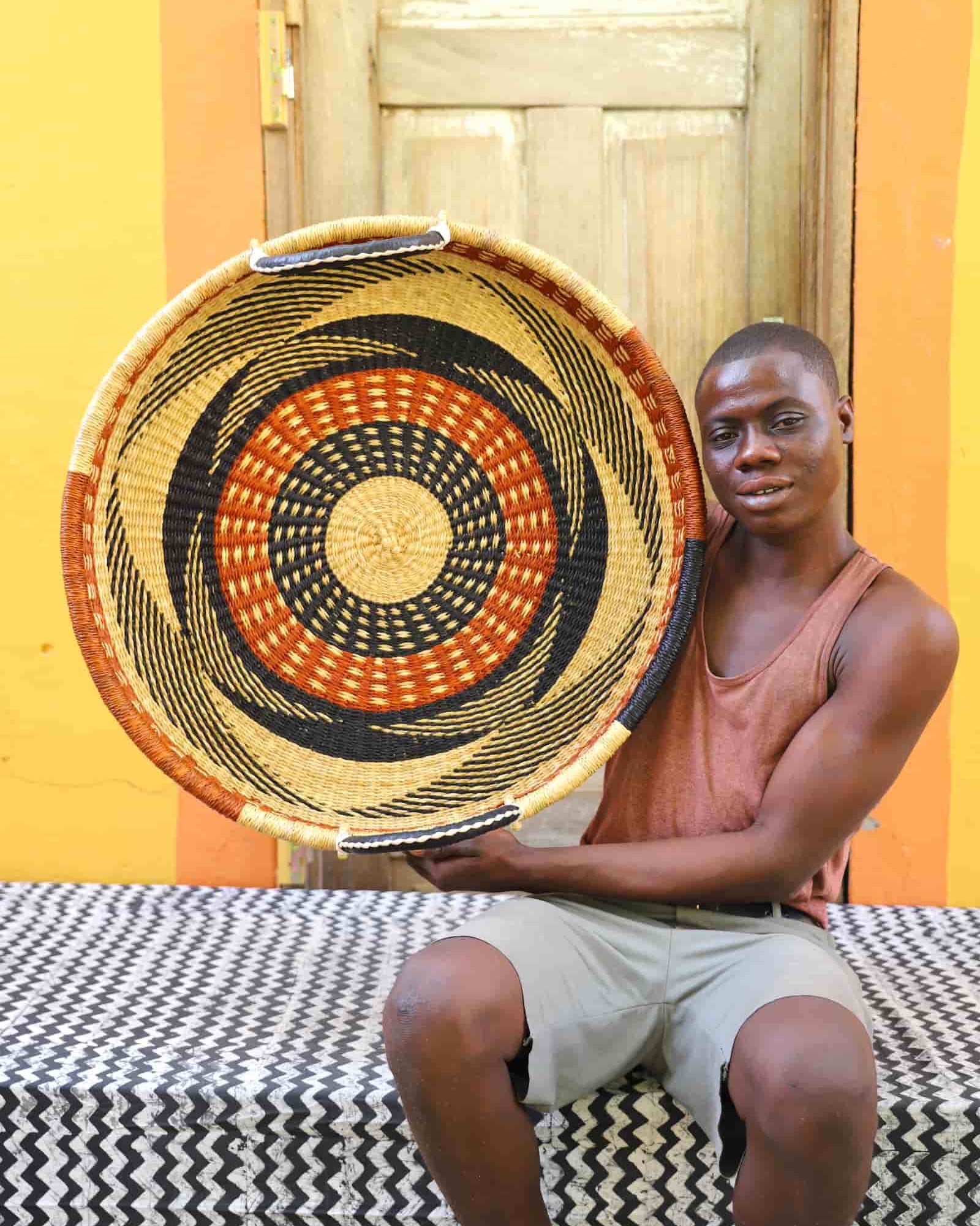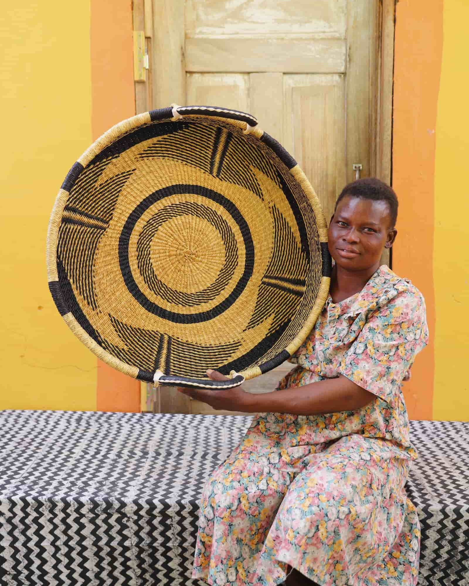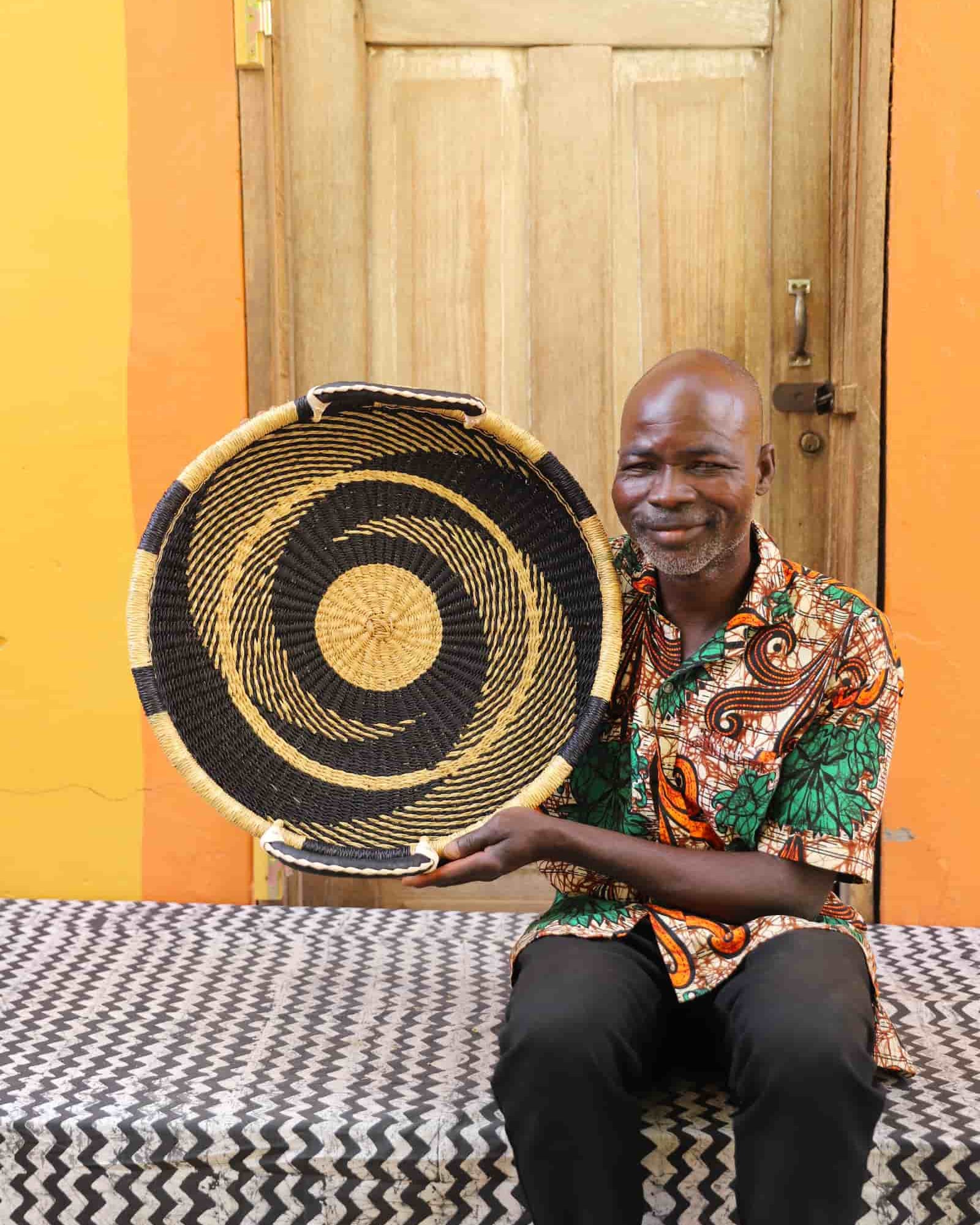 Vous recevrez le plateau tressé présenté sur la photo. Sur nos photos, les plateaux tressés sont présentés par les artisans qui les ont confectionnés.