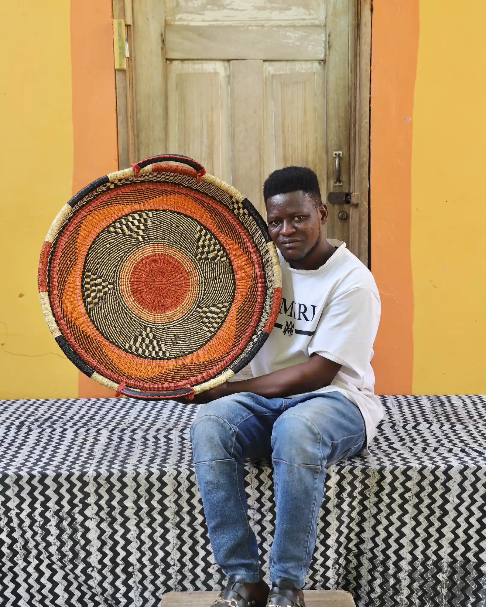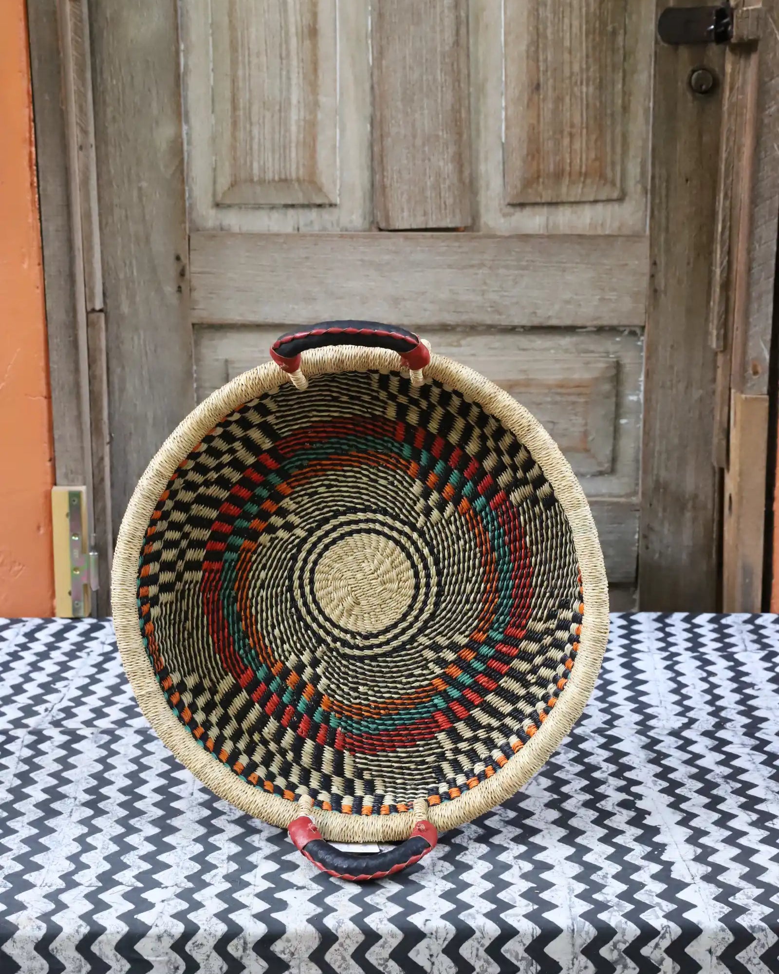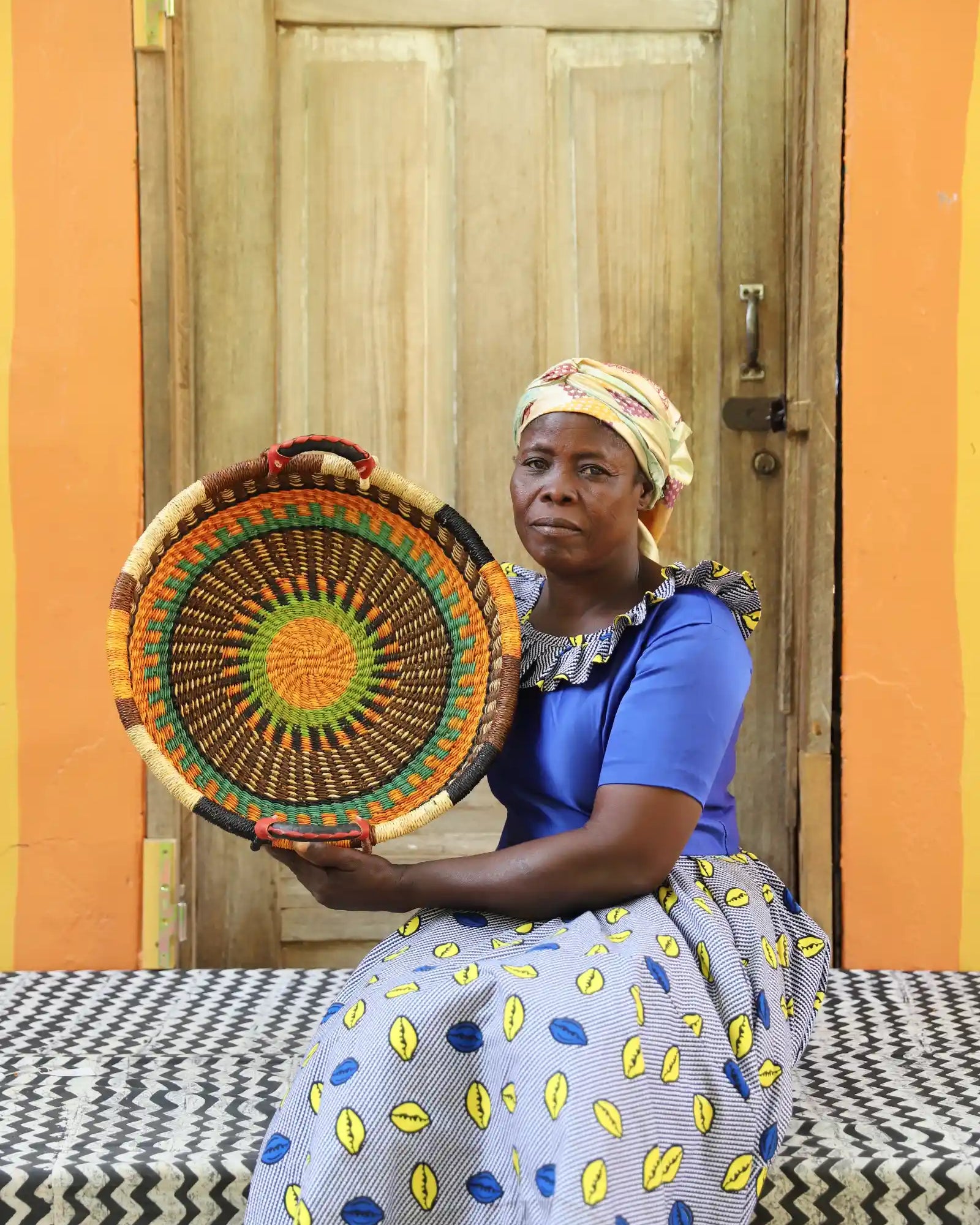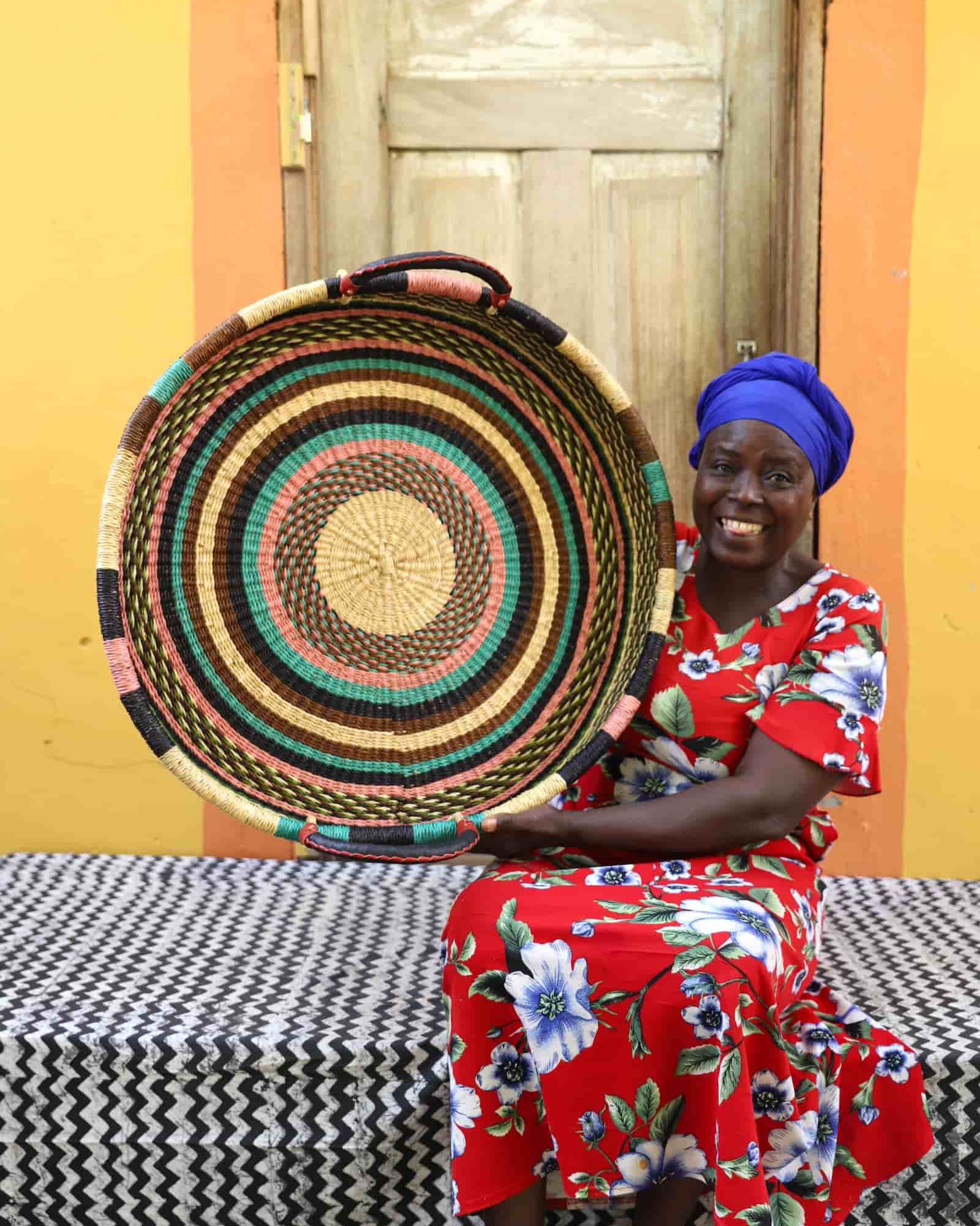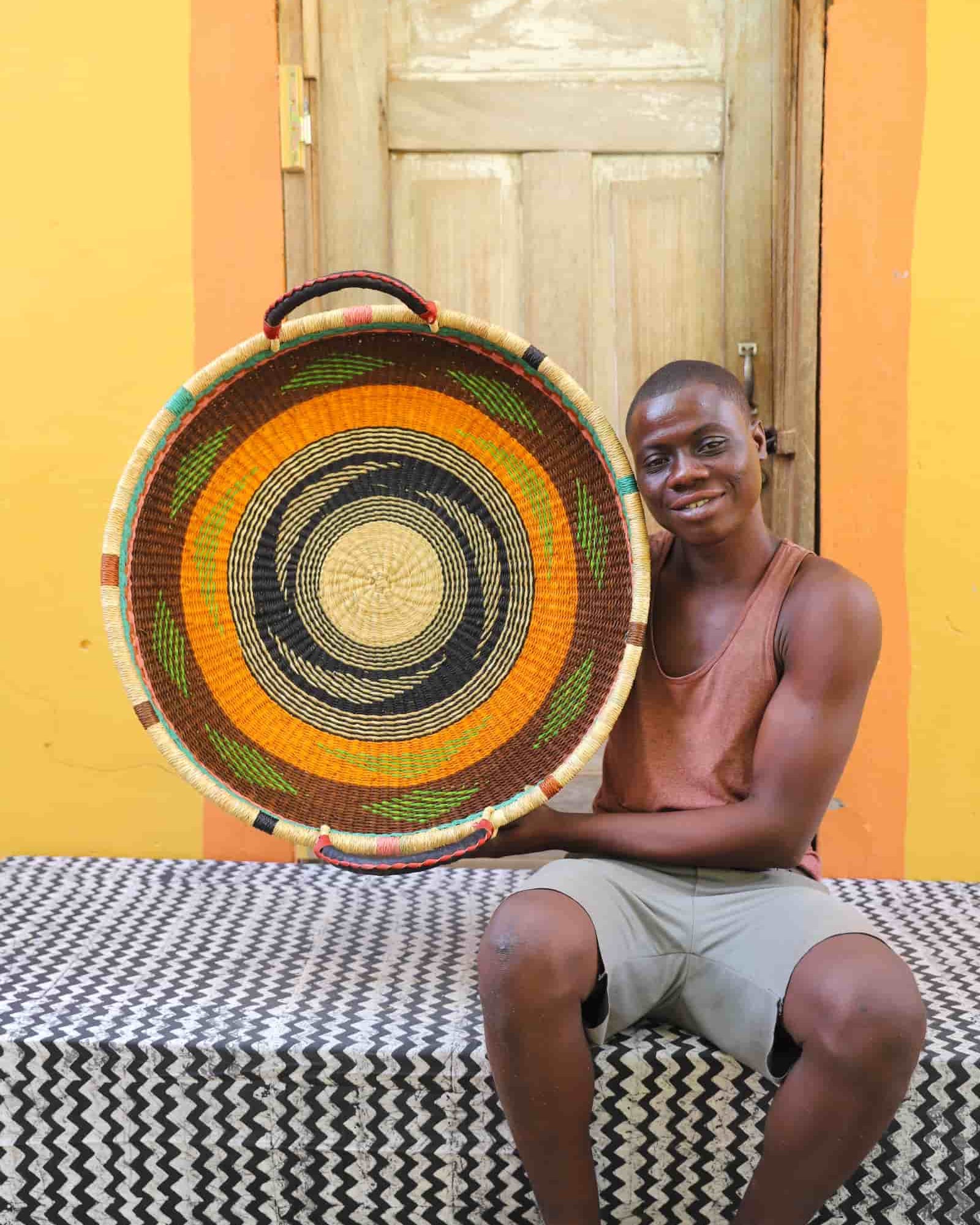 Vous recevrez le plateau tressé présenté sur la photo. Sur nos photos, les plateaux tressés sont présentés par les artisans qui les ont confectionnés.