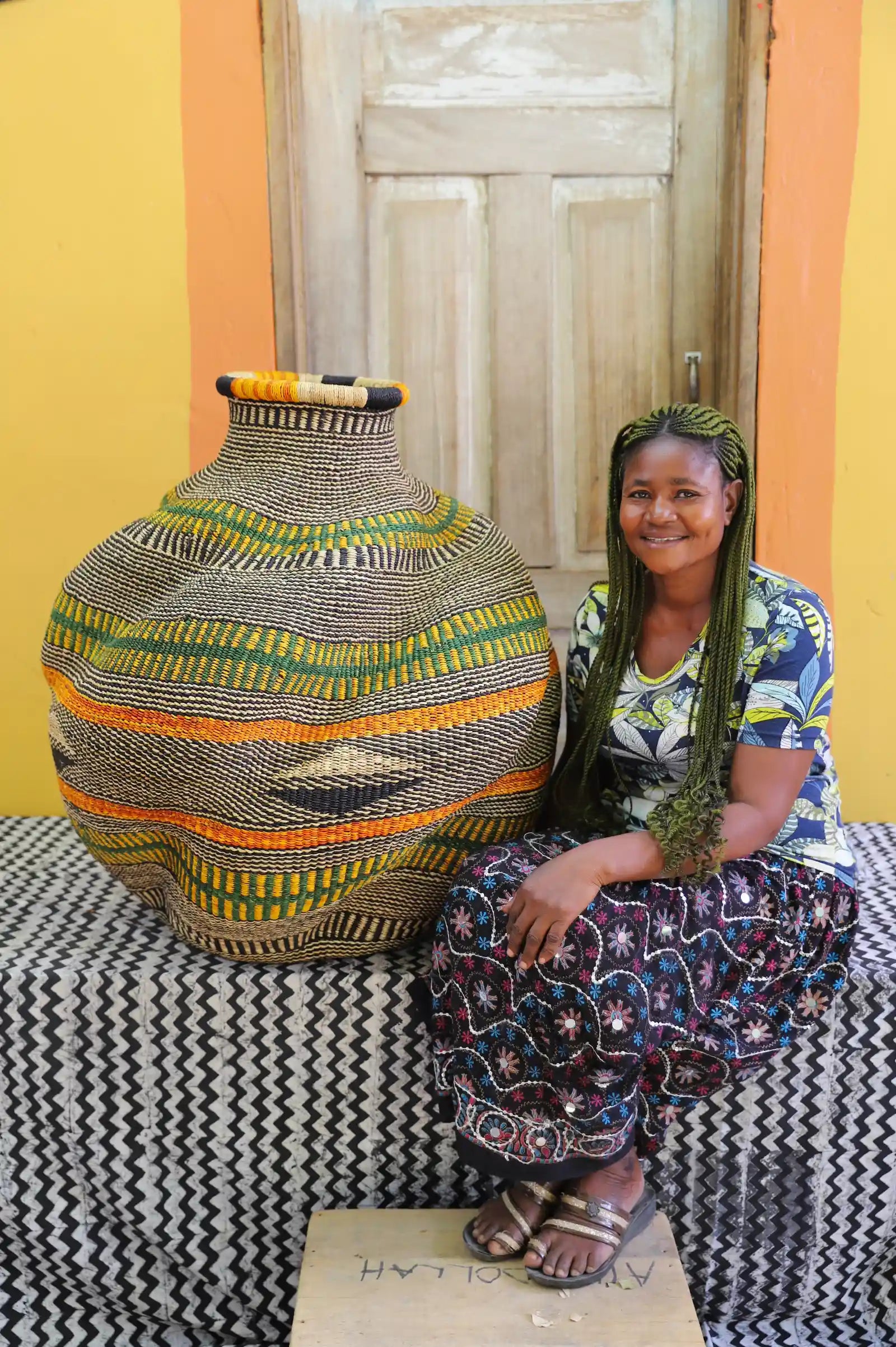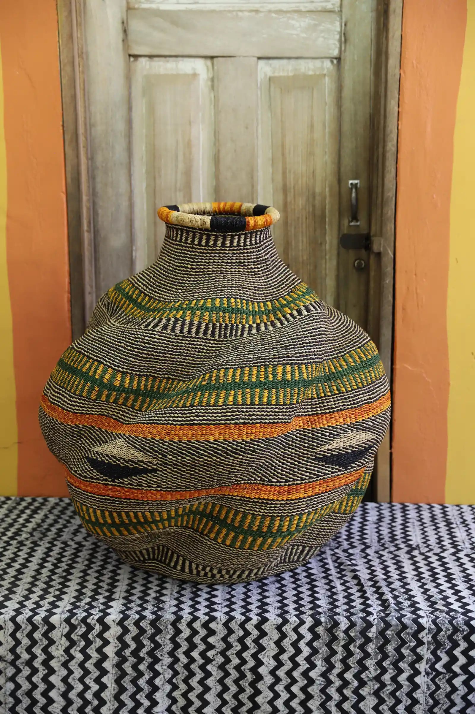 In the Gurune language of Ghana’s Upper East Region, De-engo means ‘a meeting of chiefs.’ These vibrant gatherings are filled with color, conversation, music, and dance. Our artisan weaver beautifully captures this spirit in the basket’s twisting form and striking use of color. Exclusive to The Baba Tree, this one-of-a-kind piece is perfect for the discerning collector.